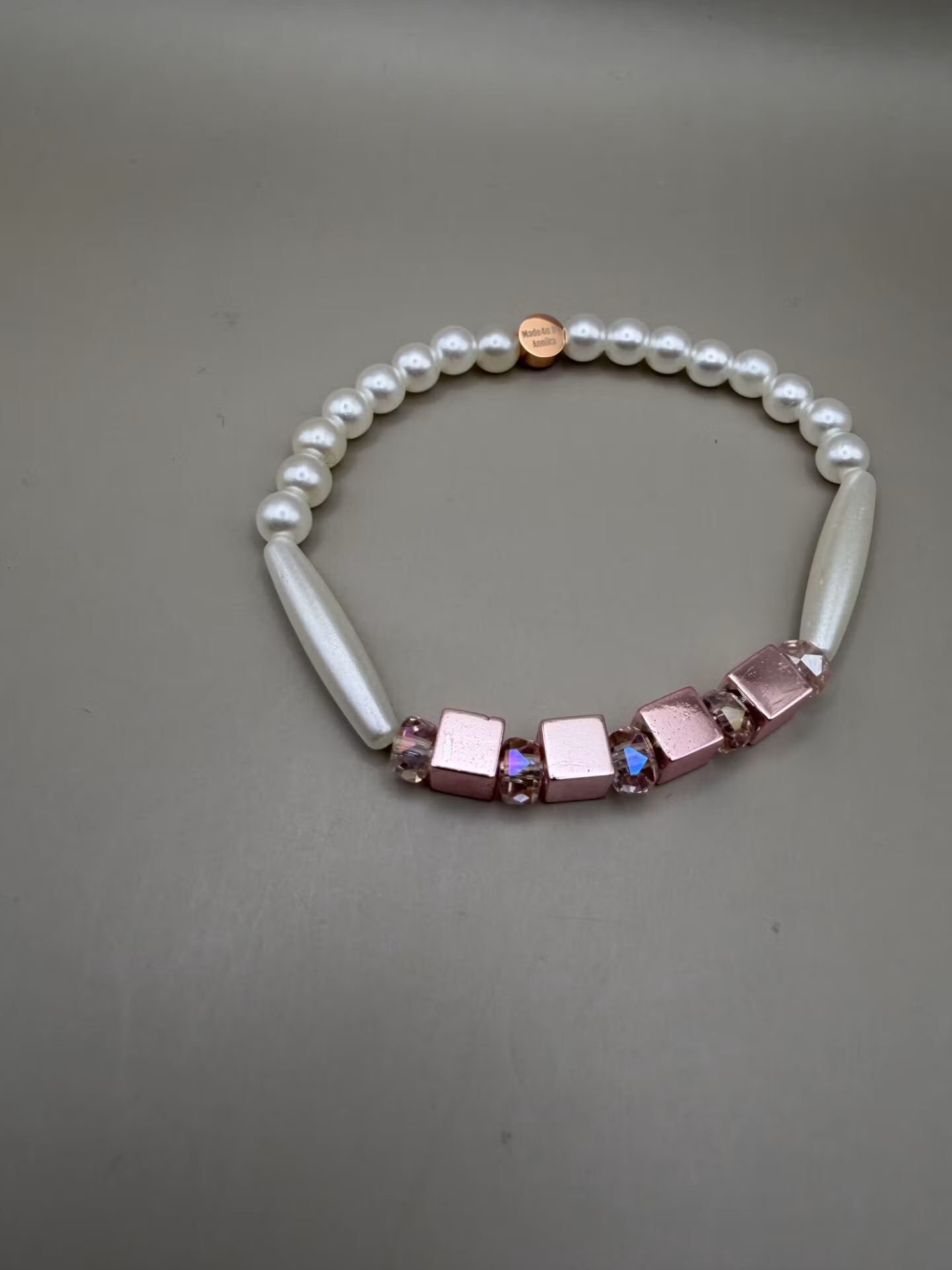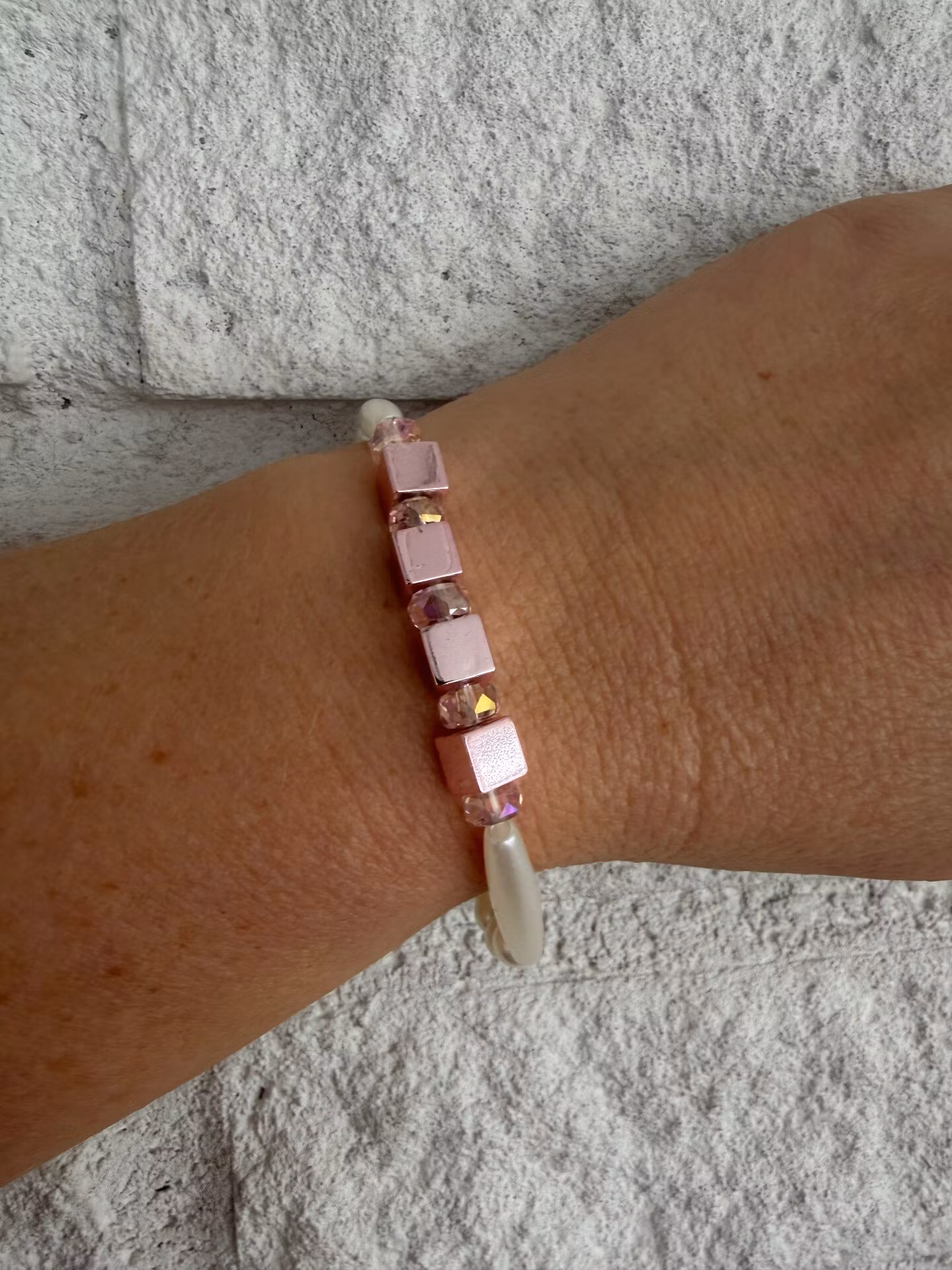 Ett elegant armband med blanka elfenbensvita pärlor – stora, runda och avlånga – harmoniskt kombinerade med fyrkantiga roséfärgade hematit pärlor i spegelblank finish. Smycket avslutas med min unika signaturpärla.