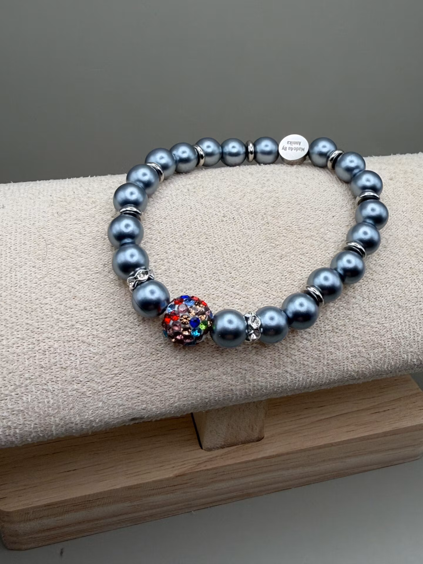 Elegant armband med mörkgrå-silverfärgade pärlor varvat med silverfärgade brickor i rostfritt stål och flerfärgad strassboll i blickfånget. Smycket avslutas med min unika signaturpärla.