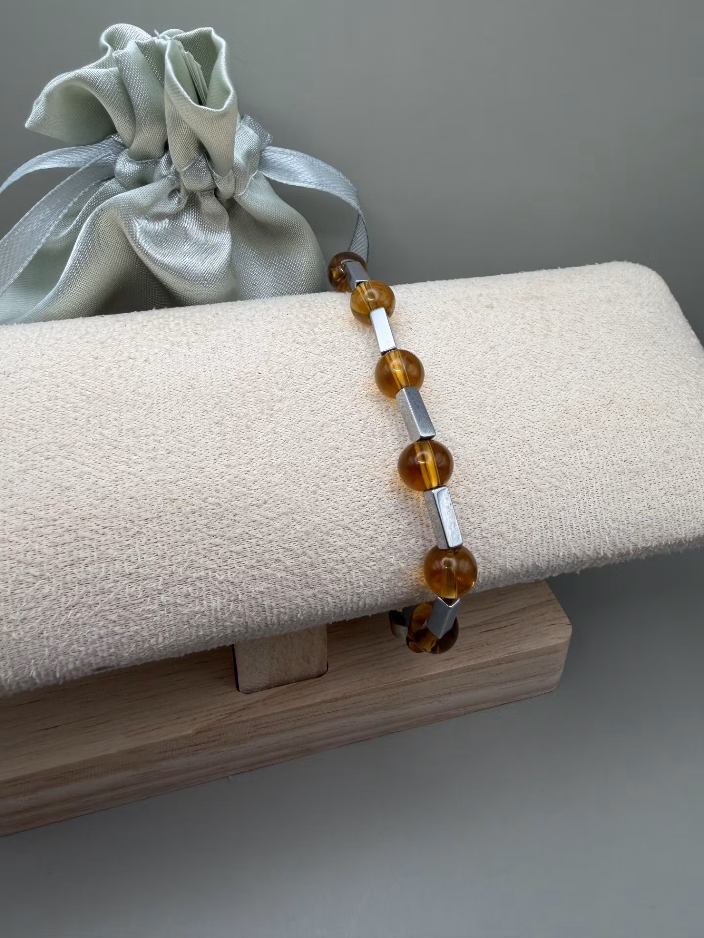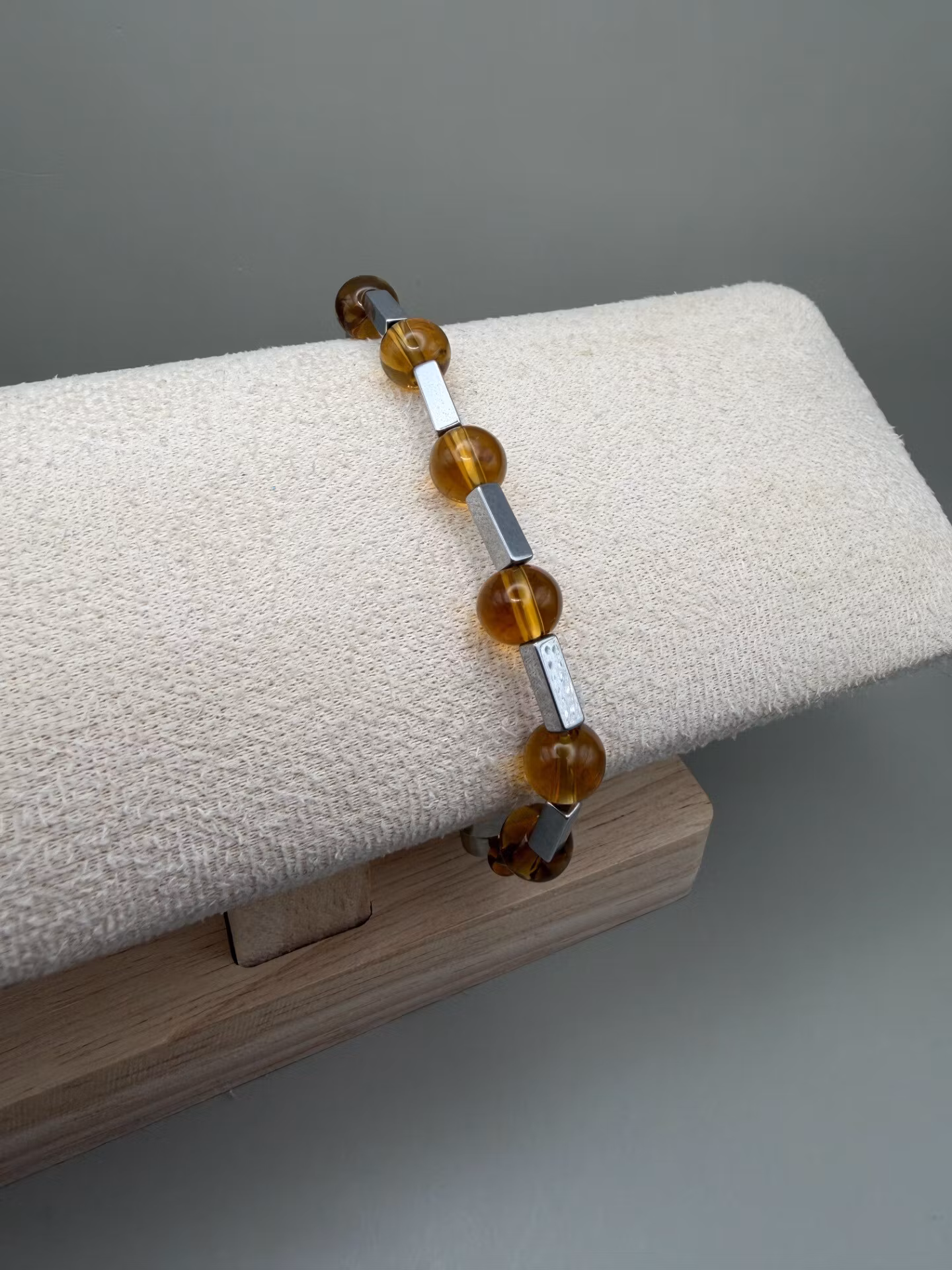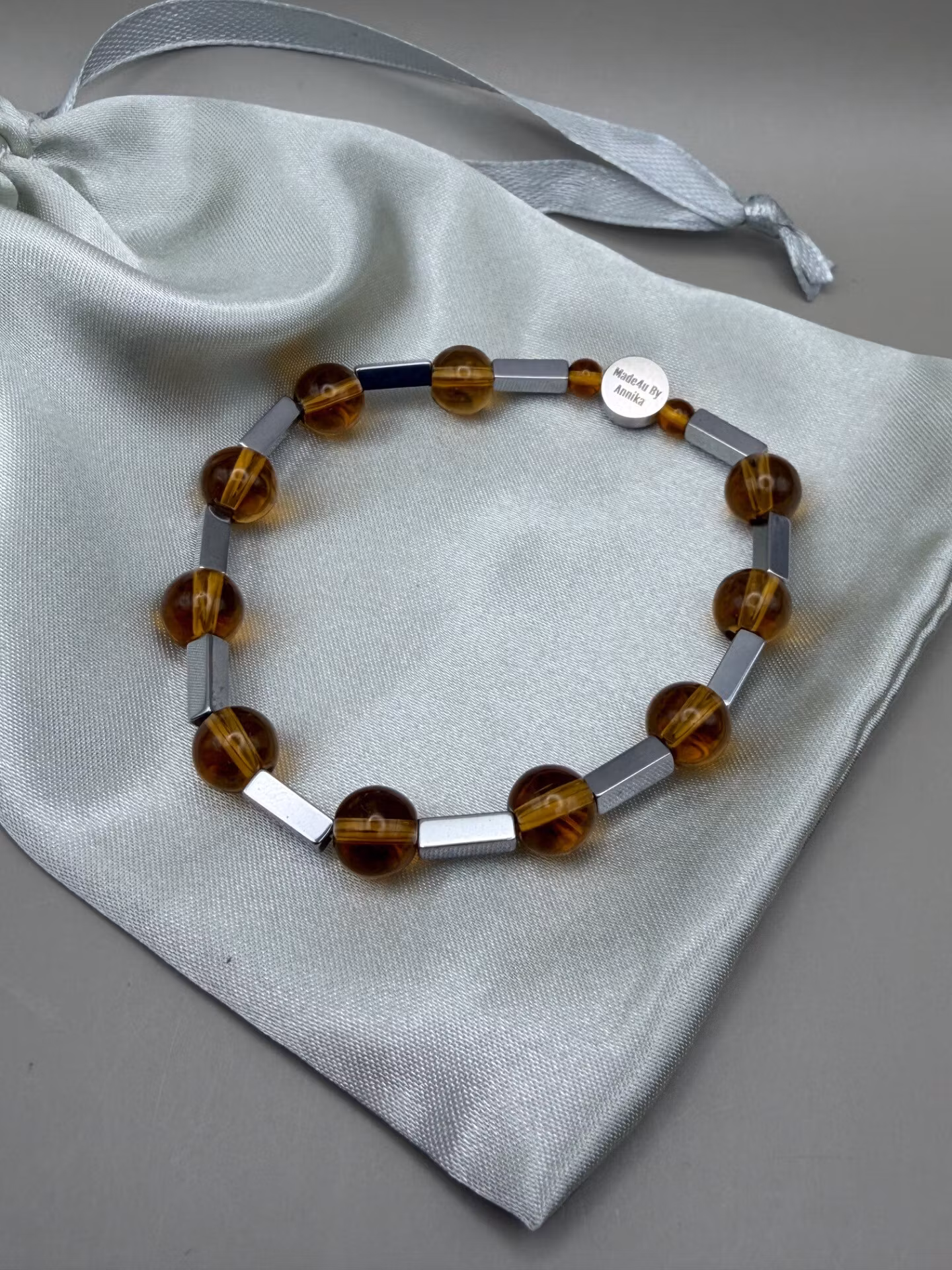 Elegant armband med bärnstensfärgade pärlor varvat med stålgrå avlånga kantiga hematitpärlor. Smycket avslutas med min unika signaturpärla.