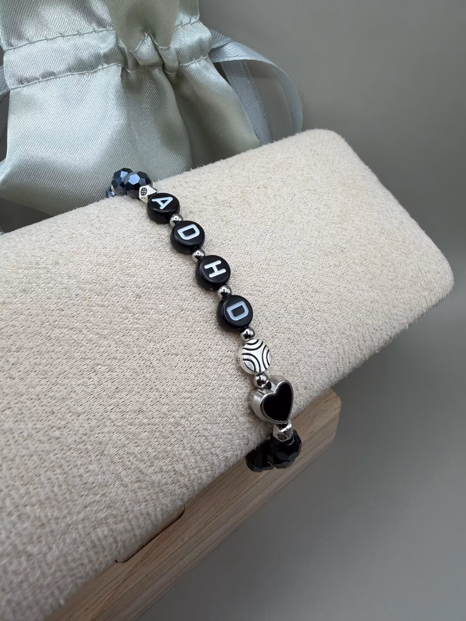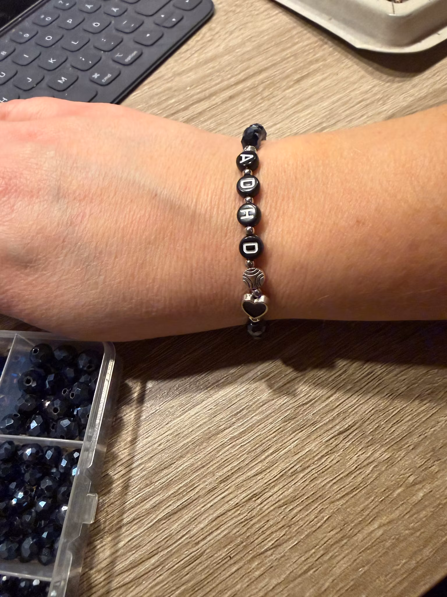 Armband med budskapet ADHD – midnattsblå spegelblanka glaskristallpärlor varvade med små silverfärgade distanser och ett hjärta.