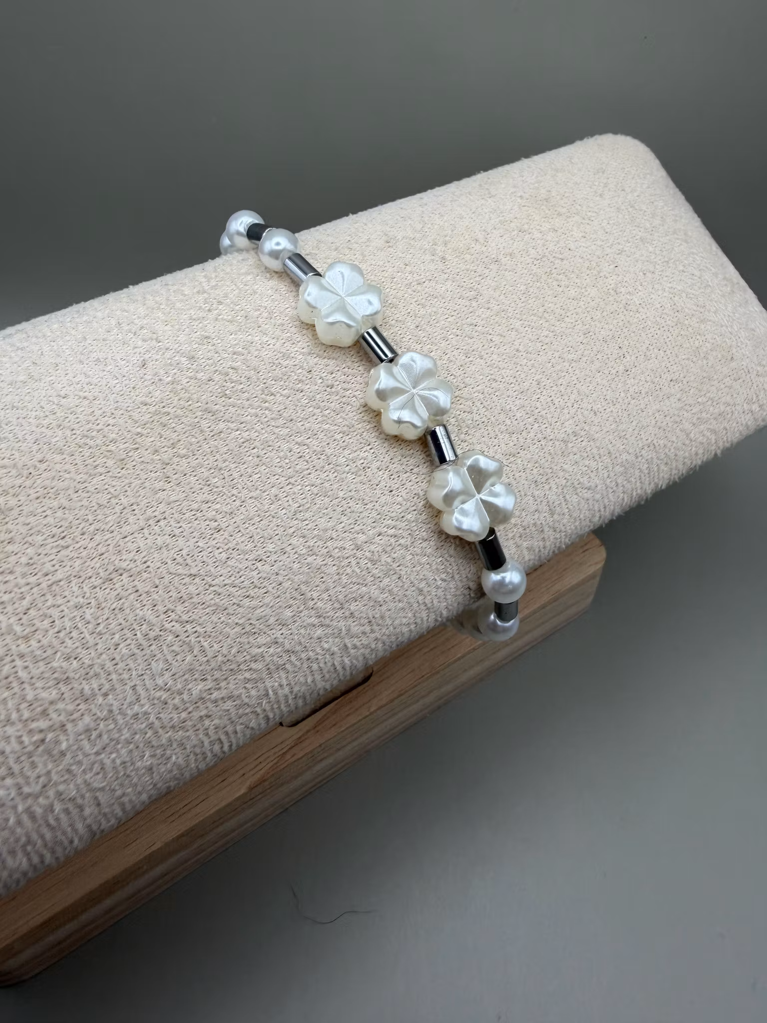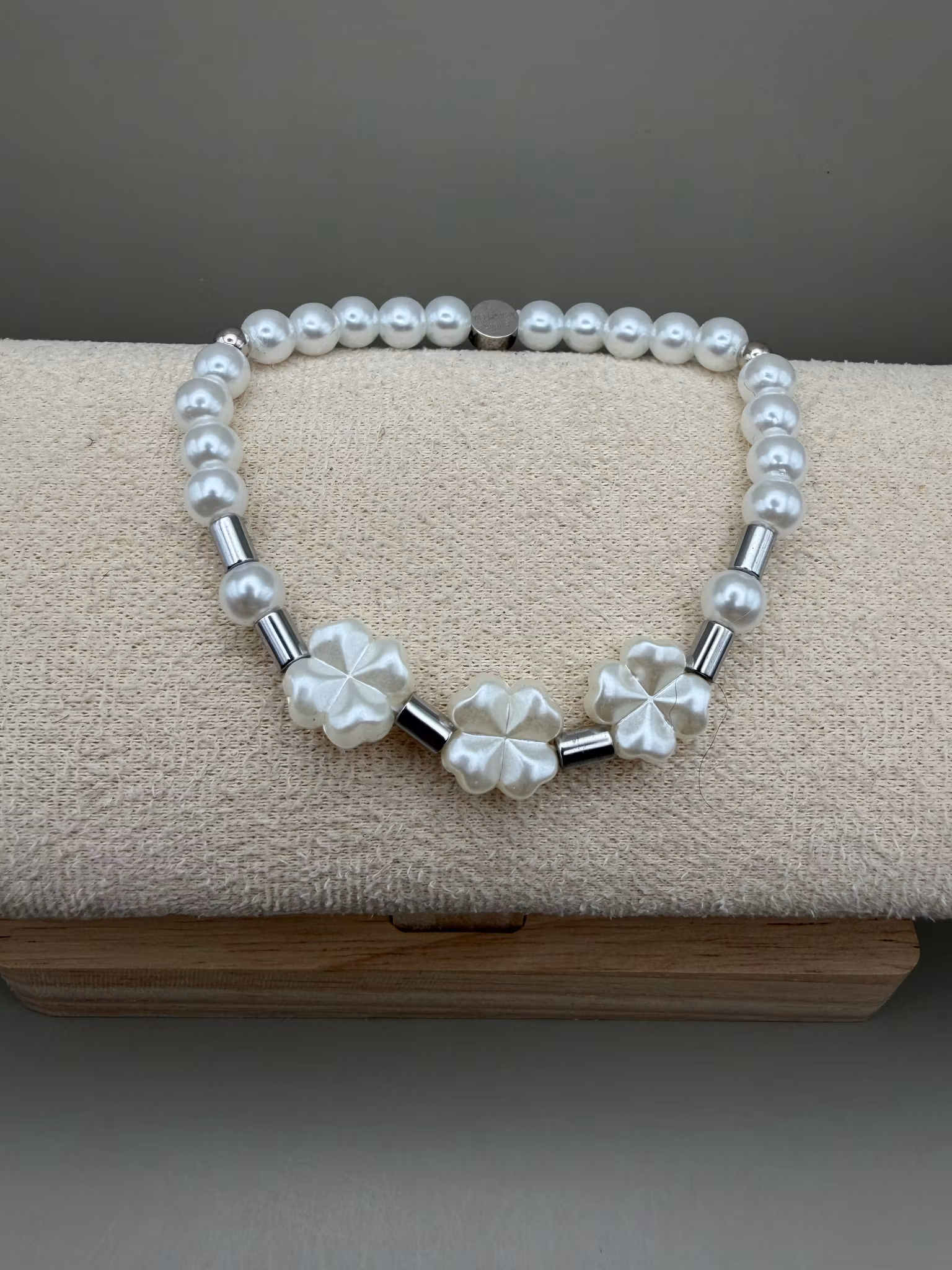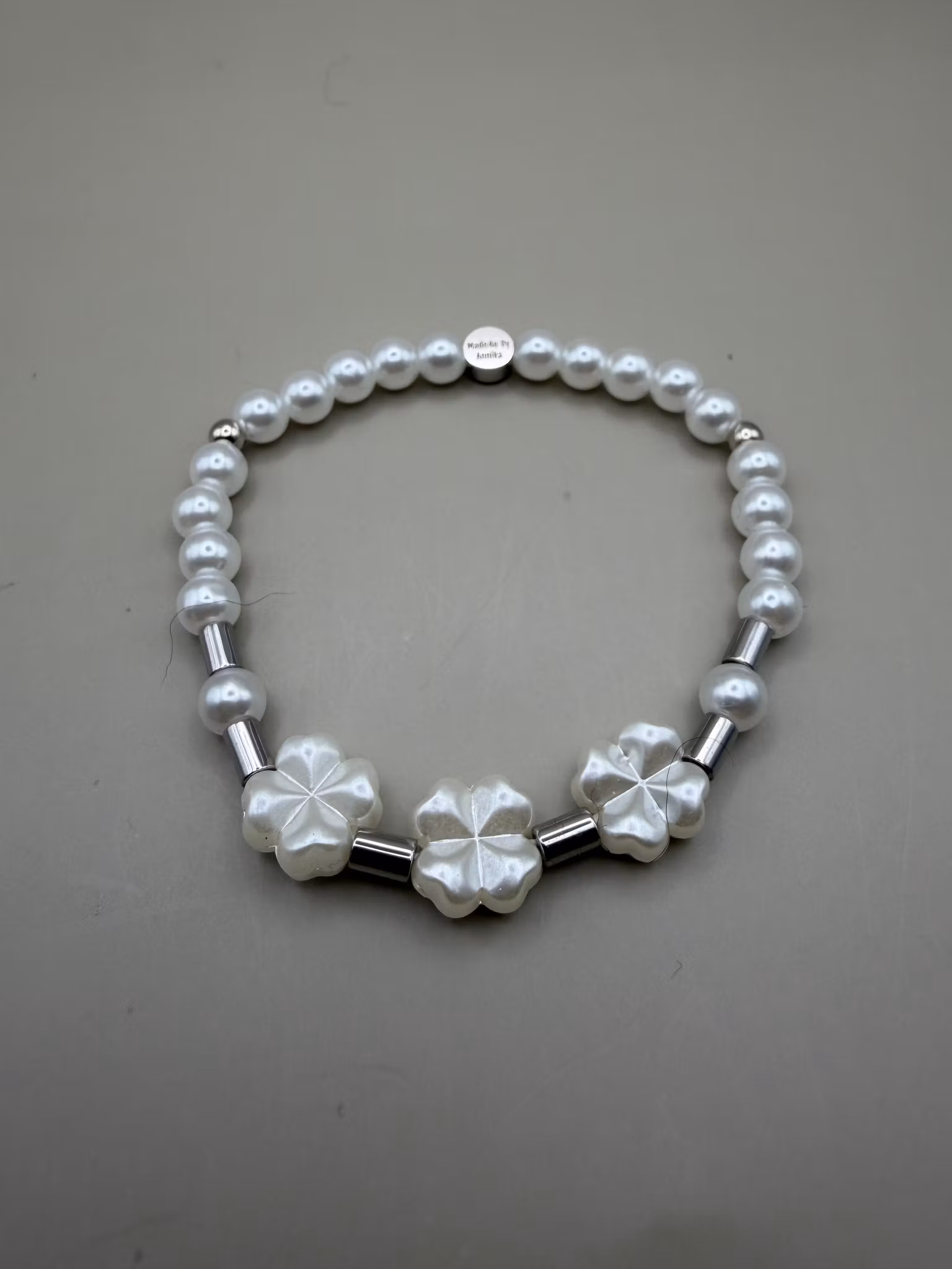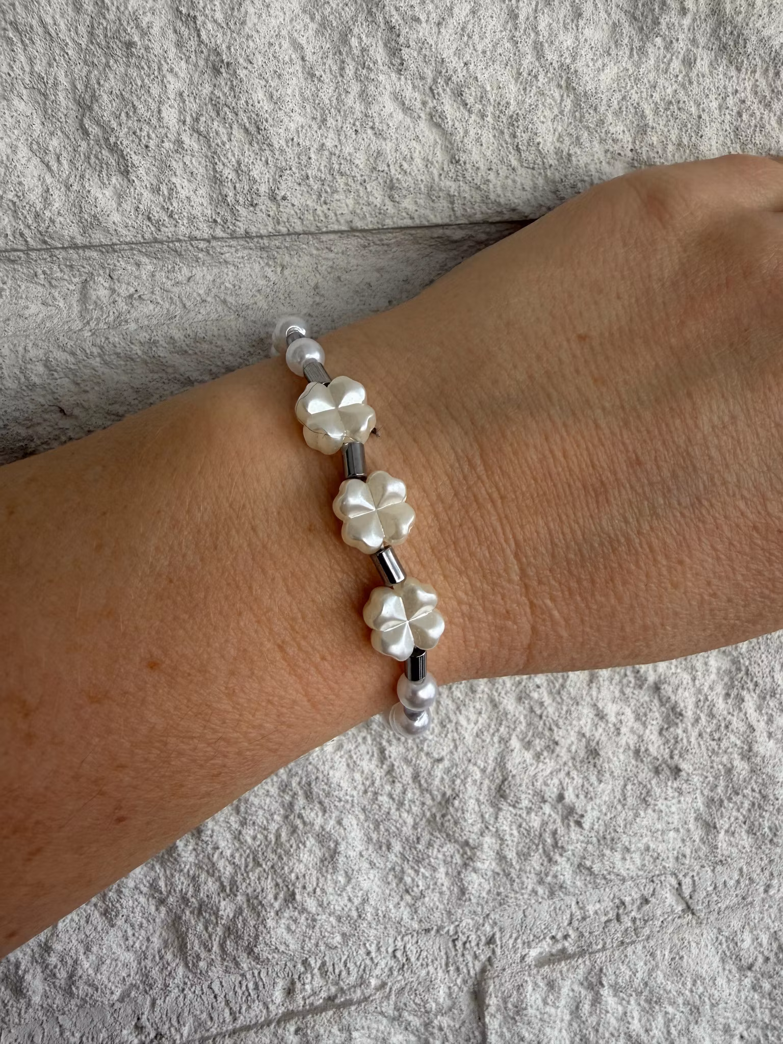 Ett elegant armband i kritvita pärlor med tre fyrklöver som vackert ramar in handleden, varvat med avlånga hematitpärlor i stålfärg. Avslutas med min signaturpä