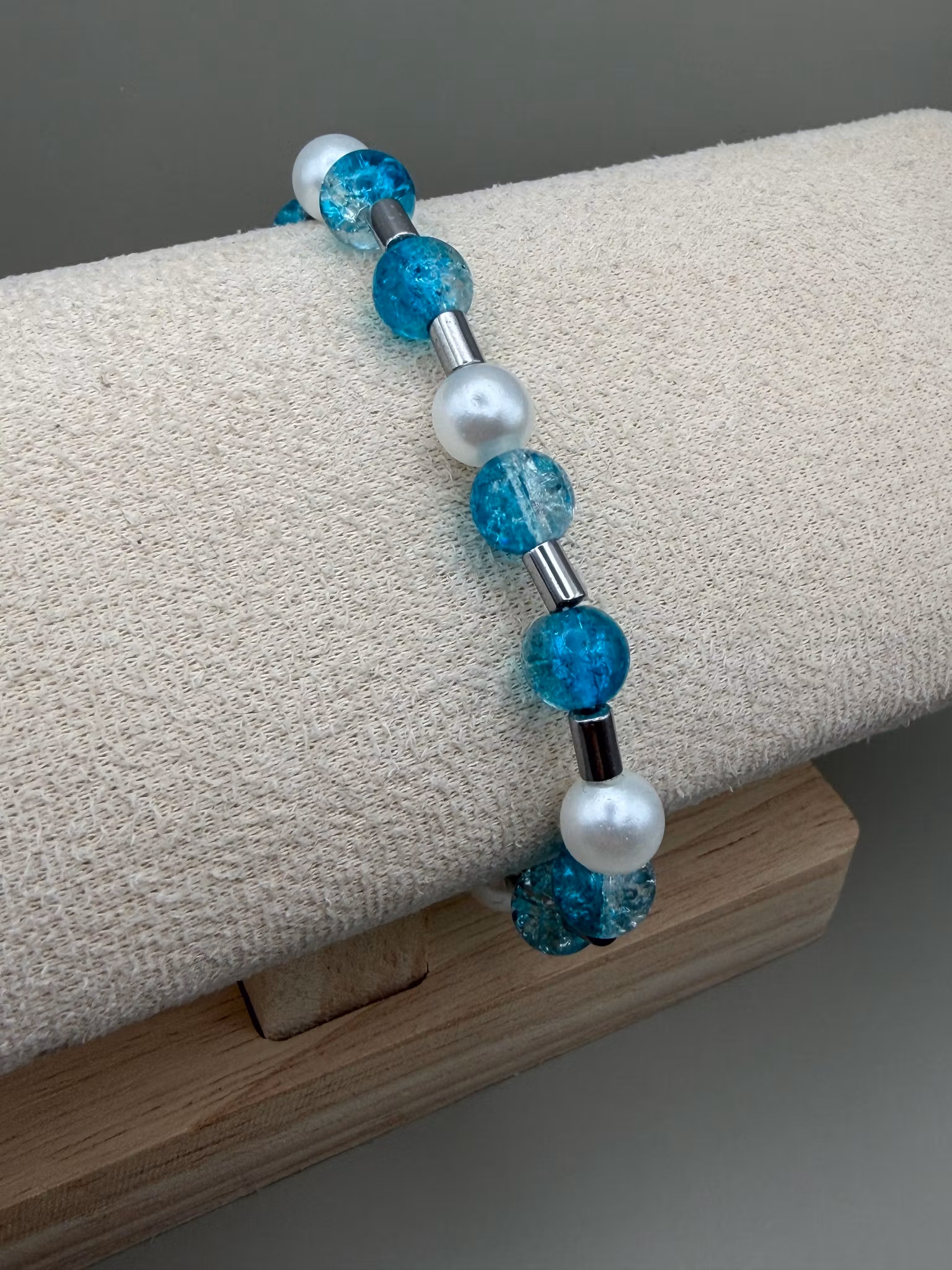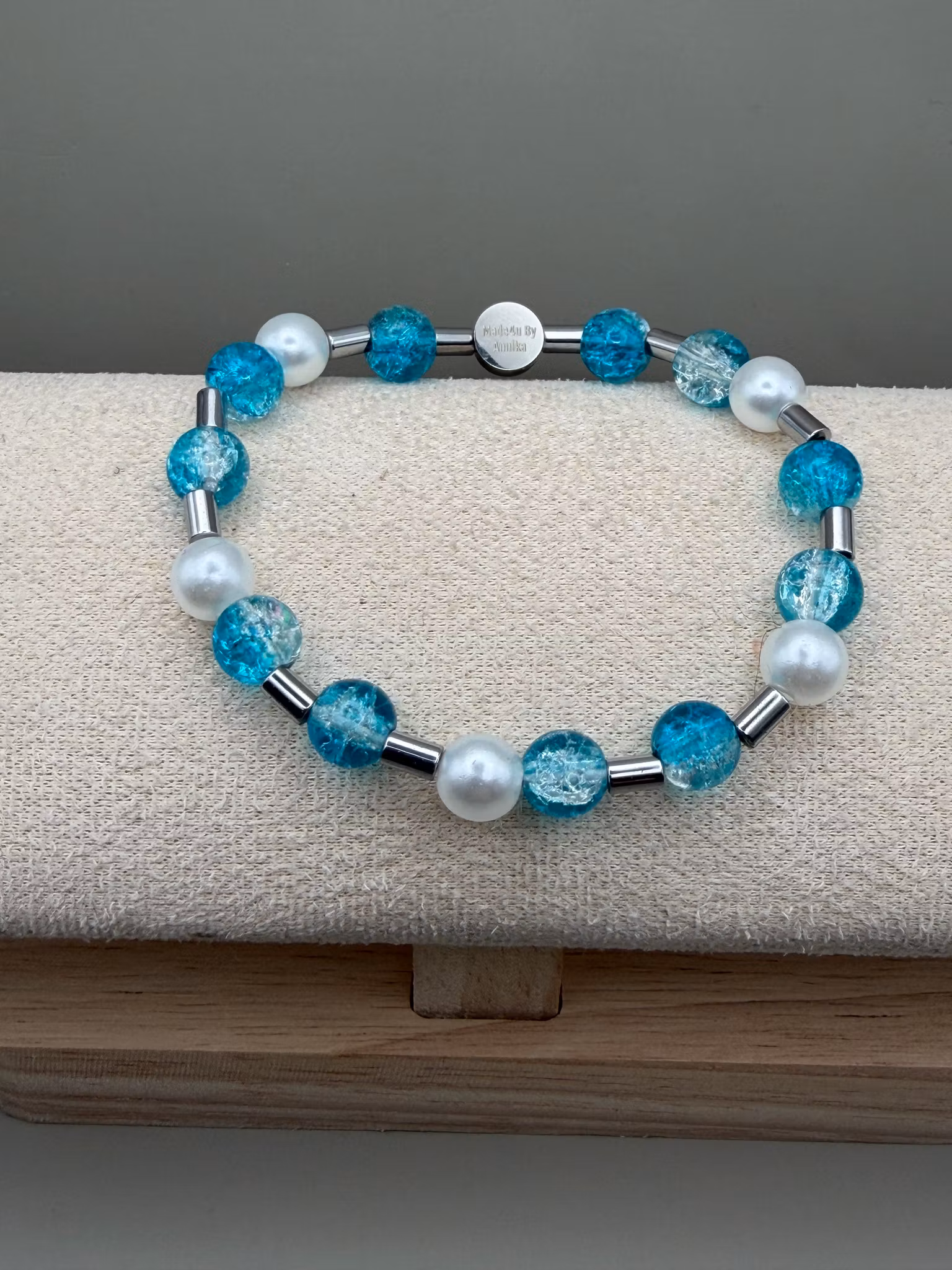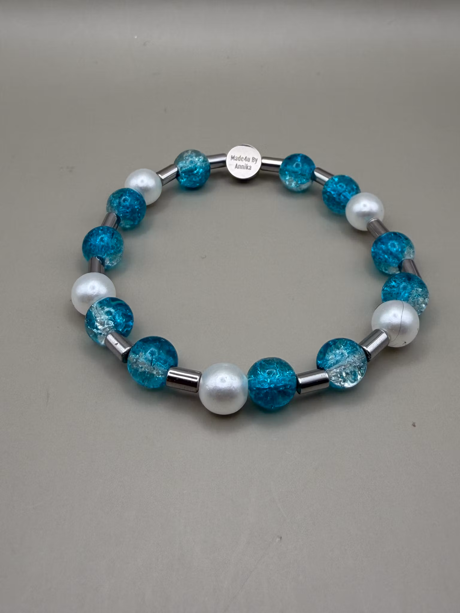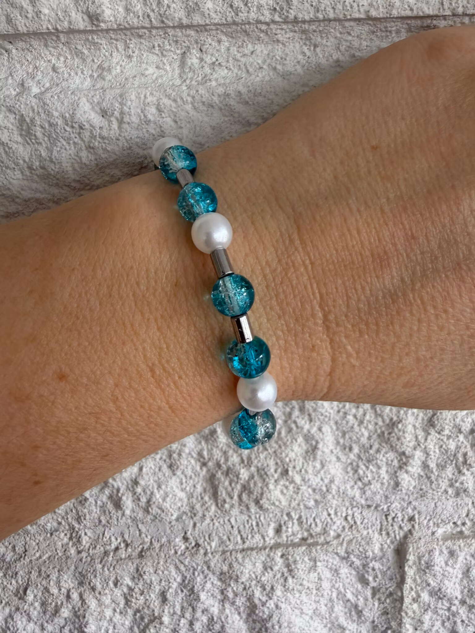 Elegant armband med en harmonisk mix av turkosblå glaspärlor och kritvita pärlor, prytt med min unika signaturpärla.Pärlor: 8mm