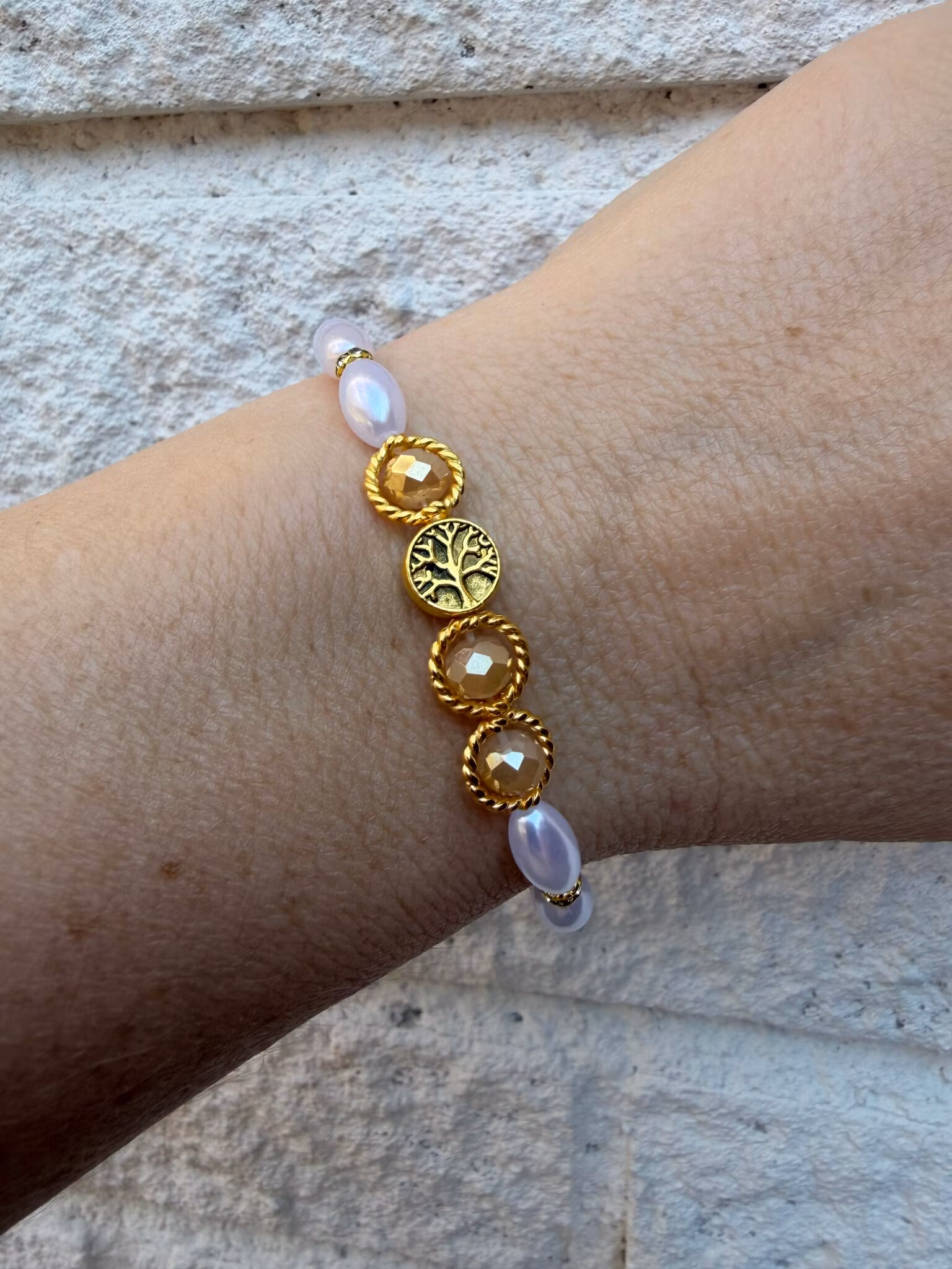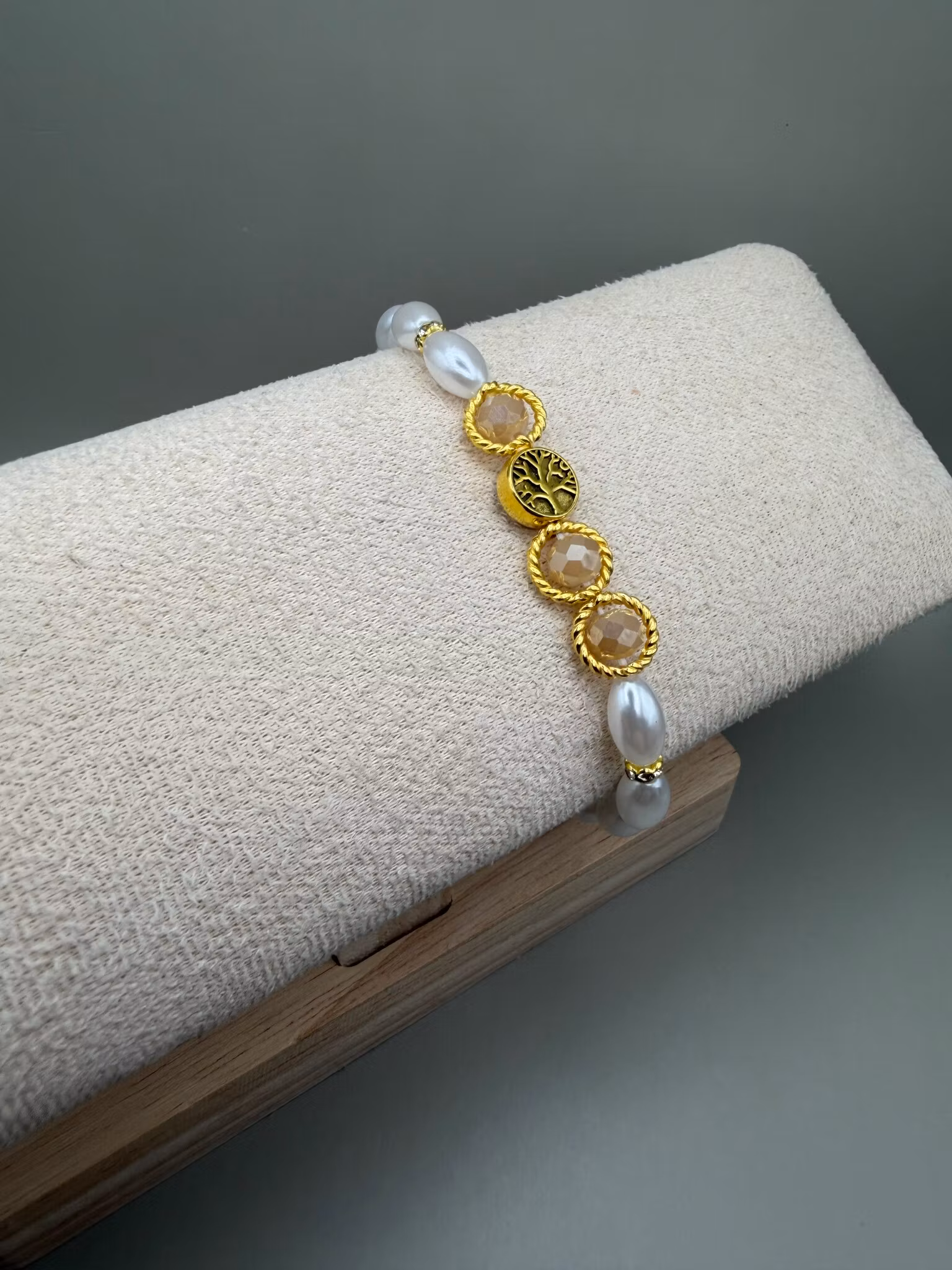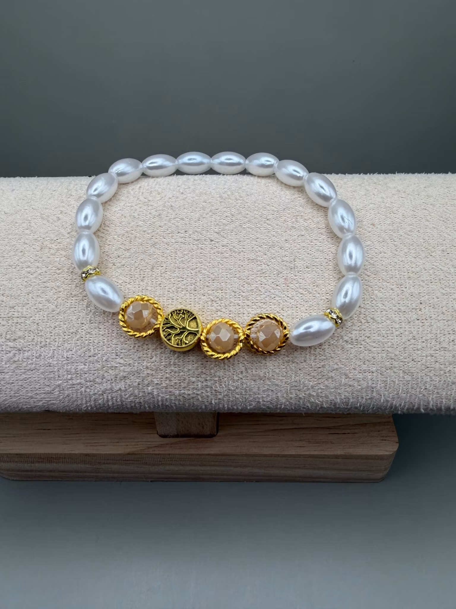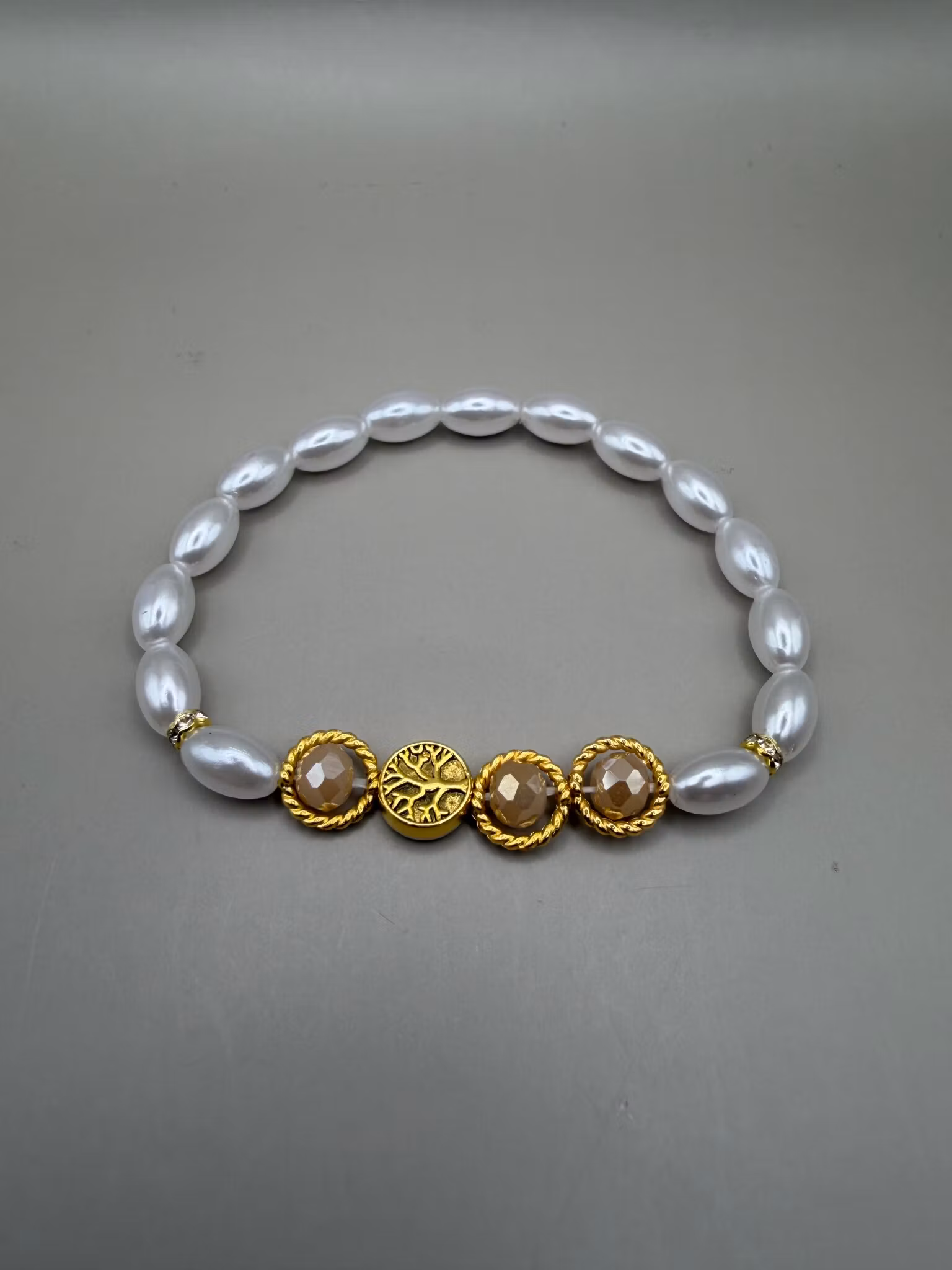 Ett vitt pärlarmband med risformade pärlor runt om. I blickfånget sitter tre beige glaspärlor, inramade av guldfärgade detaljer som framhäver deras elegans. Armbandet avslutas med en berlock med Livets träd som symbol för harmoni och styrka.