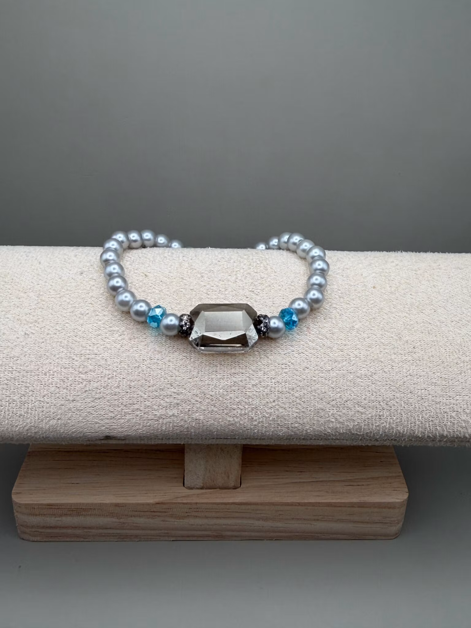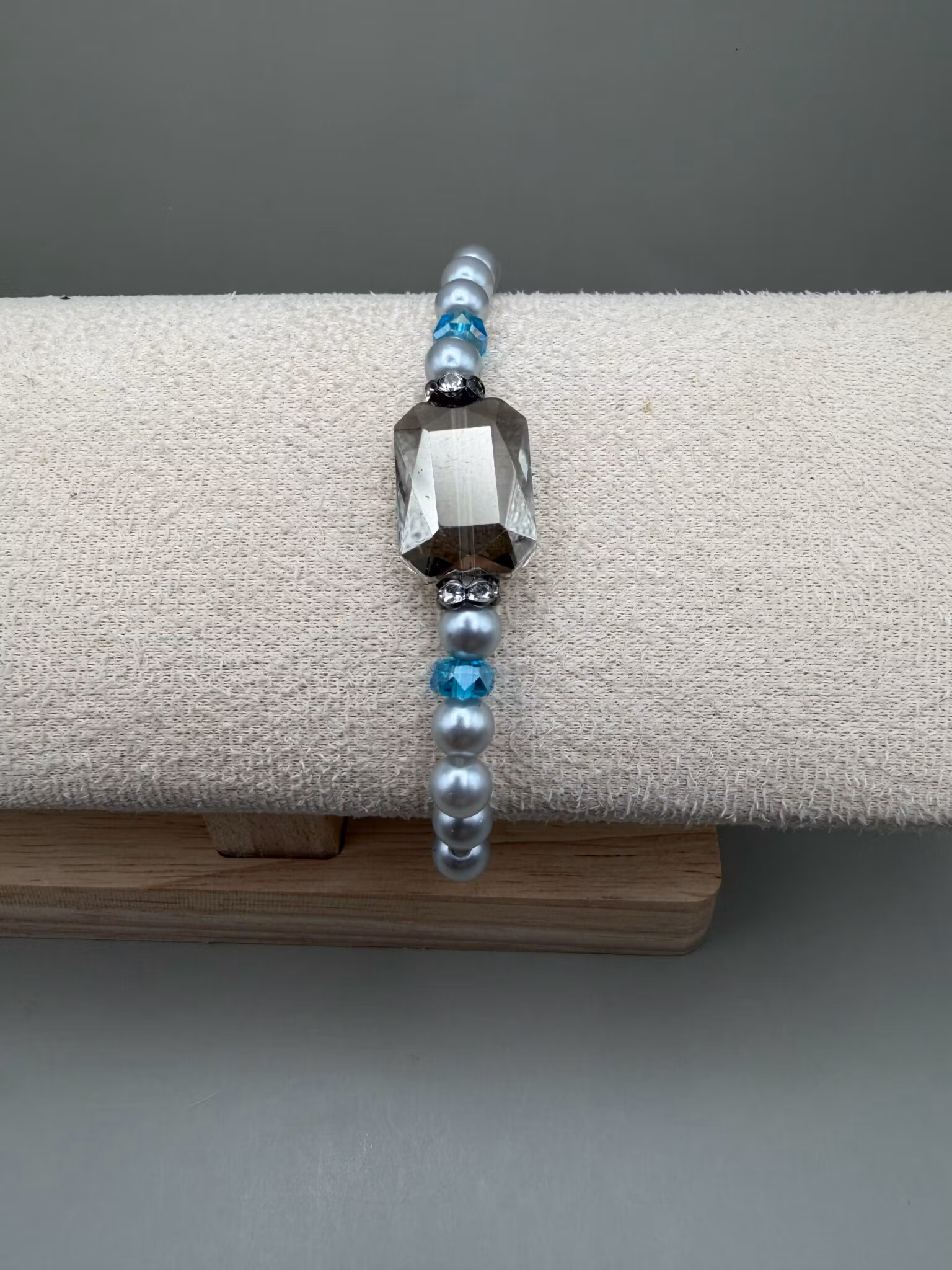 Ett pärlarmband i ljus silvergrå nyans. I blickfånget sitter en stor platt facetterad glaspärla, mörk strass och två turkosa glaspärlor som skapar en vacker kon