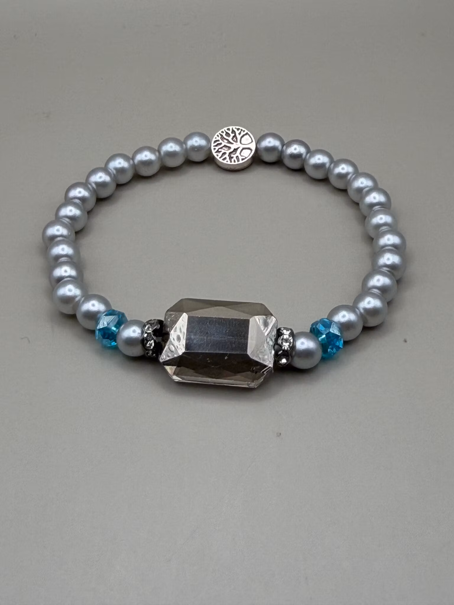 Ett pärlarmband i ljus silvergrå nyans. I blickfånget sitter en stor platt facetterad glaspärla, mörk strass och två turkosa glaspärlor som skapar en vacker kontrast. Armbandet avslutas med en berlock med Livets träd, en symbol för harmoni och styrka.