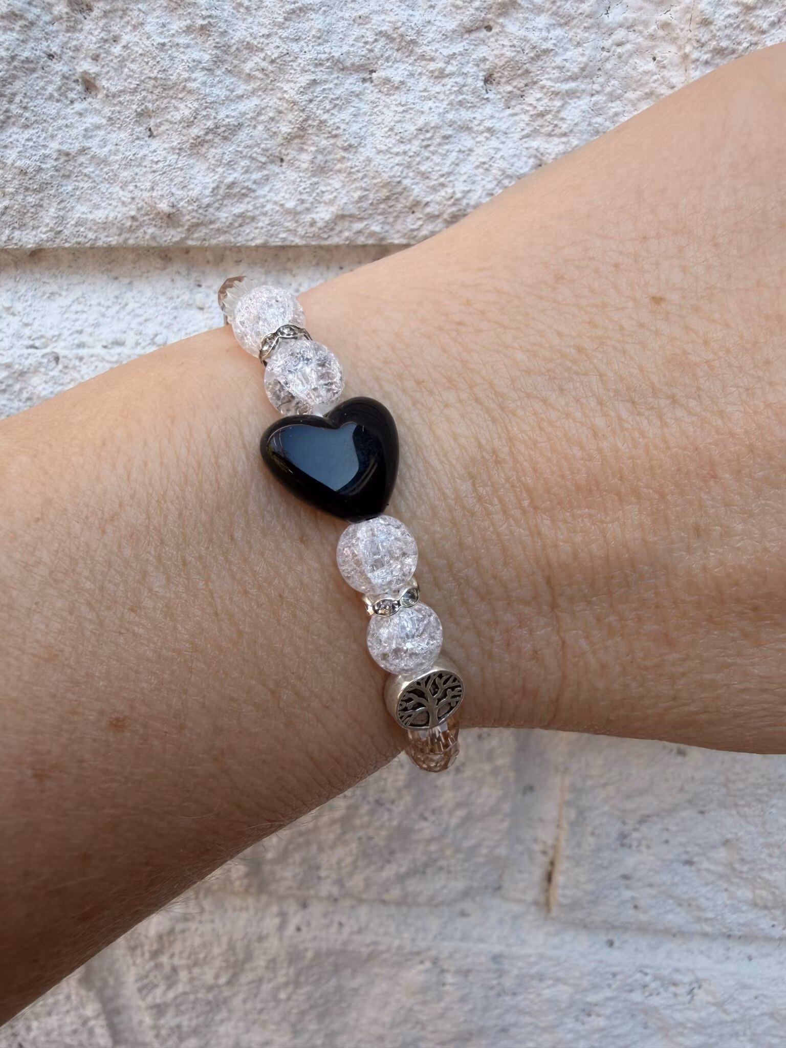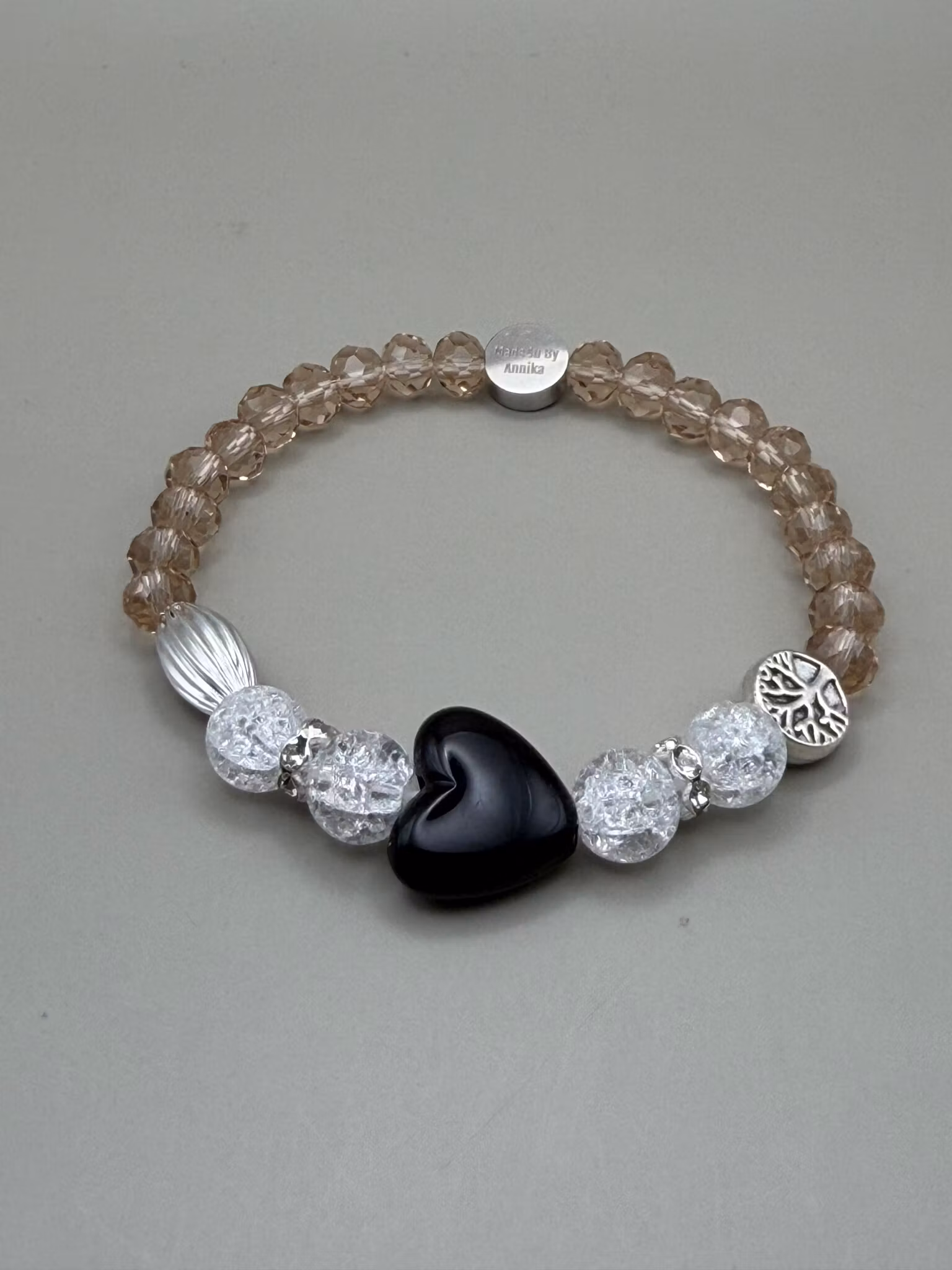 Pärlarmband med beige facetterade glaskristallpärlor och vita melerade runda glaspärlor. I blickfånget samsas dessa med gnistrande strass och ett stort svart högblankt hjärta och en berlock med Livets träd. Armbandet avslutas medmin signaturpärla för en unik och personlig finish.