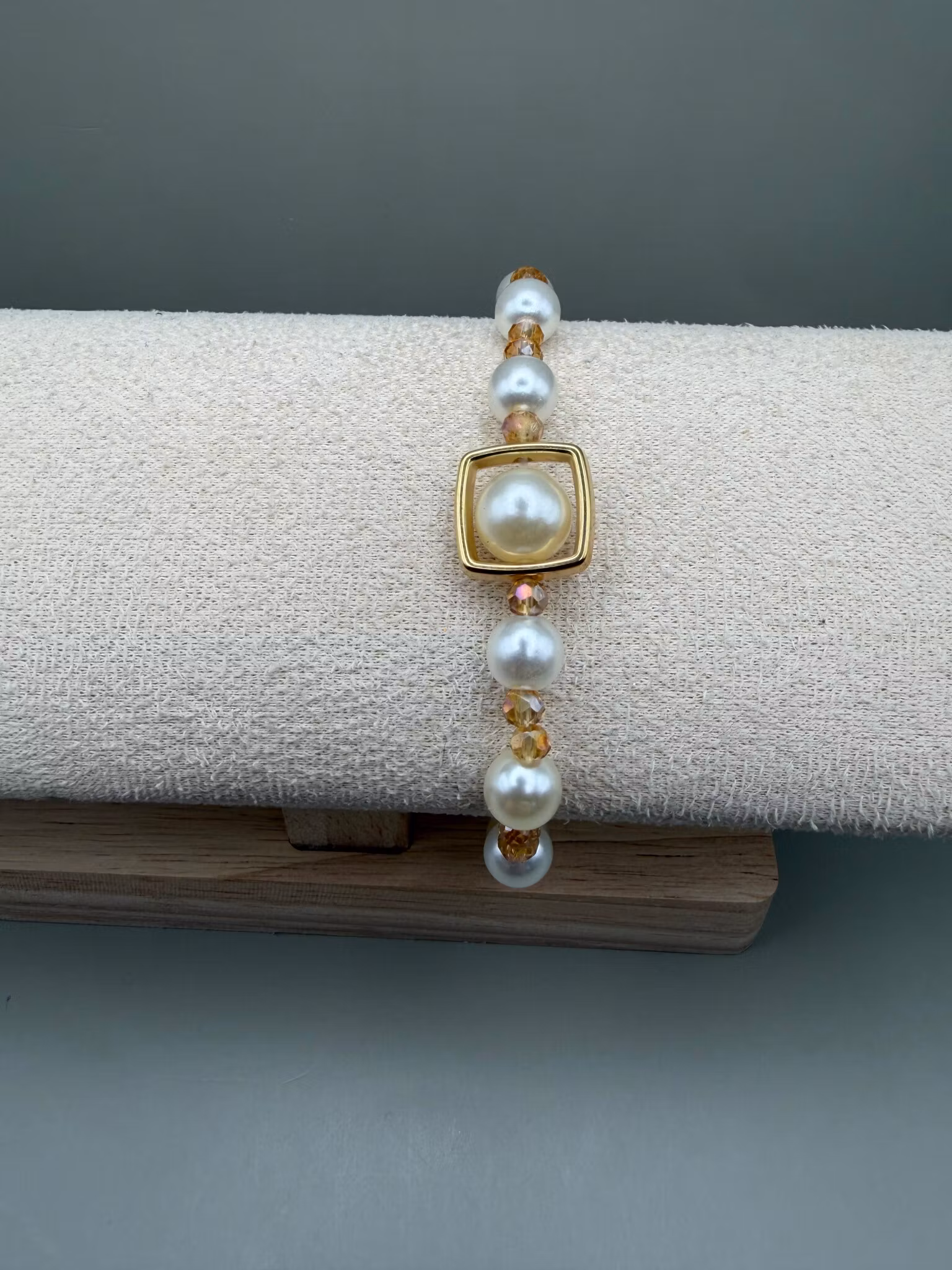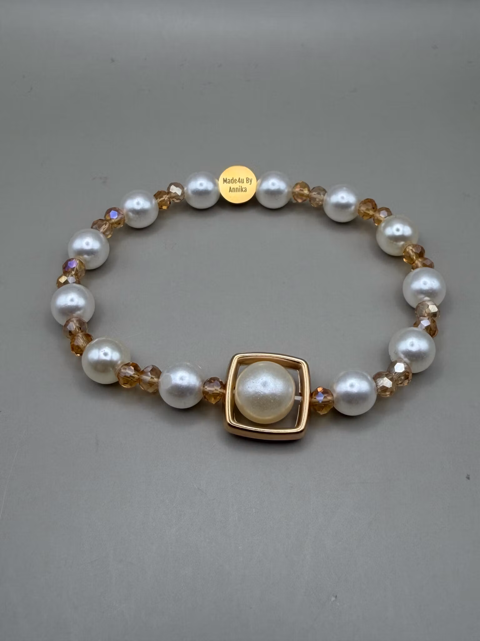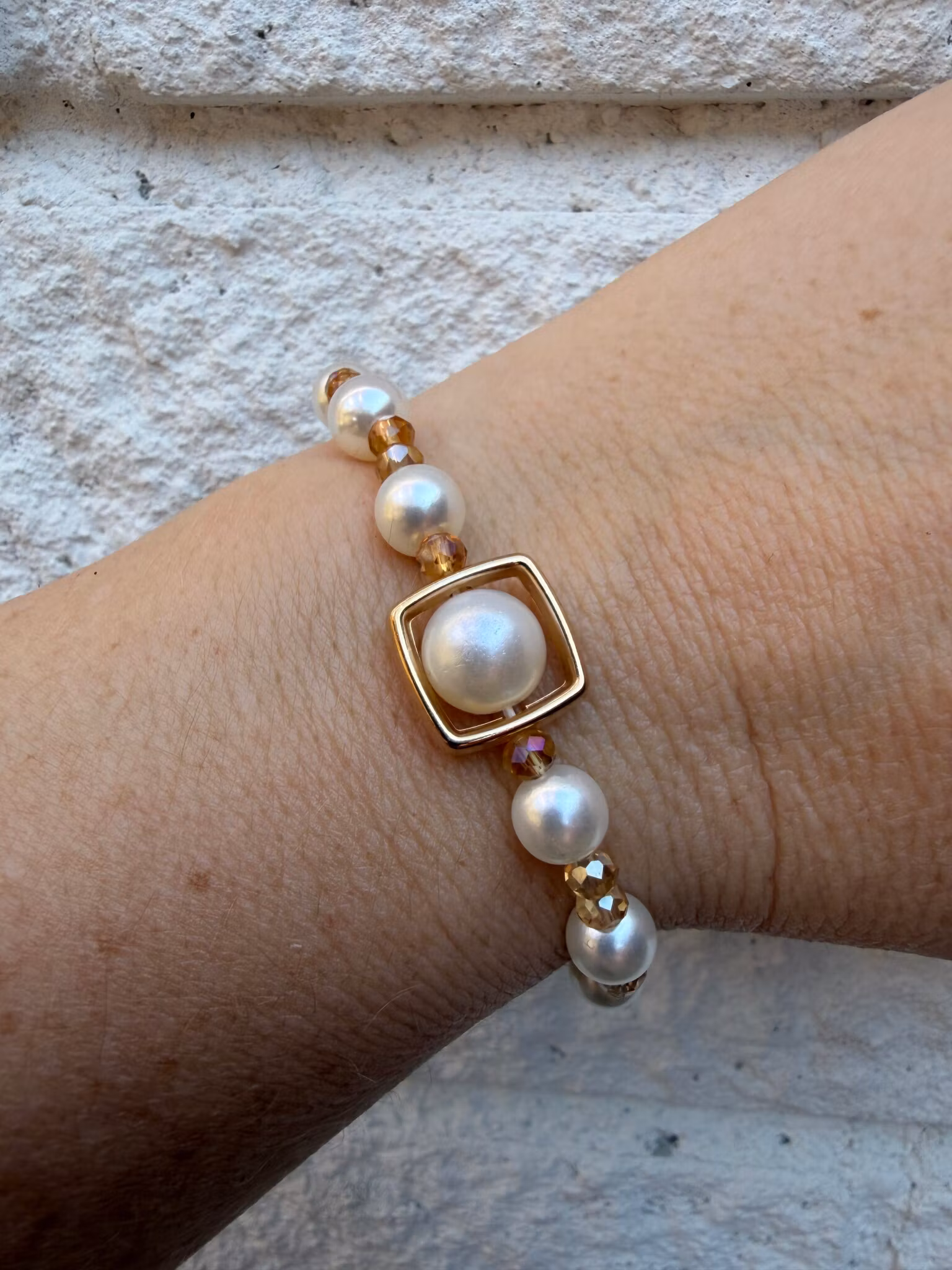 Ett elegant pärlarmband med växelvis benvita runda pärlor och små facetterade glaskristallpärlor i mörkbeige glas. I centrum sitter en större benvita pärla, vackert inramad av en fyrkantig detalj som drar blickarna till sig. Armbandet avslutas med min signaturpärla – en unik och personlig touch.