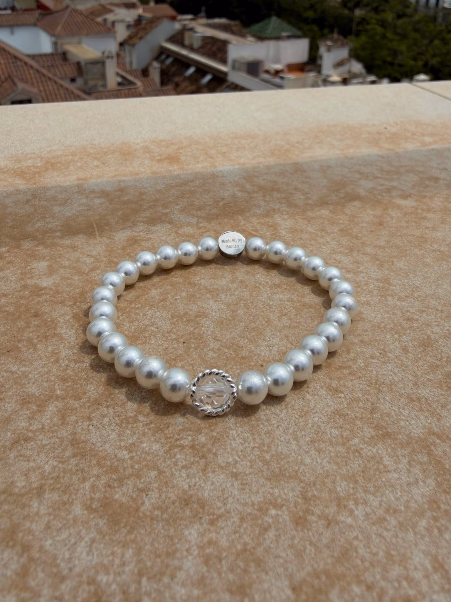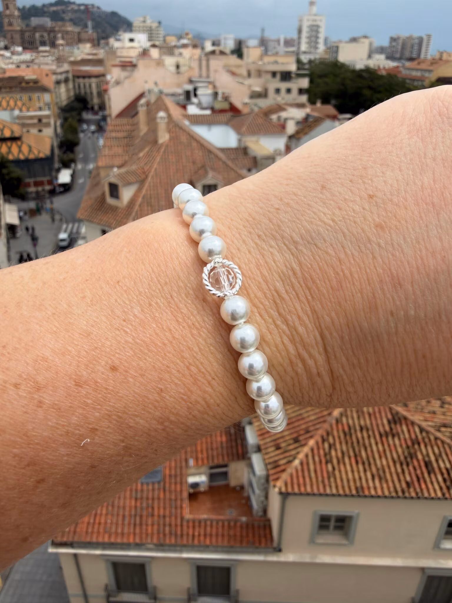 Ett tidlöst och elegant pärlarmband med vita, runda högblanka glaspärlor som ger ett klassiskt och sofistikerat uttryck. I blickfånget sitter en stilren silvrig detalj som lyfter designen, tillsammans med min signaturpärla – en unik touch som gör armbandet personligt och speciellt. Ett smycke som passar lika vackert till vardag som till fest.