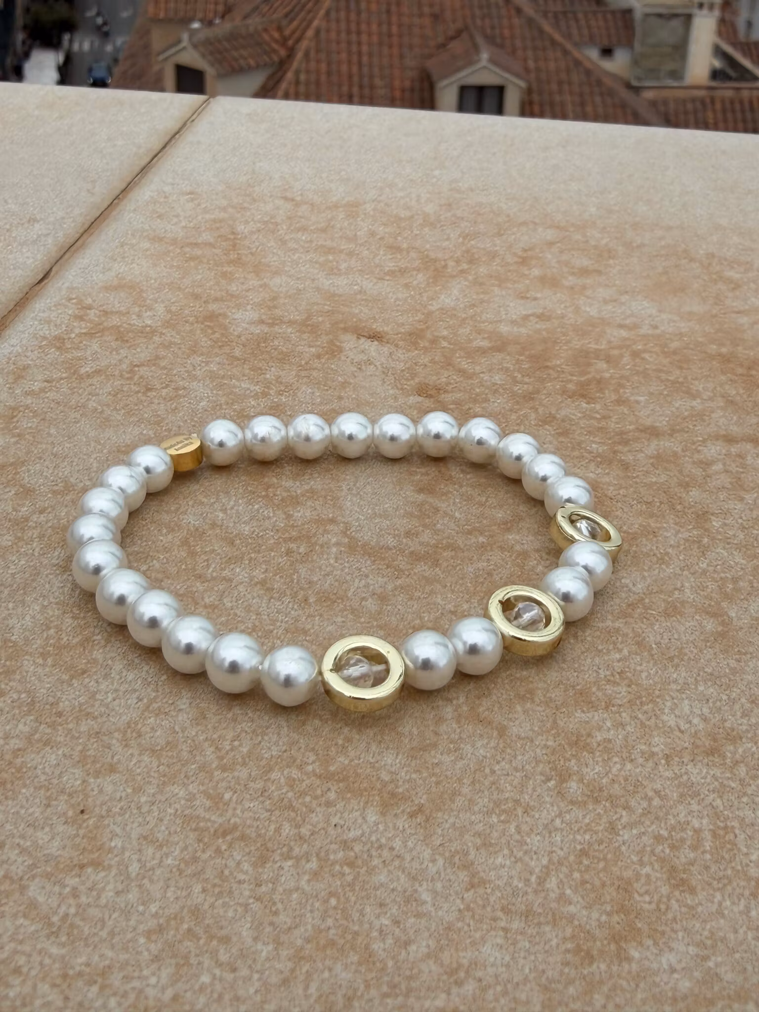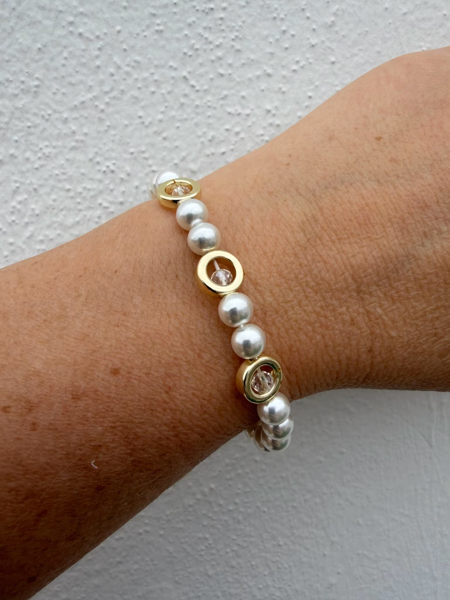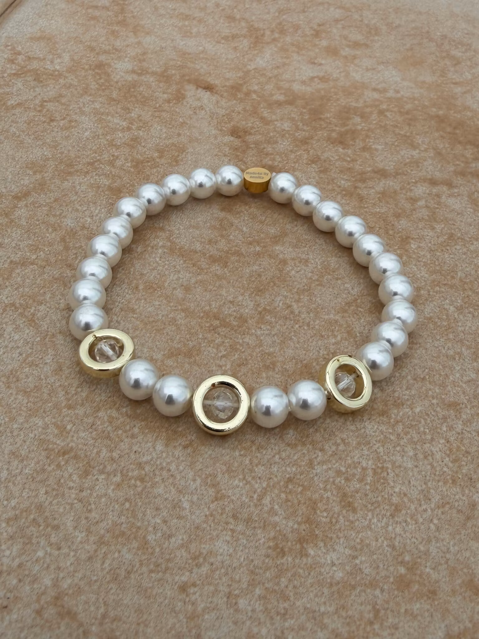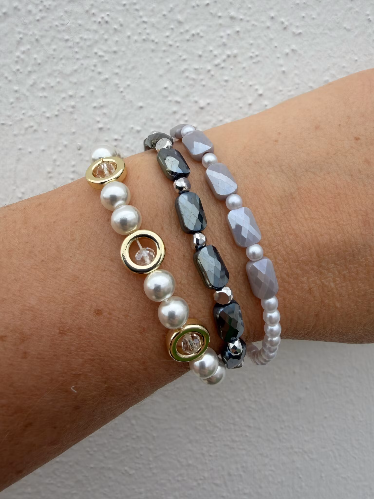 Ett tidlöst och elegant pärlarmband med vita, runda högblanka glaspärlor som ger ett klassiskt och sofistikerat uttryck. I blickfånget sitter tre stilrena 18K guldpläterade hematitramar, en detalj som lyfter designen, tillsammans med min signaturpärla – en unik touch som gör armbandet personligt och speciellt. Ett smycke som passar lika vackert till vardag som till fest.
