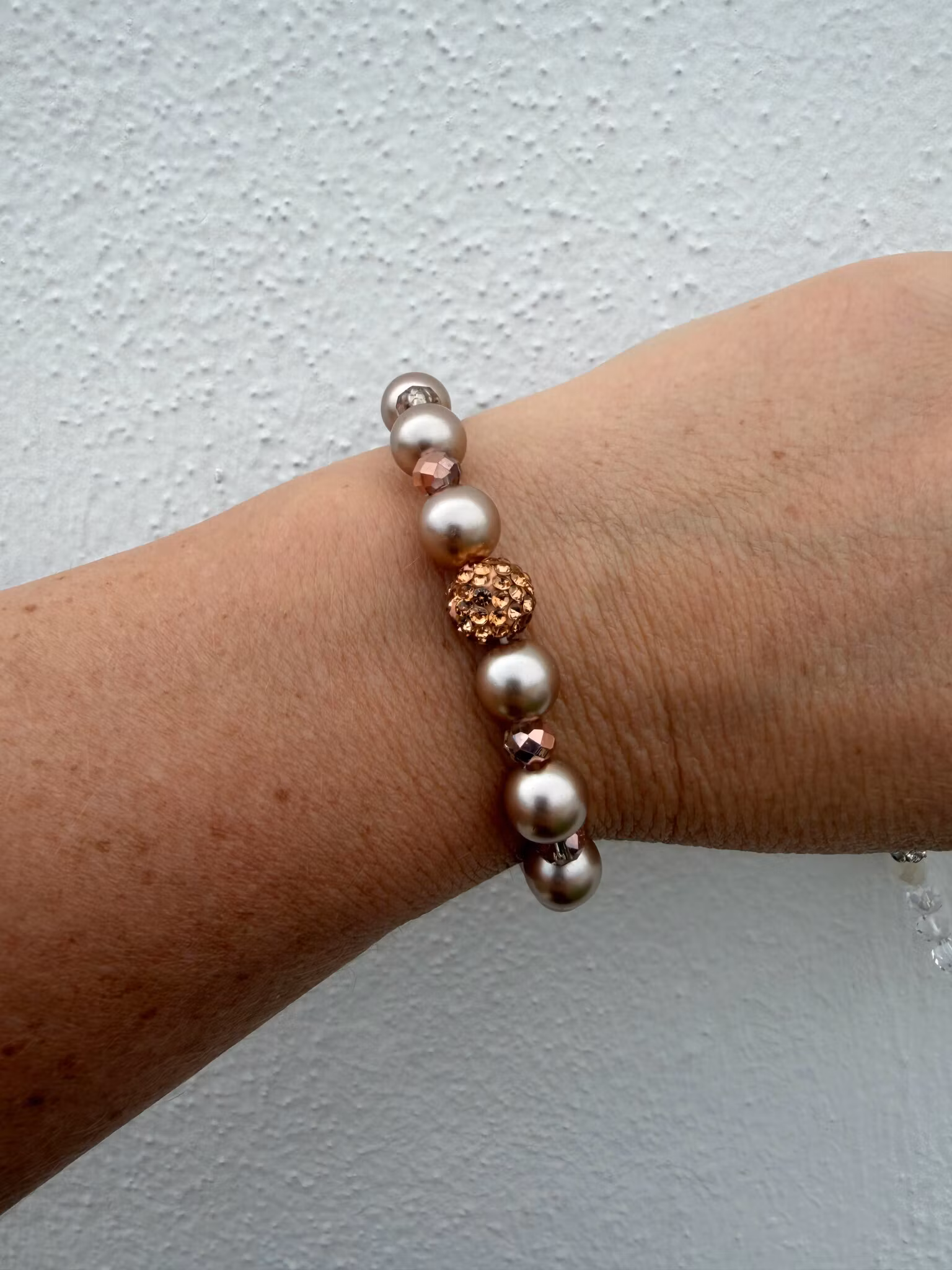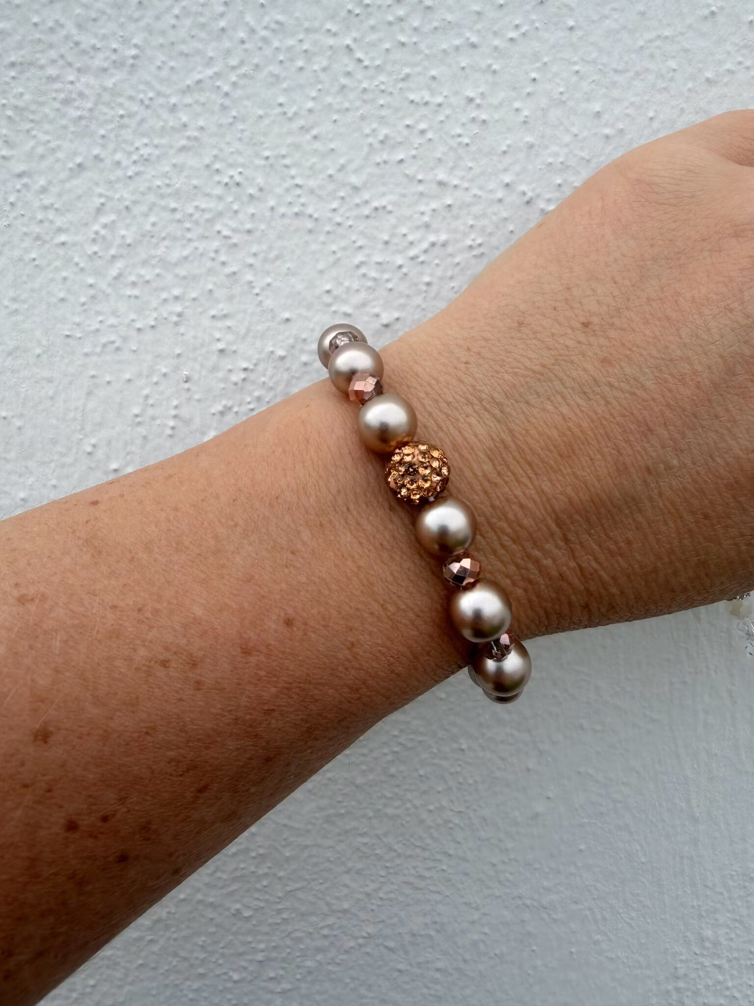 Ett elegant armband i mjuka toner av champagne och beige, där stora runda pärlor varvas med små, aprikosfärgade facetterade glaskristaller som fångar ljuset på ett subtilt och vackert sätt. I blickfånget glittrar rosefärgad strass och skapar en feminin och exklusiv känsla.