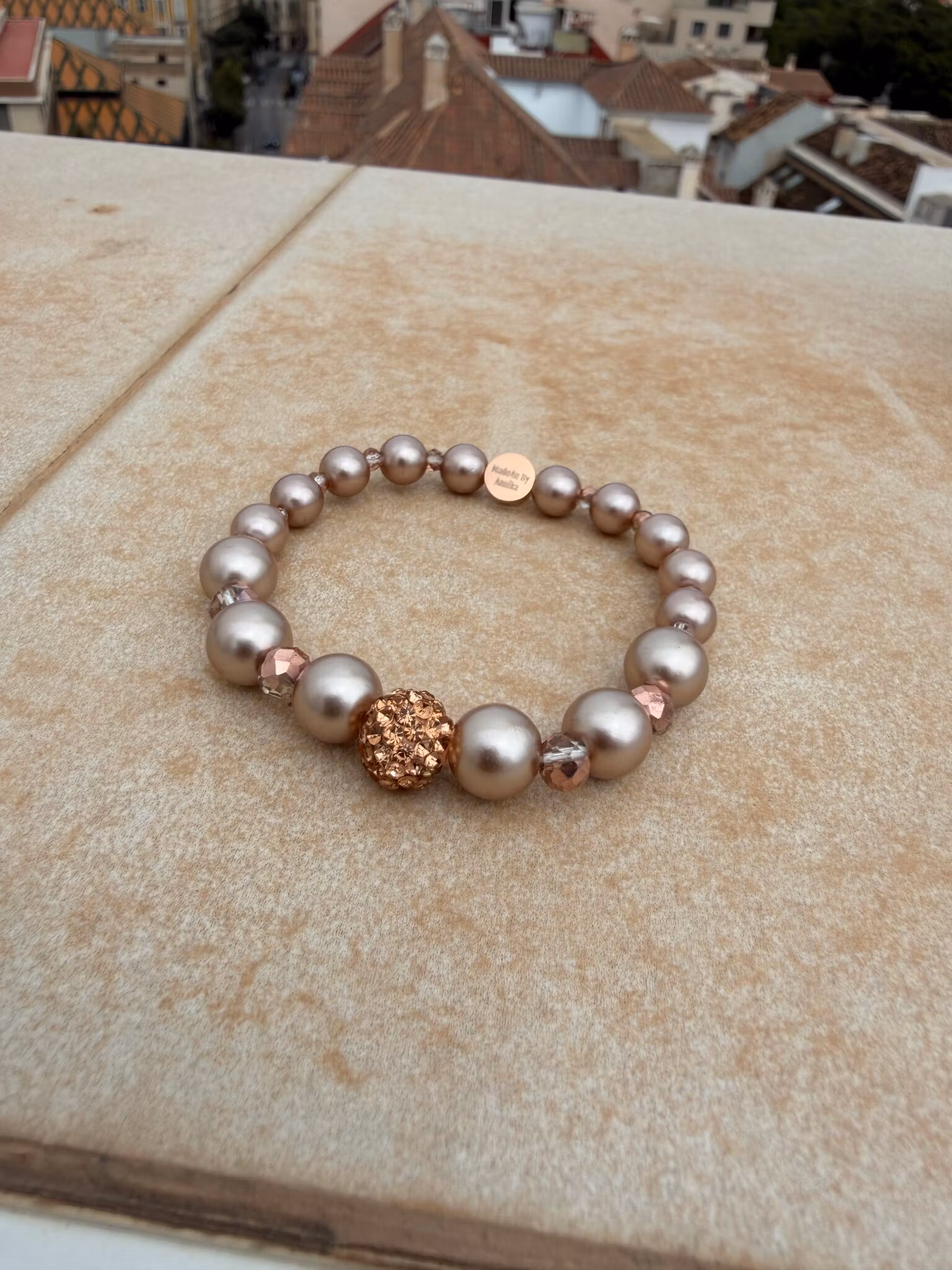 Ett elegant armband i mjuka toner av champagne och beige, där stora runda pärlor varvas med små, aprikosfärgade facetterade glaskristaller som fångar ljuset på