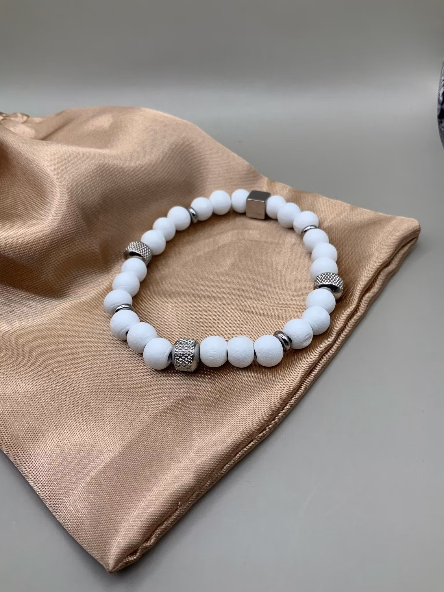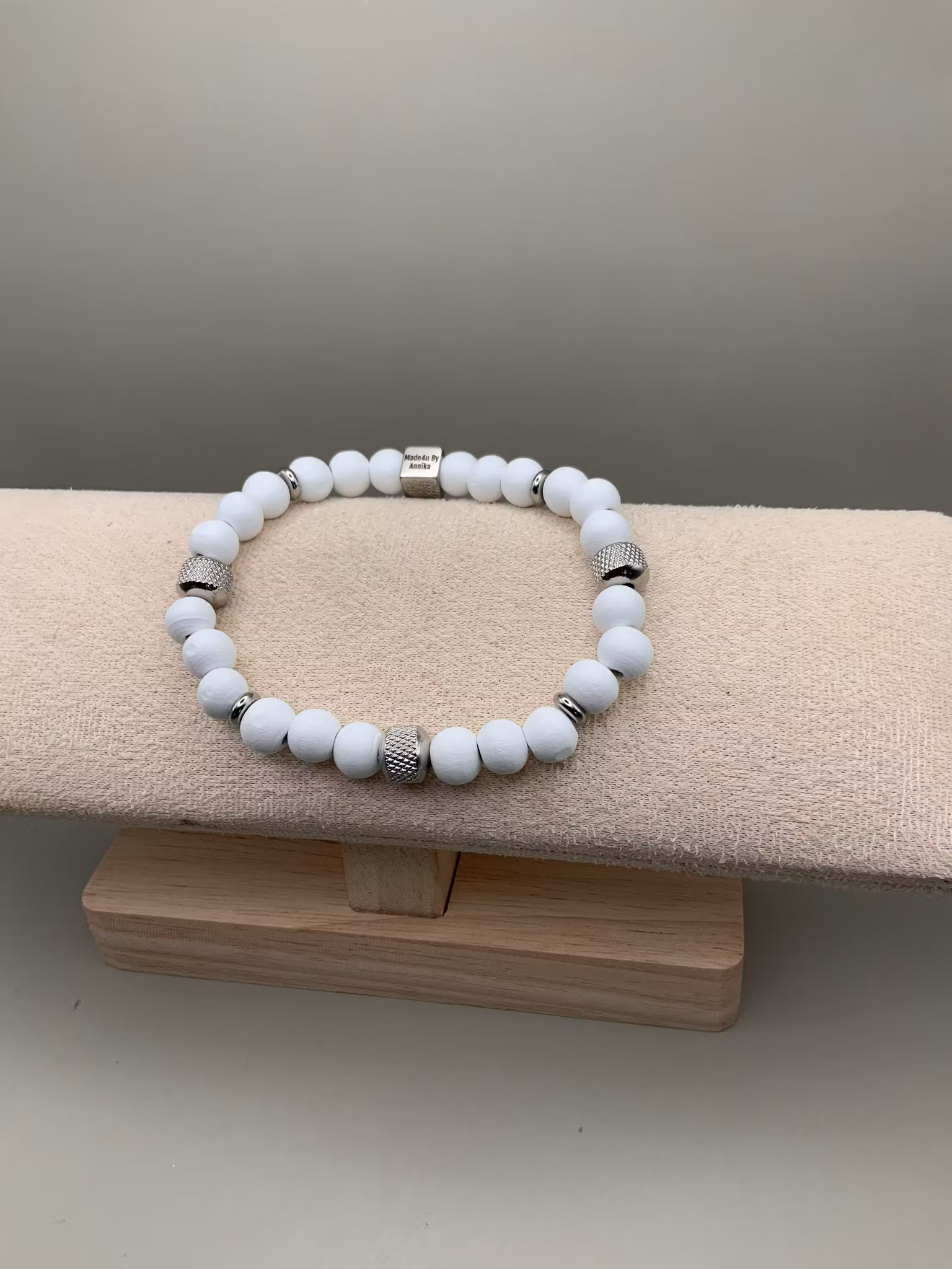 Ett ledigt och somrigt armband med vita, lätt knaggliga pärlor som ger en naturlig och avslappnad känsla. De organiska formerna skapar liv och gör varje armband