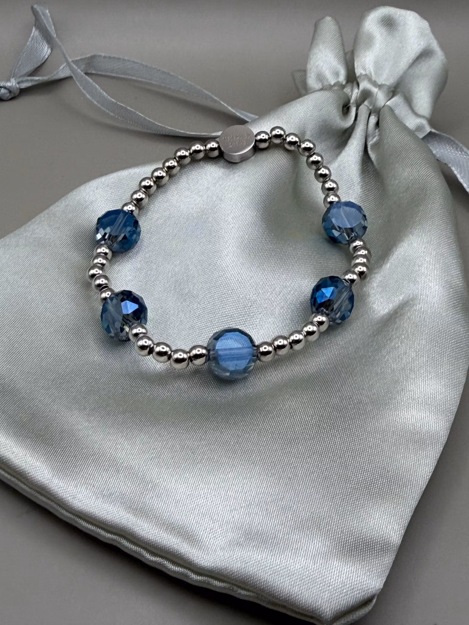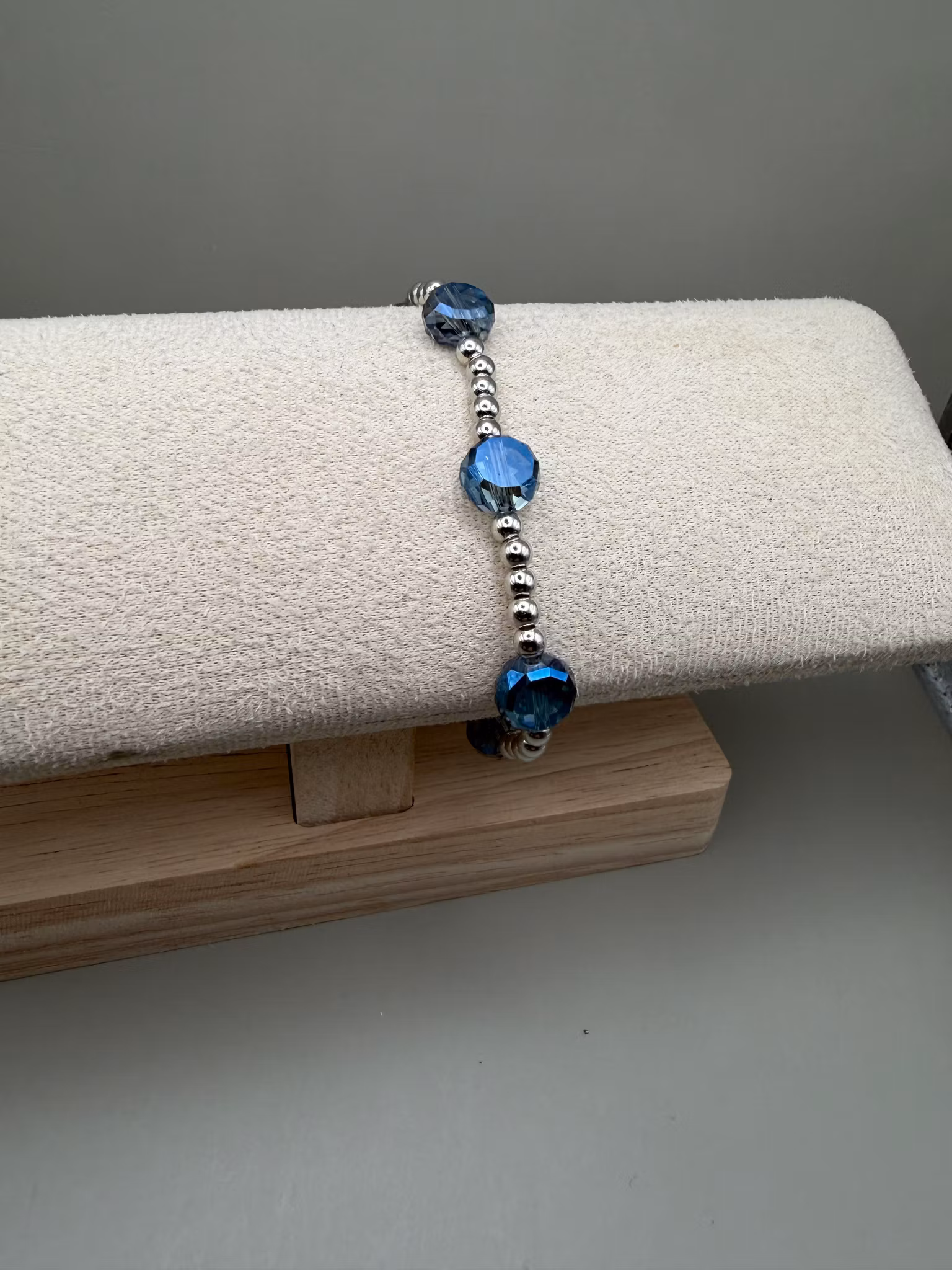 Ett vackert och stilrent pärlarmband med ett harmoniskt varvat mönster av små silverfärgade pärlor och större, platta facetterade blå glaspärlor. De skimrande b