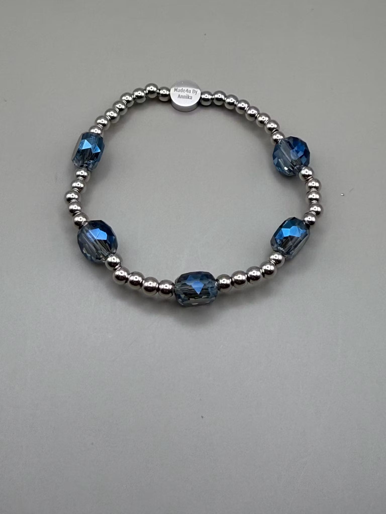 Ett vackert och stilrent pärlarmband med ett harmoniskt varvat mönster av små silverfärgade pärlor och större, platta facetterade blå glaspärlor. De skimrande blå tonerna fångar ljuset på ett elegant sätt och skapar en känsla av lyx och tidlös elegans – ett armband som lyfter både vardags- och festlook.