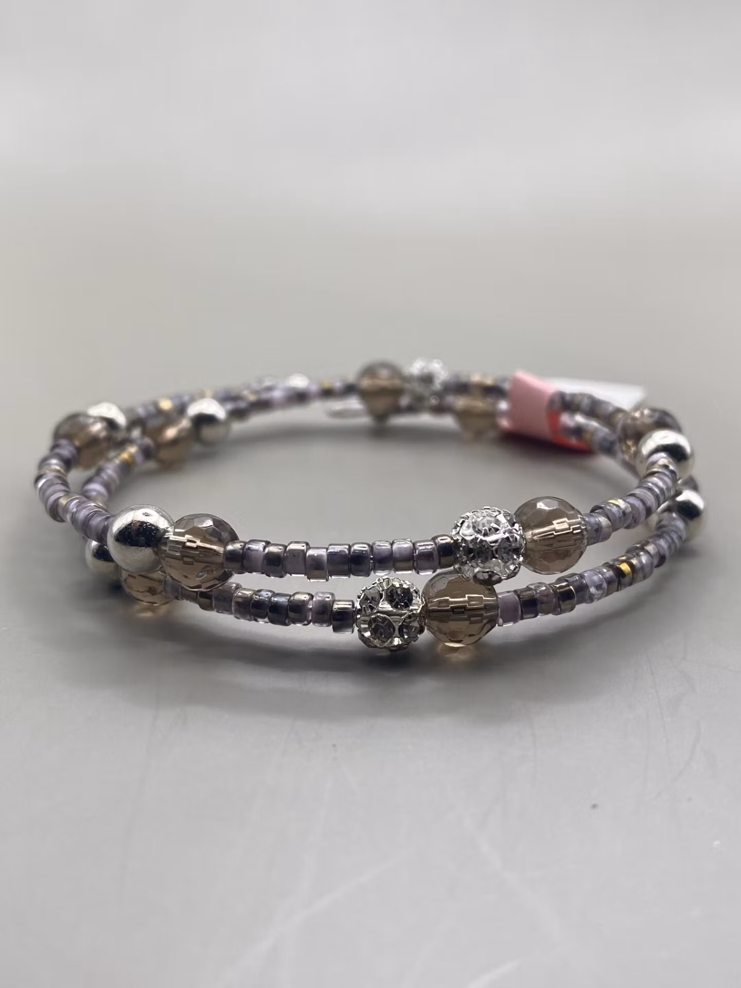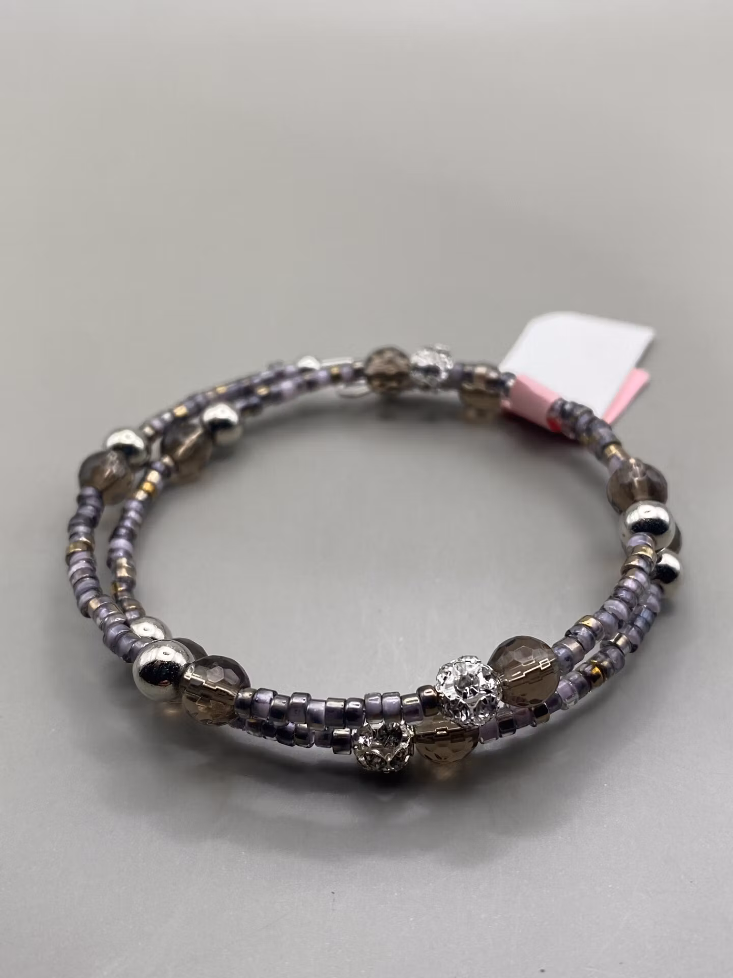 Vackert armband i fin mix av varvat jordnära brun, grĺ och silver glaspärlor varvat i fin mönster av dimgrĺ stora glaspärlor, silverfärgade stora pärlor samt glitterbollar.