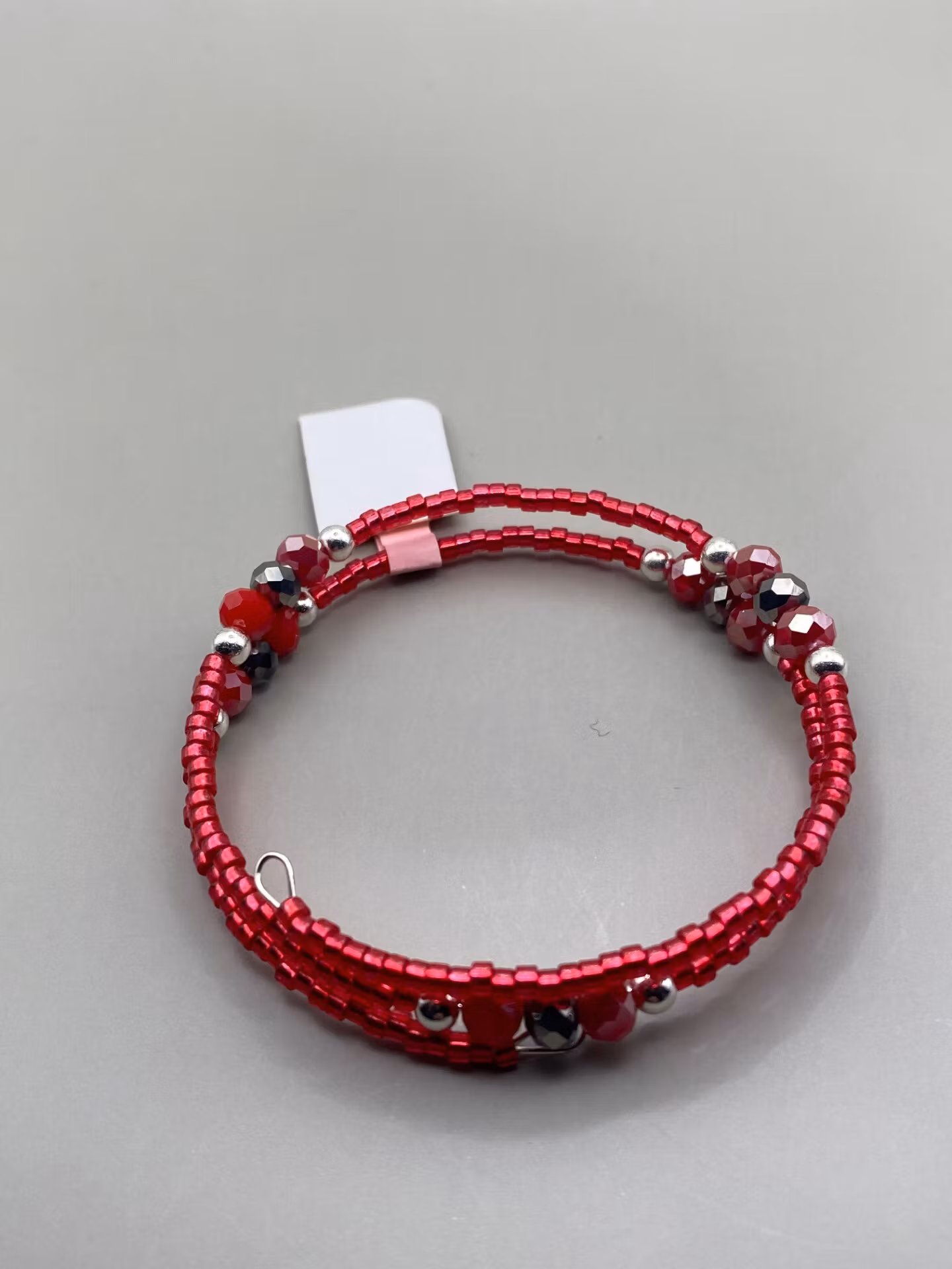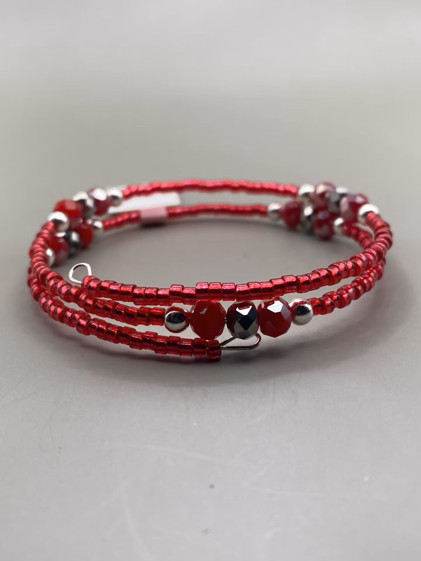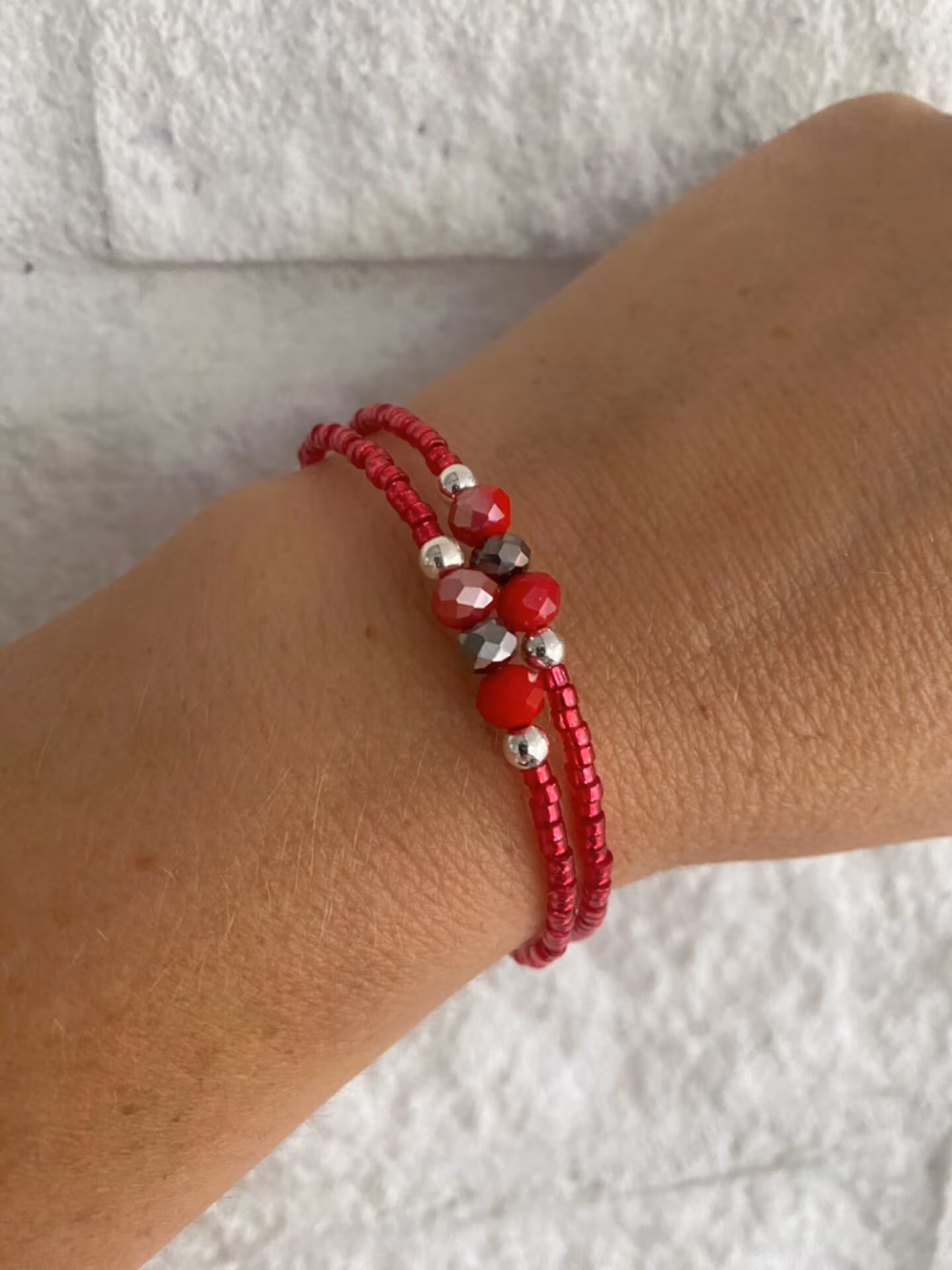 Fint armband i fin mix av varvat glansiga röda smĺ glaspärlor varvat med silverfärgade pärlor, rödmellerade glaspärlor och silverfärgade glaspärlor.