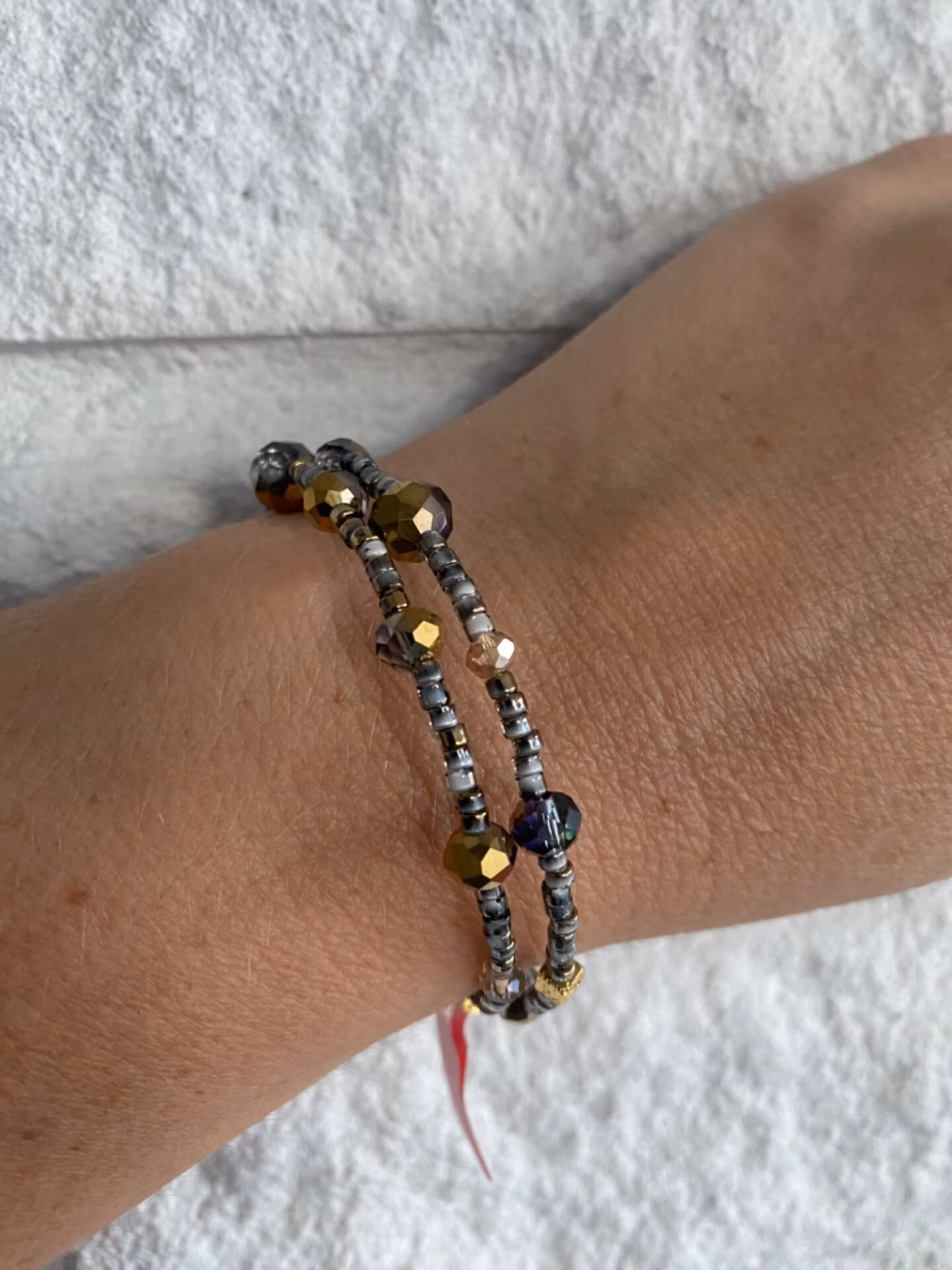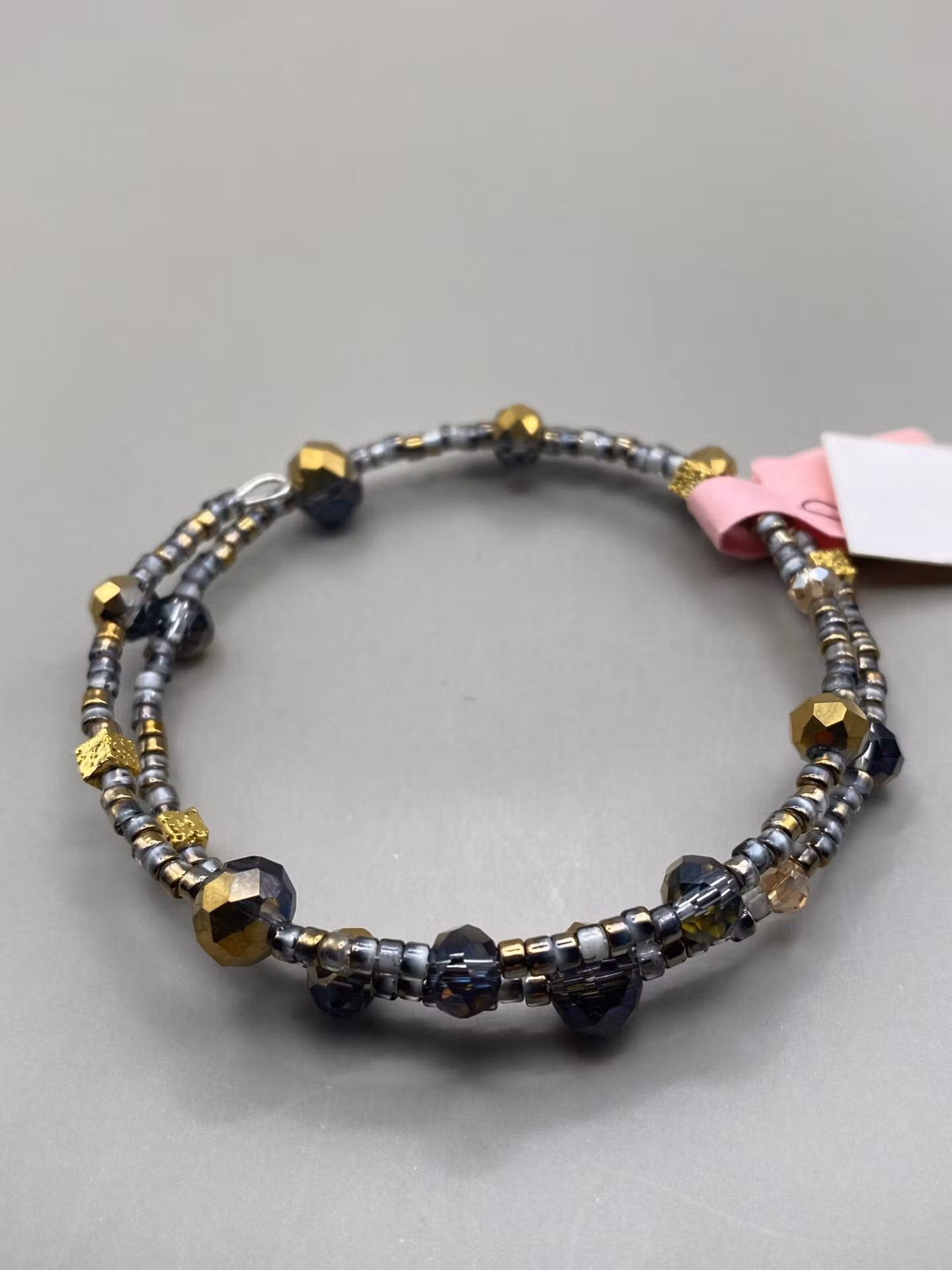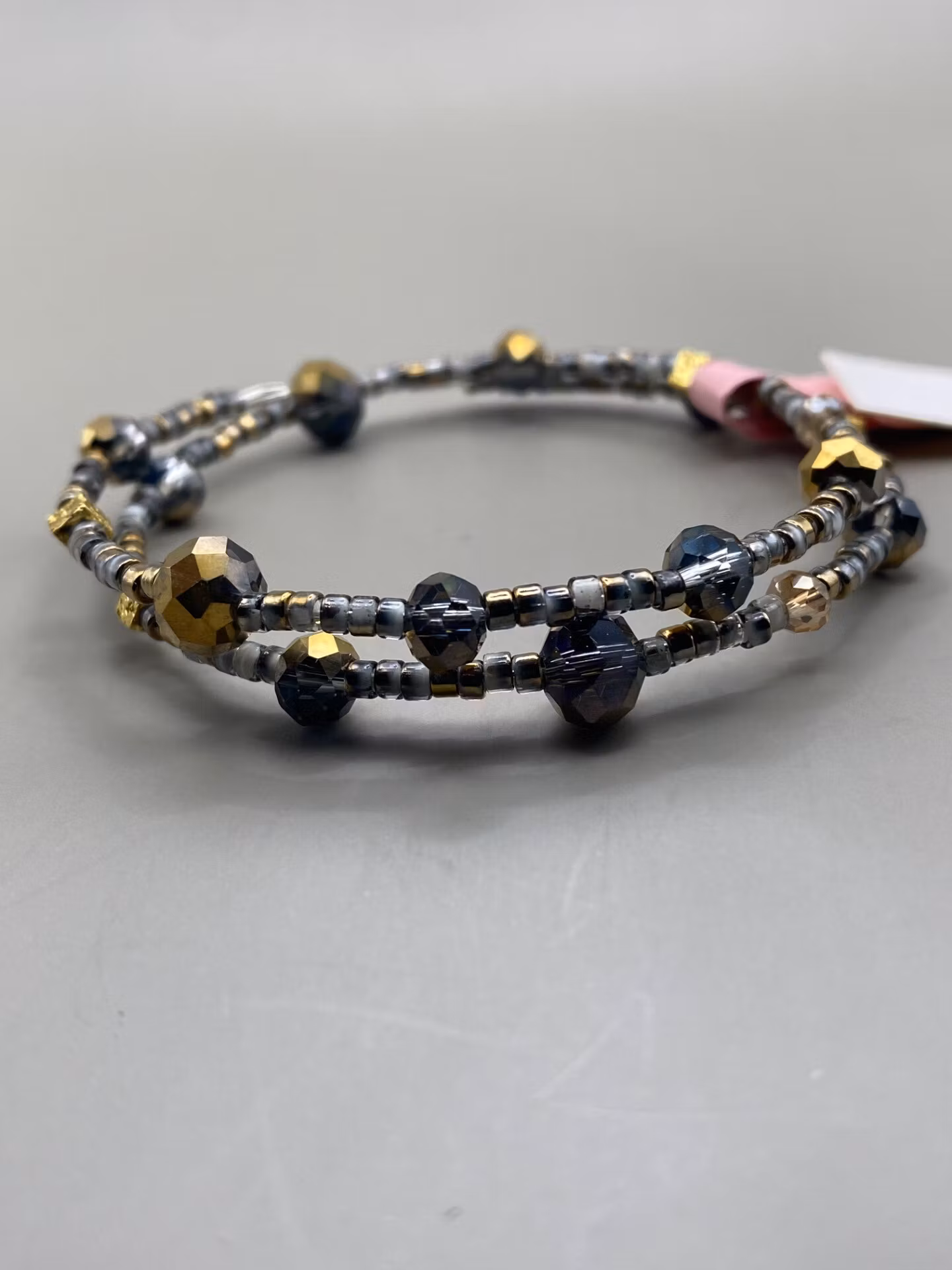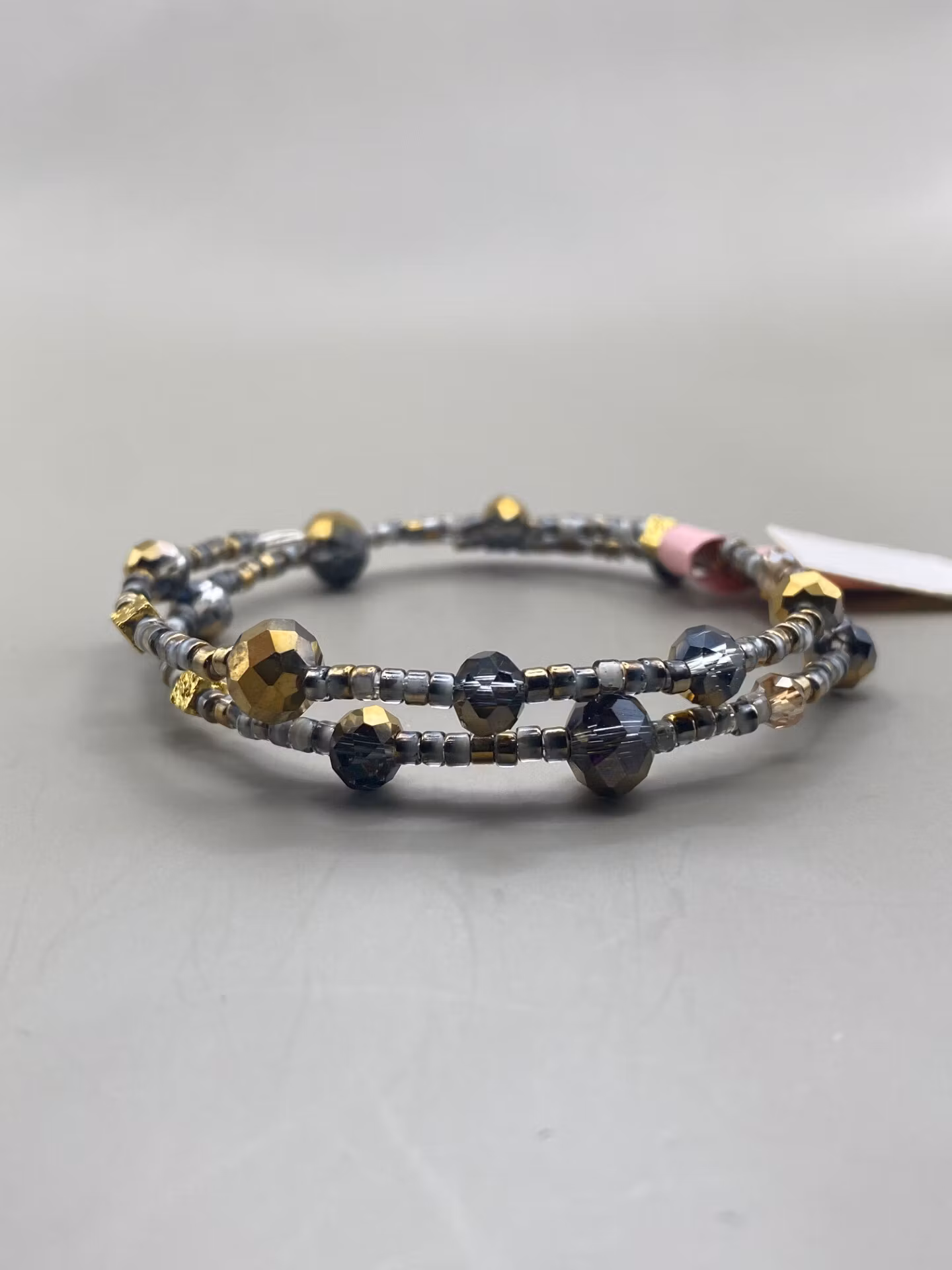 Armband i tvĺ radigt fint mönster av smĺ grĺmellerade glaspärlor dekorerat med stora och mindre guldmellerade glaspärlor.