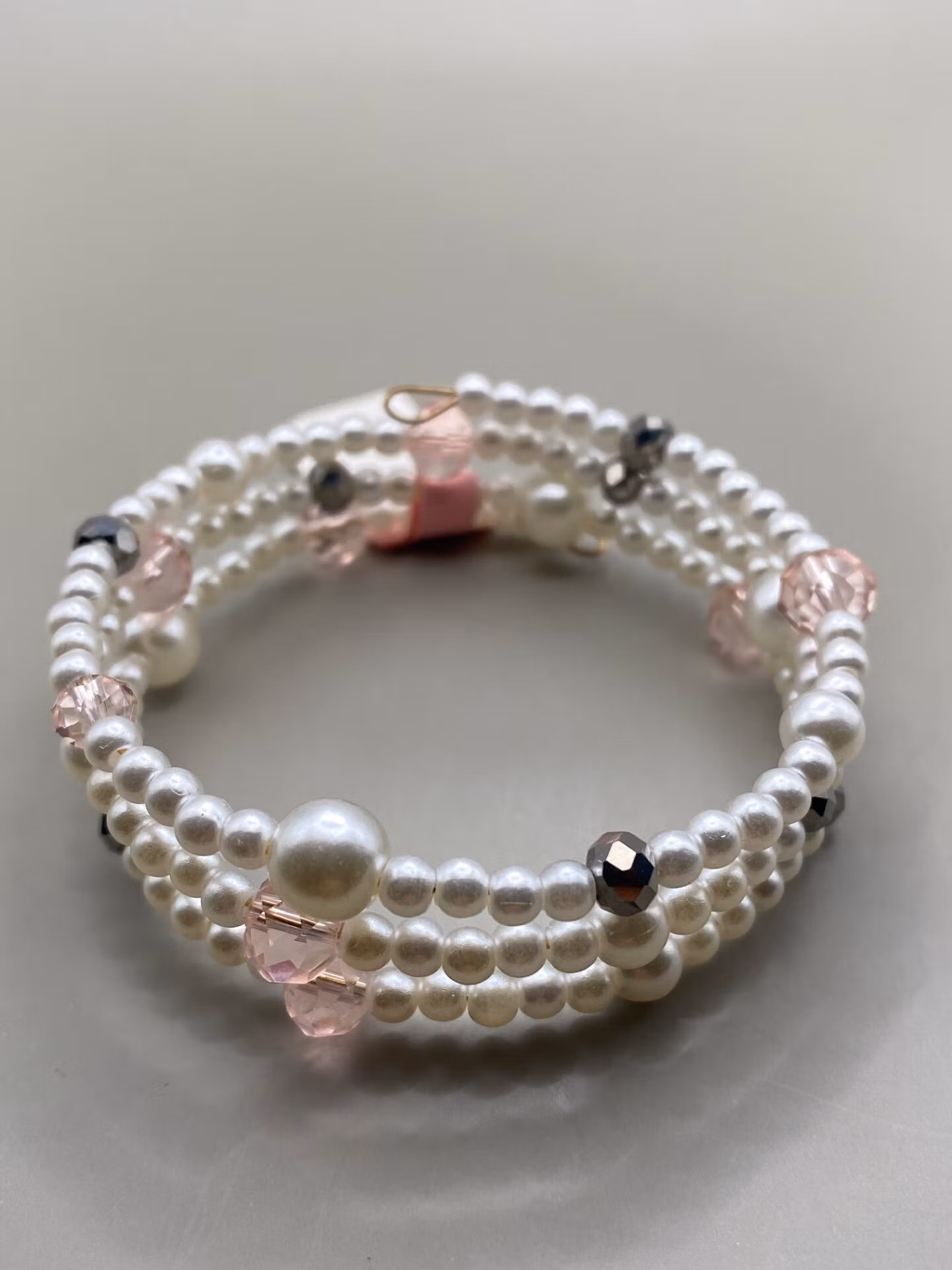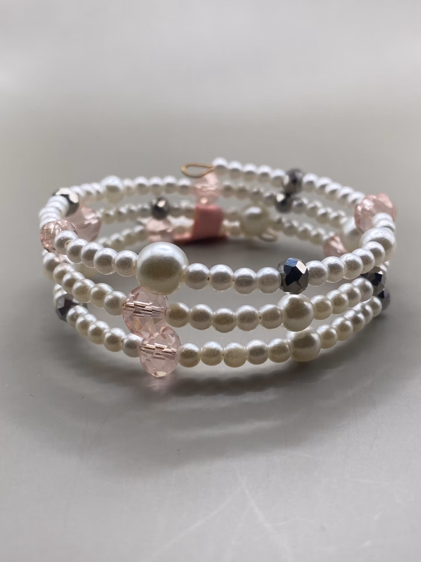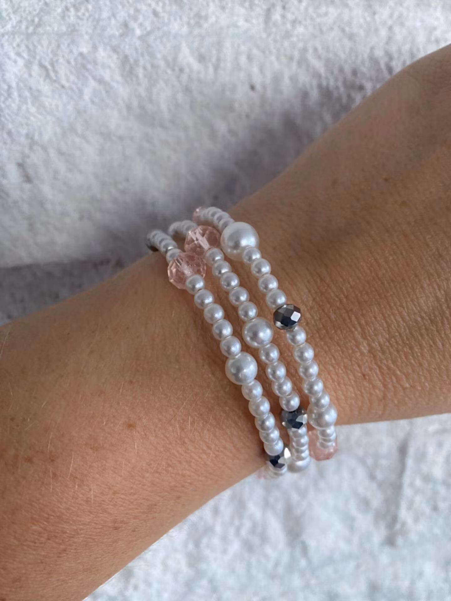 Armband i fint treradigt mönster av smĺ kritvita pärlor varvat silverfärgade mindre glaspärlor, större ljusrosa glaspärlor och stora och mellanstora vita pärlror.