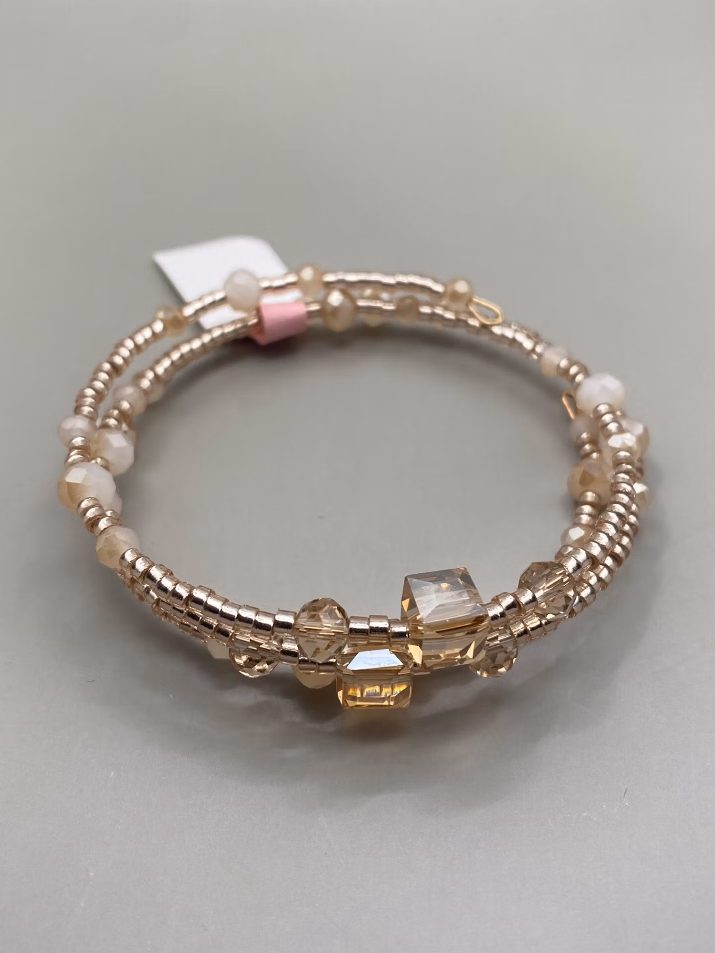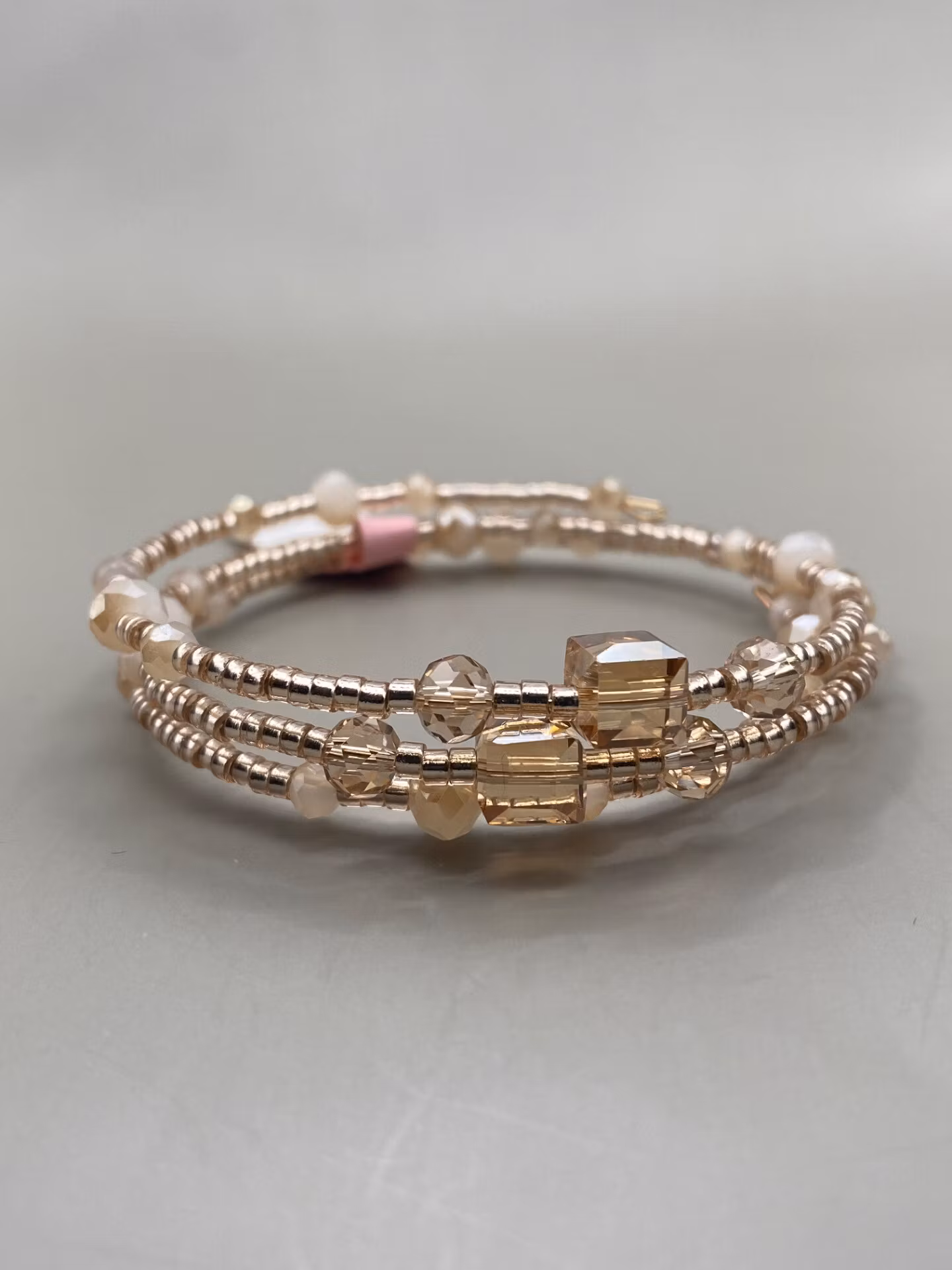 Armband i fint treradigt mönster av smĺ rosefärgade glaspärlor varvat med frostade beiga glaspärlor, samt champagnefärgade glaspärlor, ”runda” och fyrkantiga, i blickfĺnget