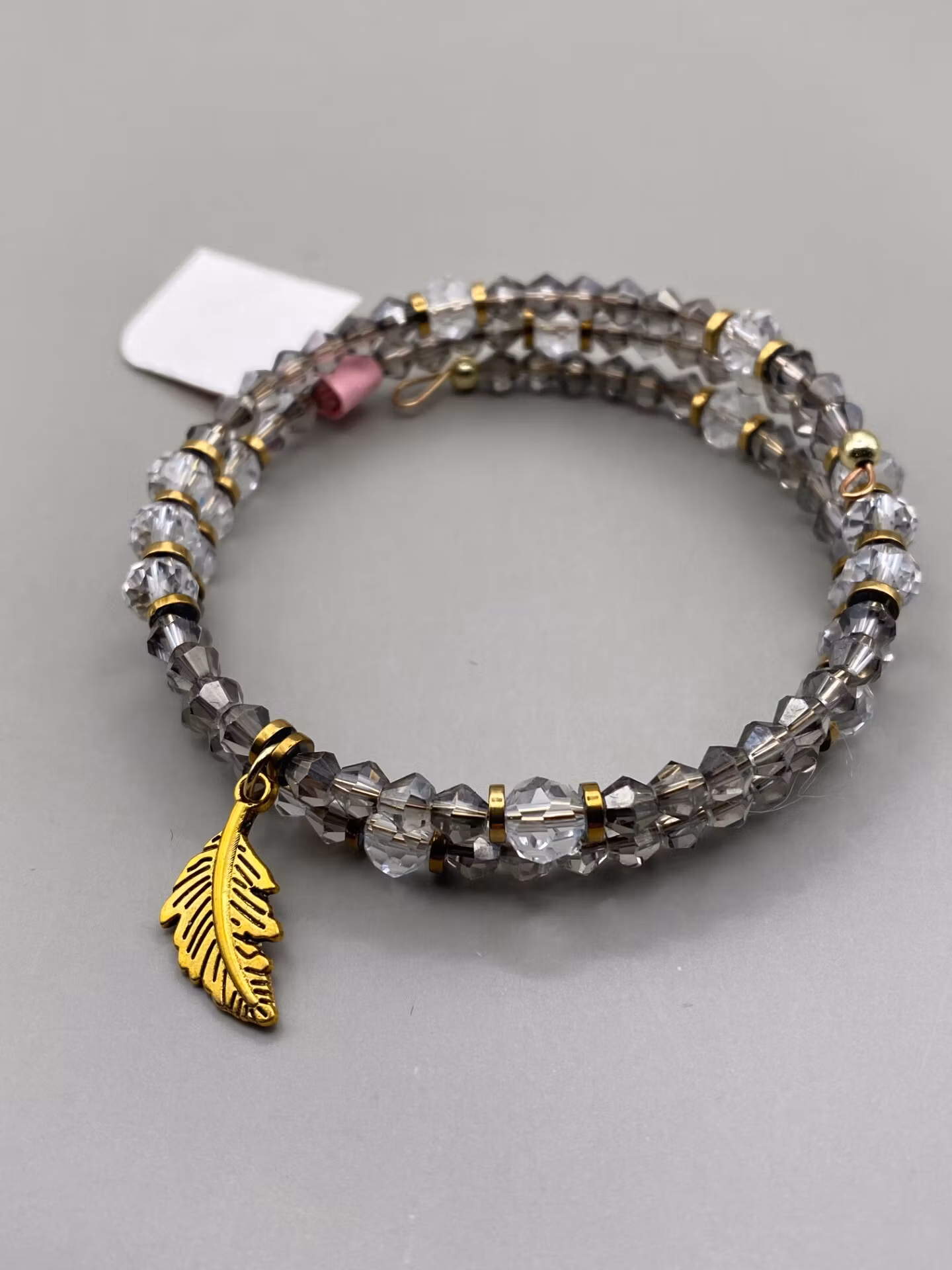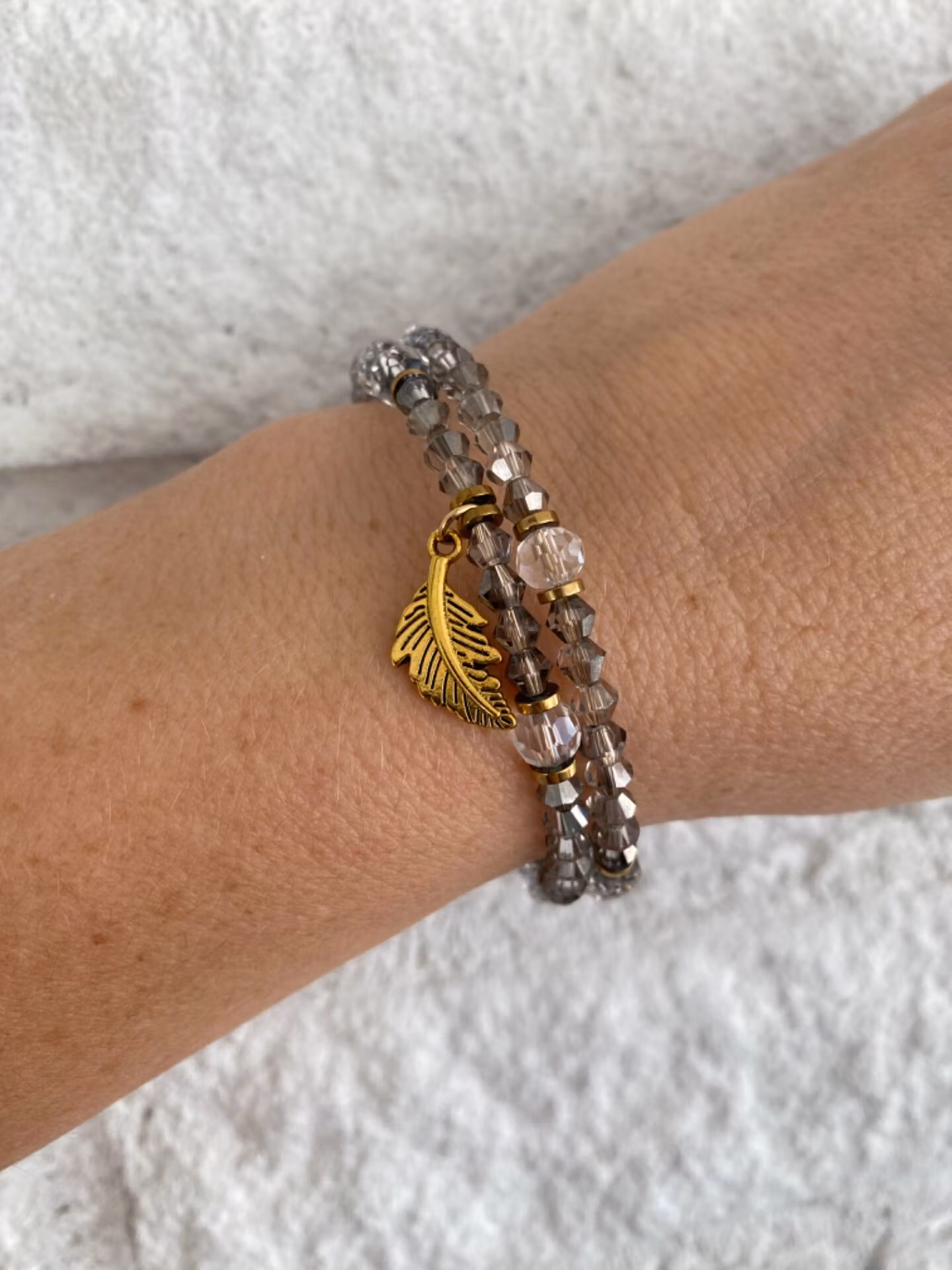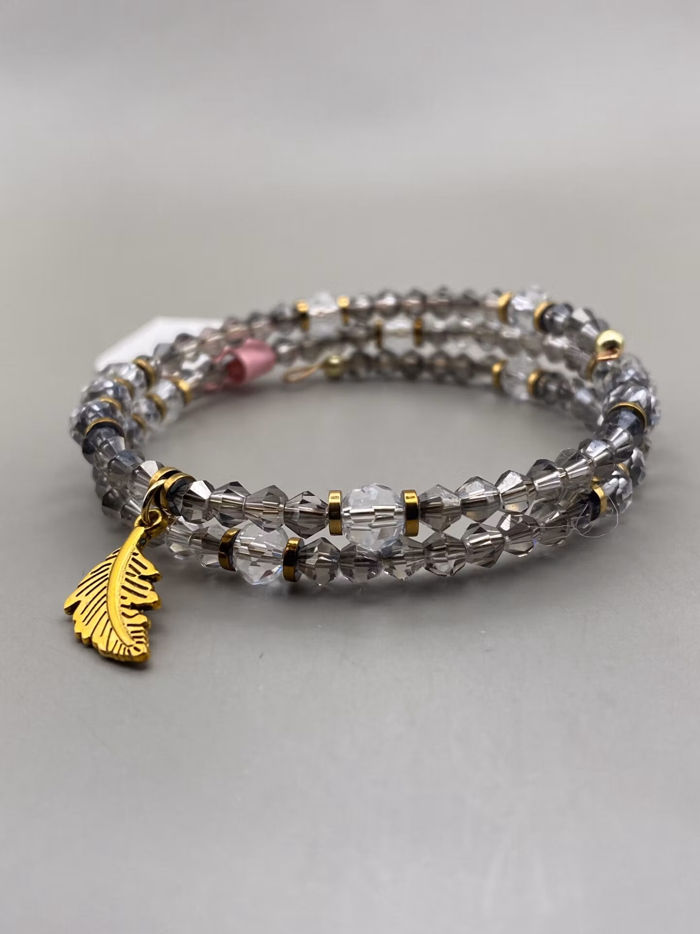Elegant armband i fint tvĺradigt mönster. Armbandet har ett varvat mönster av grĺ glansiga fasetterade smĺ glaspärlor och genomskinliga, klara nĺgot större fasetterade glaspärlor varvat med antikguldfärgade distanser. Antik guldfärgad berlock i form av ett löv (eller fjäder) i blickfĺnget. Vackert skimrande armband.