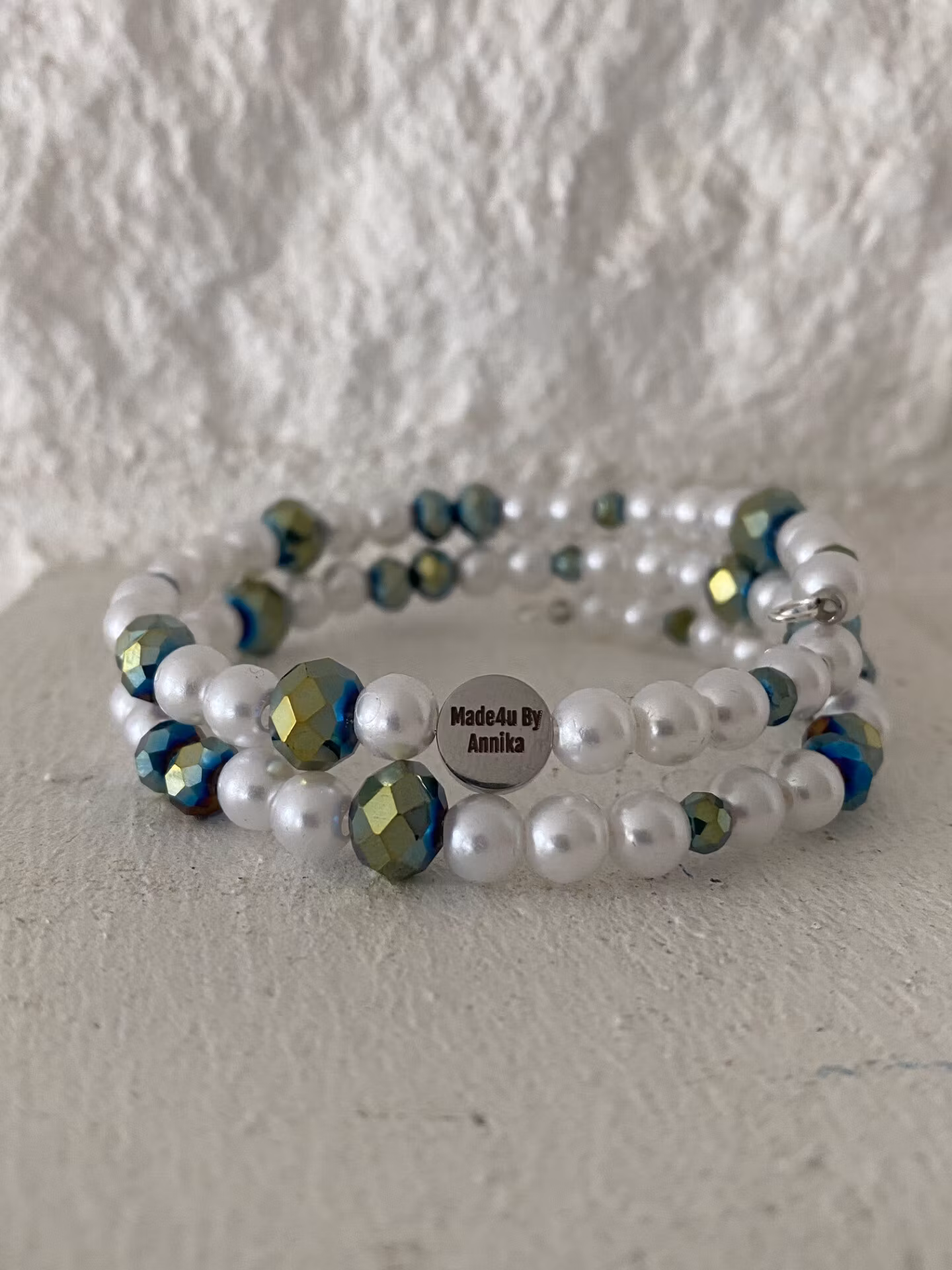 Vackert och lyxigt armband i treradigt mönster av blandat kritvita blanka pärlor och grönturkos spegelblanka facetterade glaskristallpärlor.