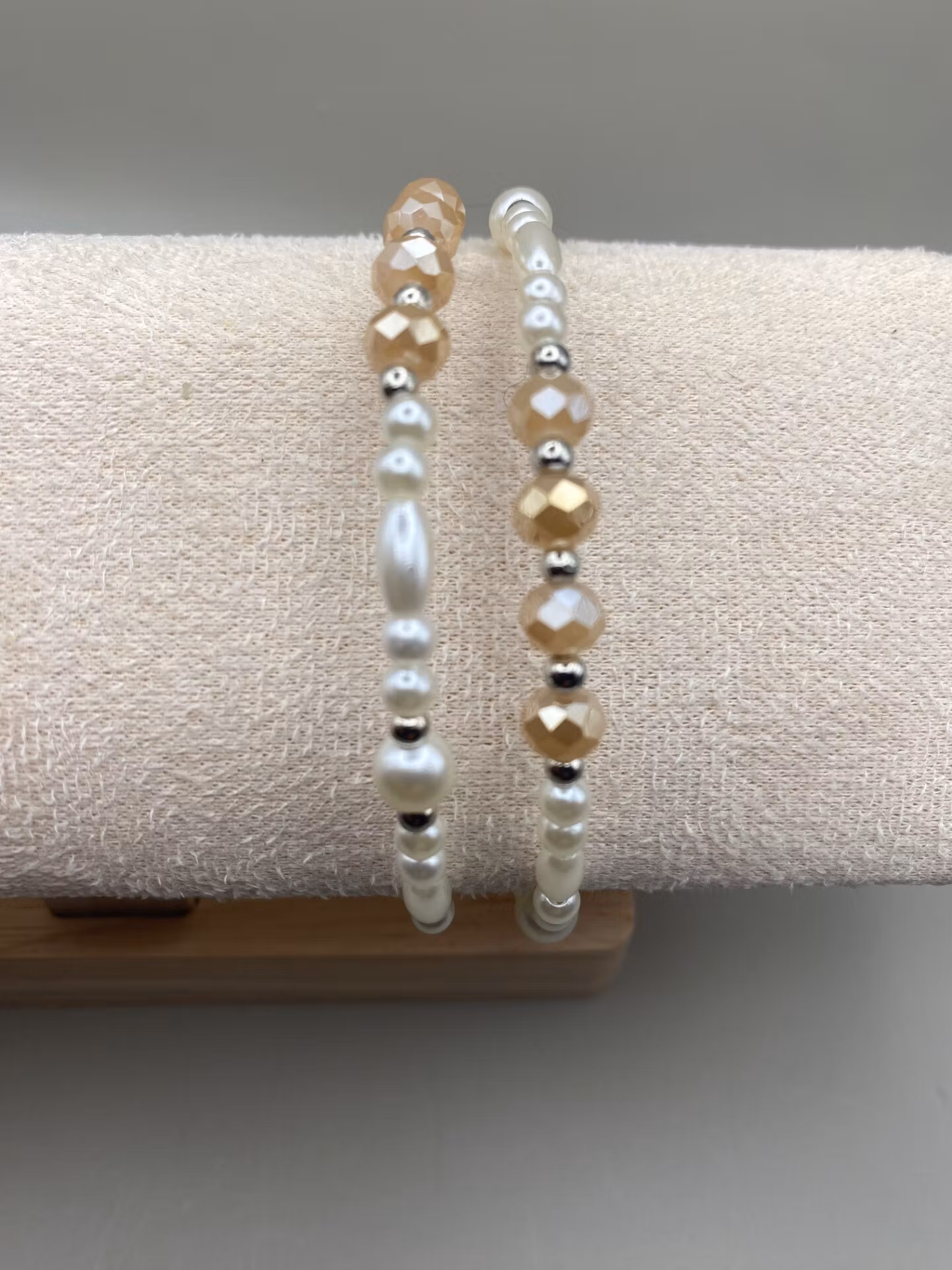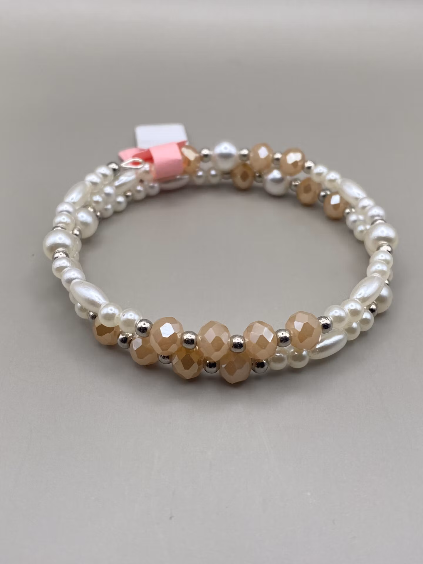 Vackert och lyxigt armband i tvĺradigt mönster av blandat kritvita blanka pärlor i olika storlekar, silverfärgade smĺ pärlor och beiga högblanka facetterade glaskristall pärlor.