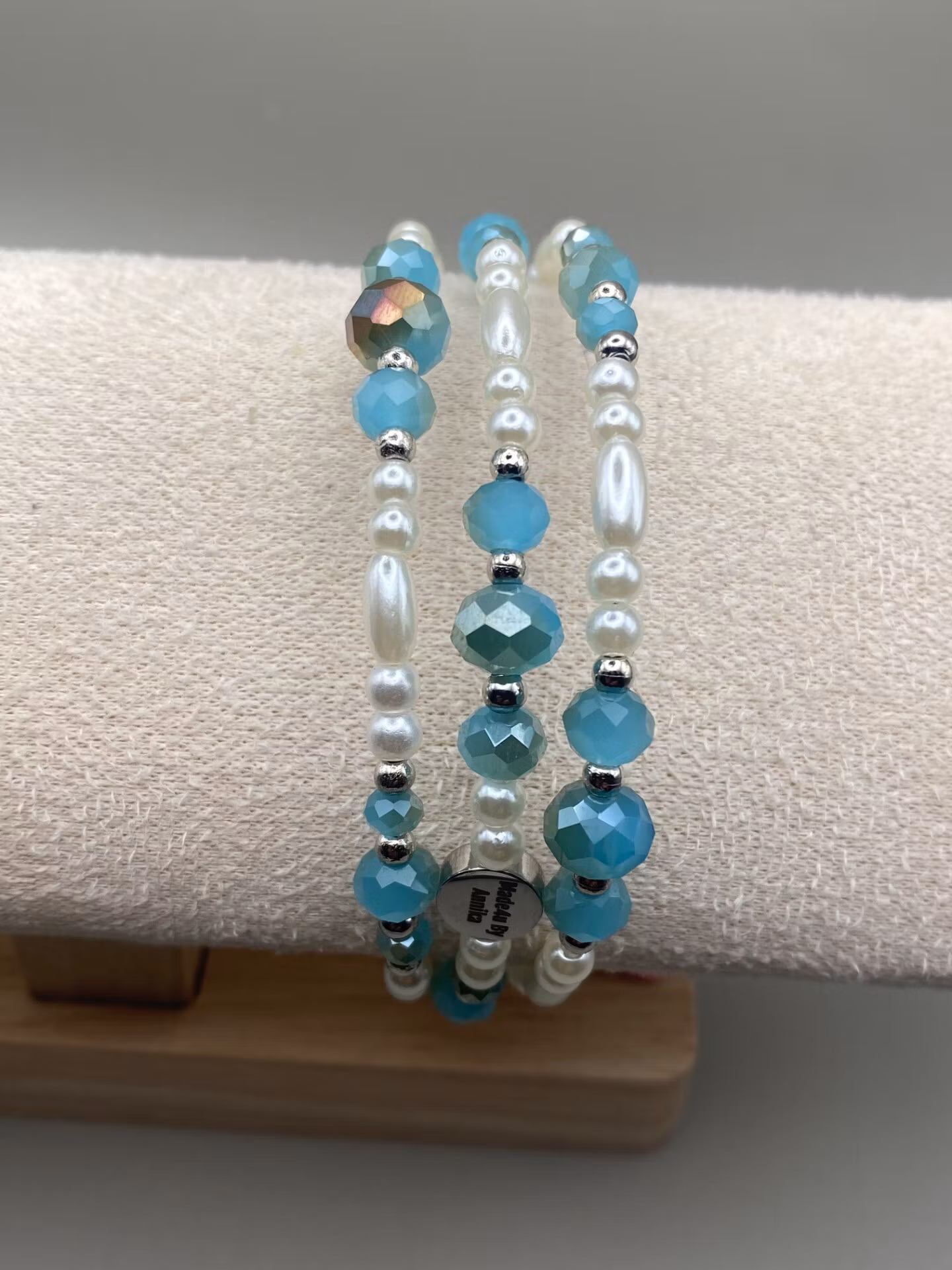 Vackert och lyxigt armband i Treradigt mönster av av blandat kritvita blanka pärlor i olika storlekar, silverfärgade smĺ pärlor och turkos-och grĺmellerade facetterade glaskristall pärlor.
