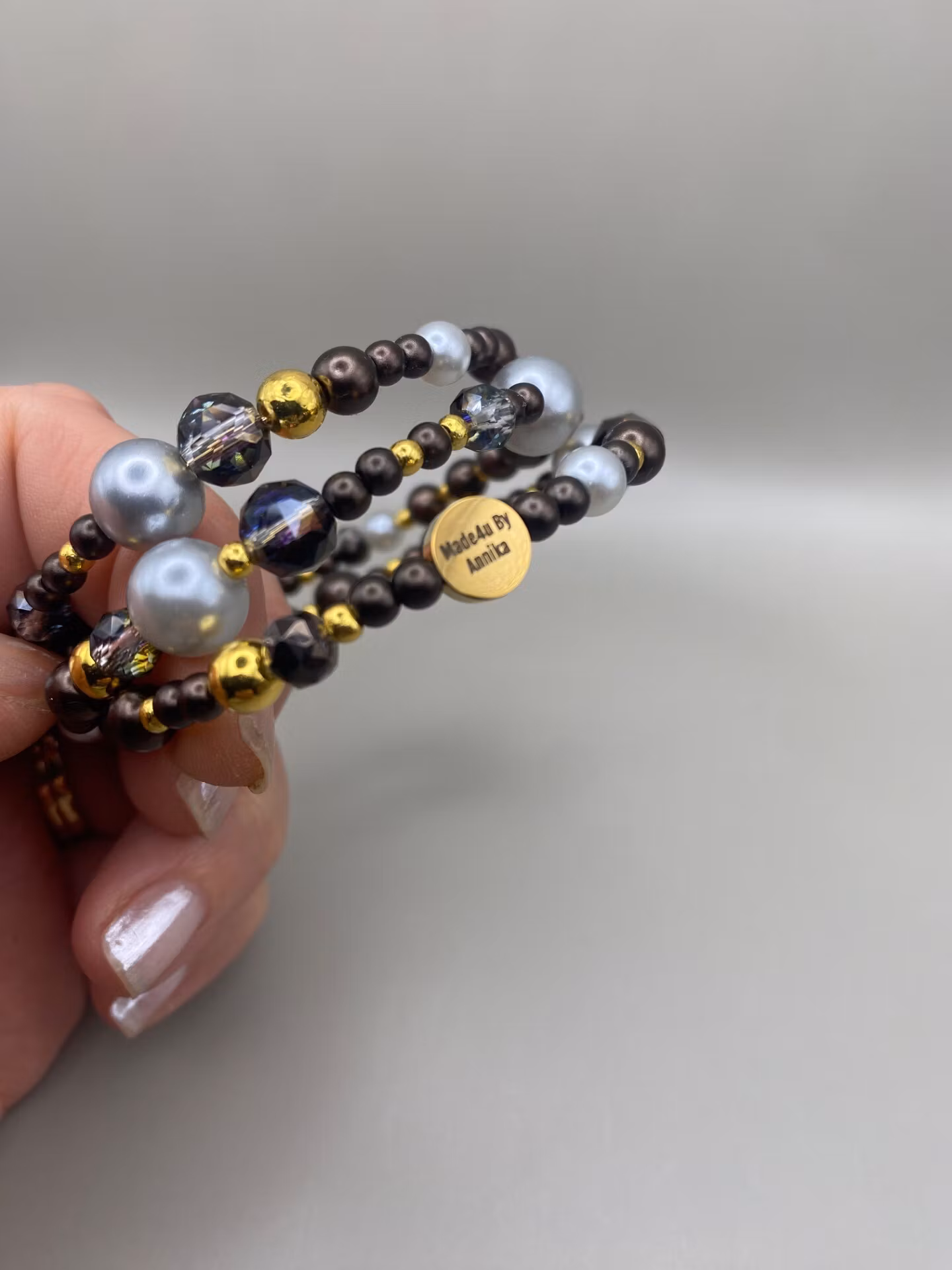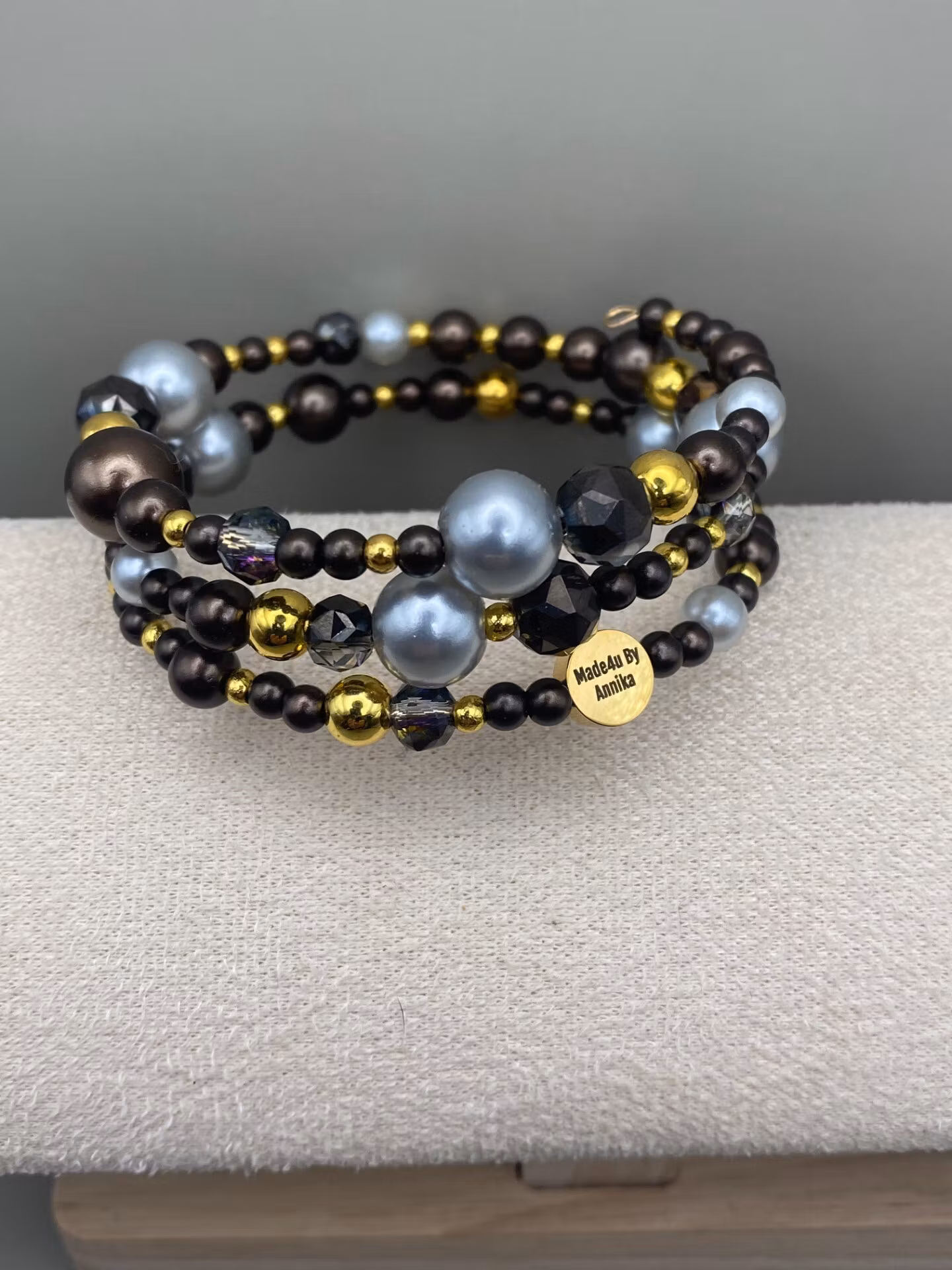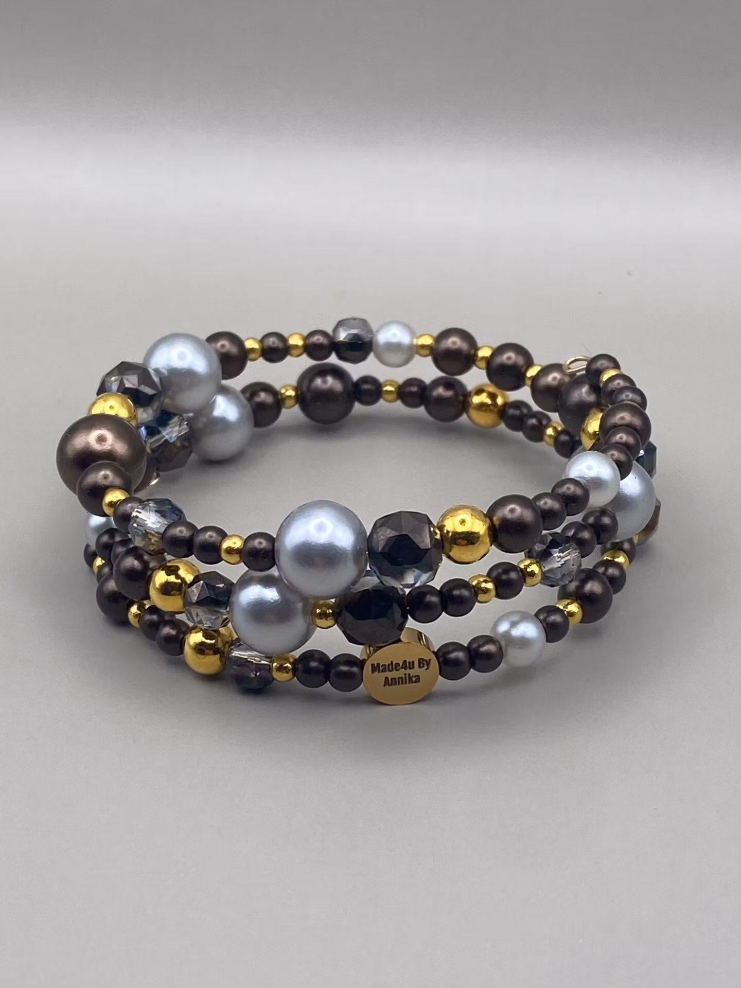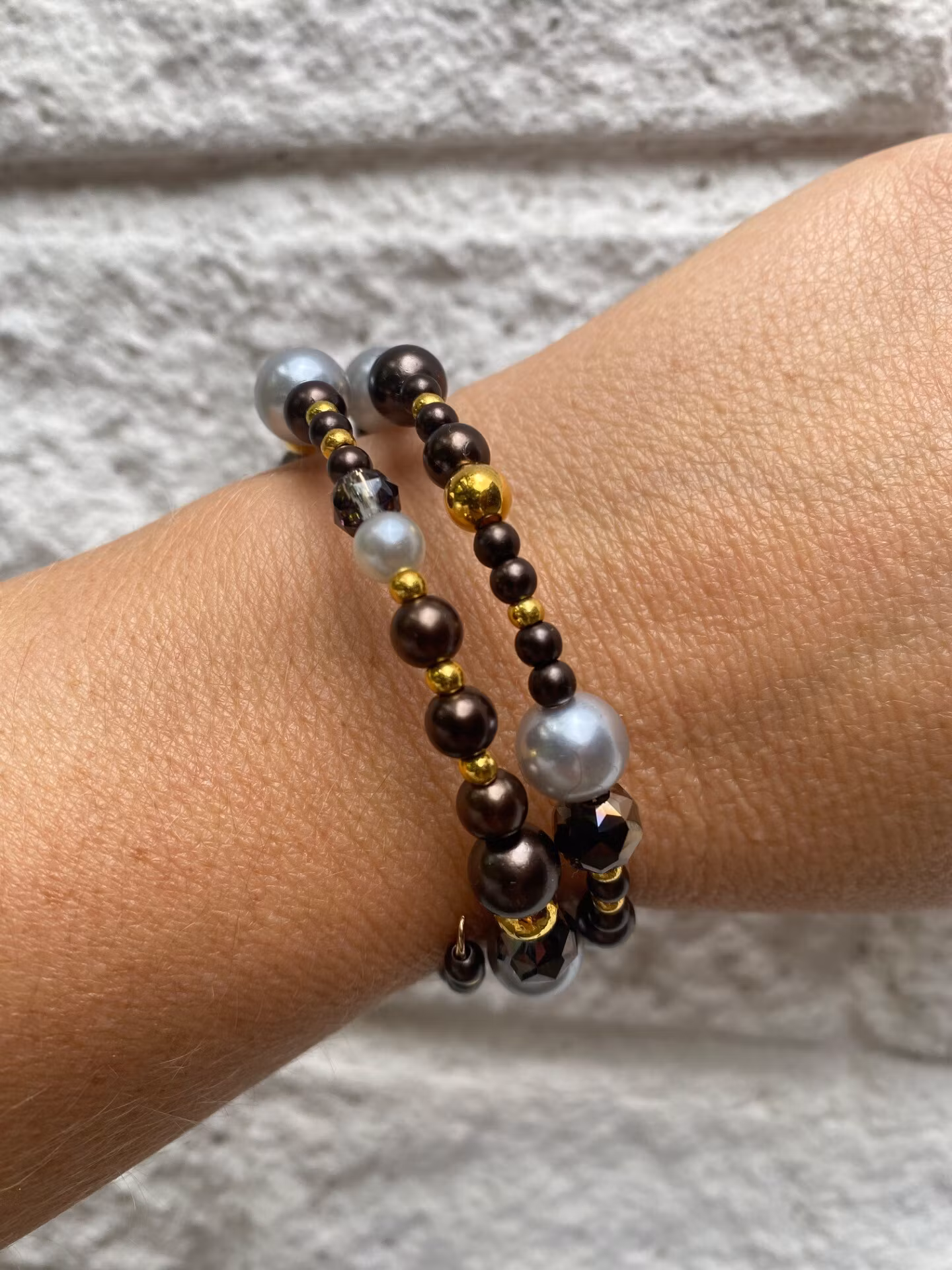 Vackert och lyxigt armband i tvĺradigt mönster av av blandat glansiga kaffebruna smĺ och stora pärlor, stora och smĺ guldfärgade pärlor, ljusgrĺ silverfärgade stora pärlor och rökfärgade facetterade glaskristallpärlor