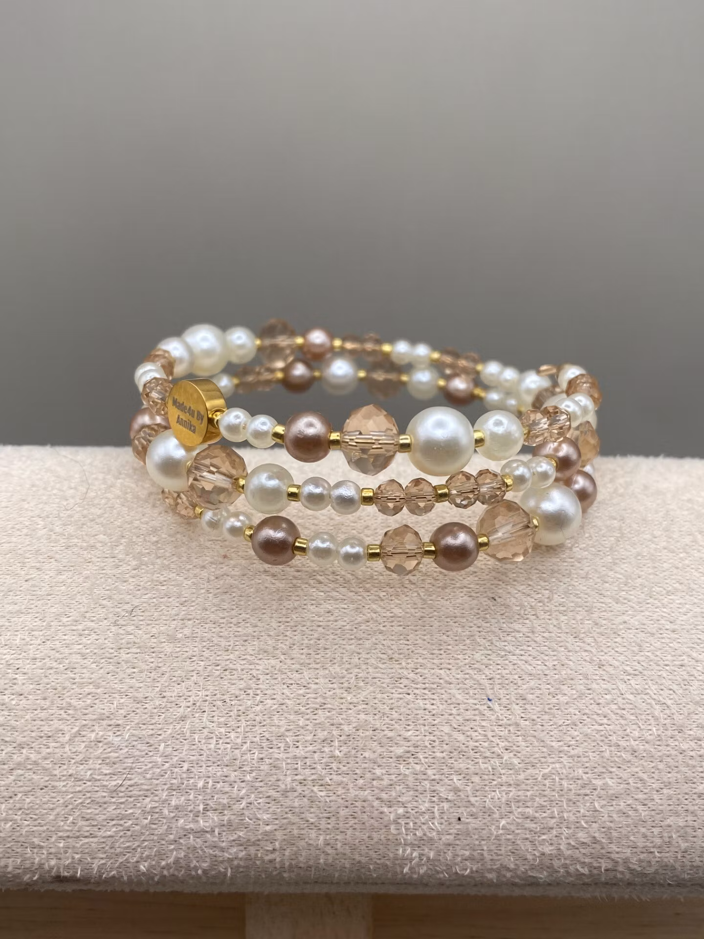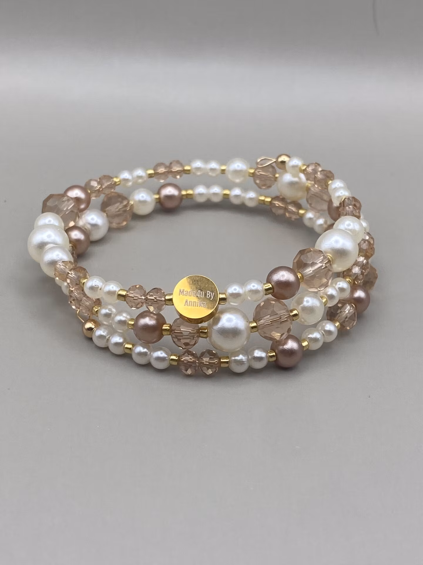 Vackert och lyxigt armband i tvĺradigt (tre ĺt ena hĺllet) mönster av benvita och beiga pärlor, champagnefärgade glaskristall pärlor och guldfärgade smĺ glaspärlor.