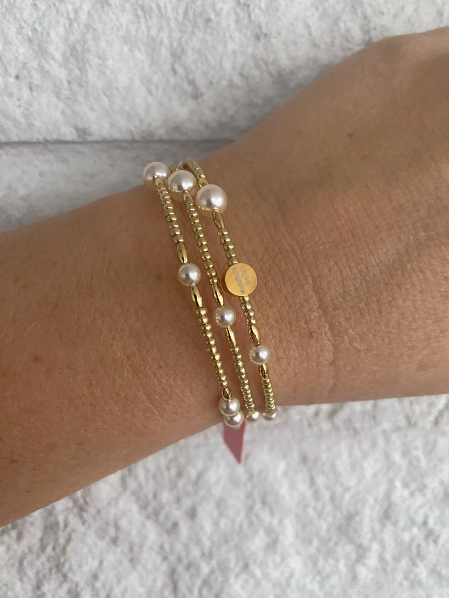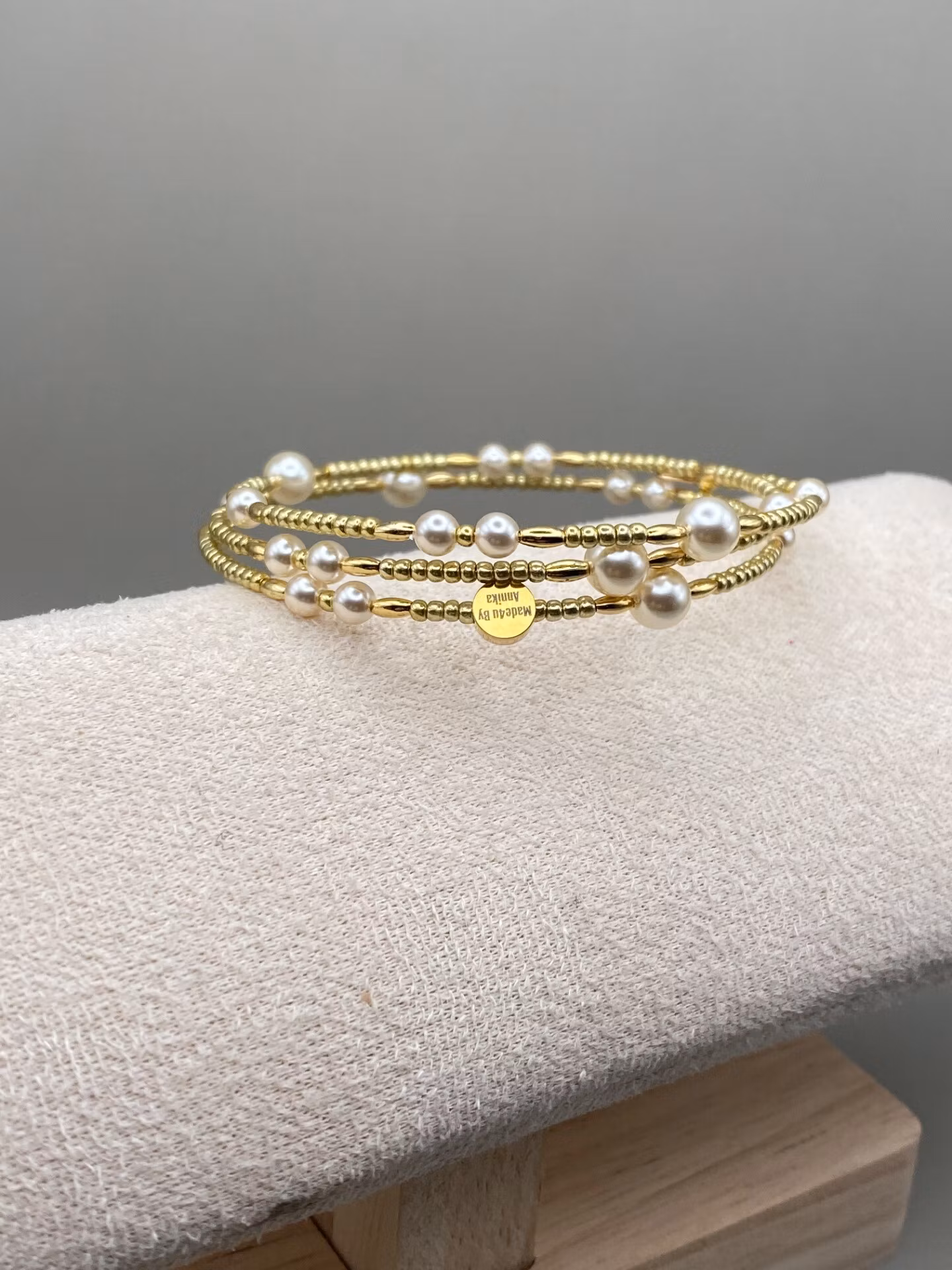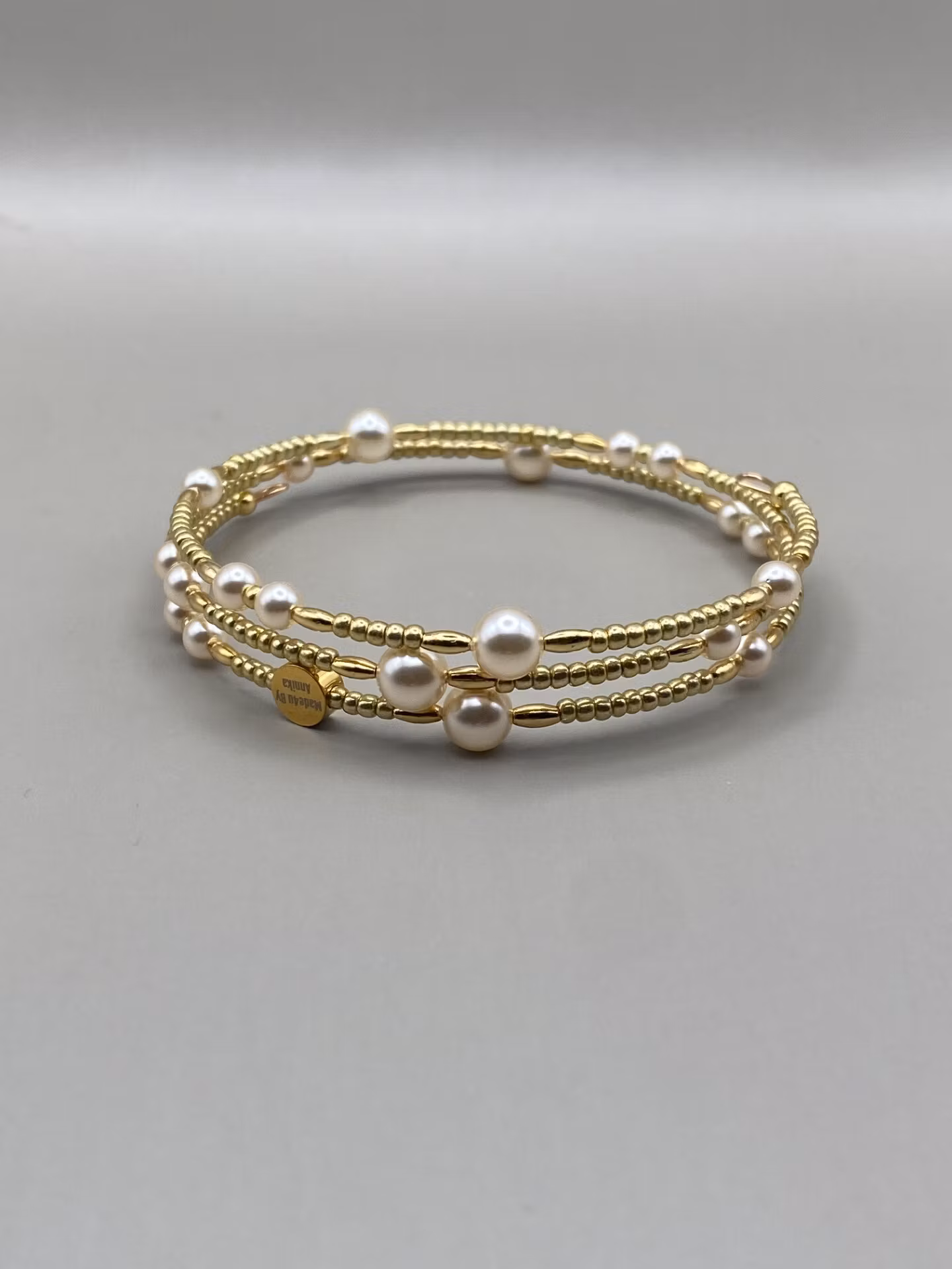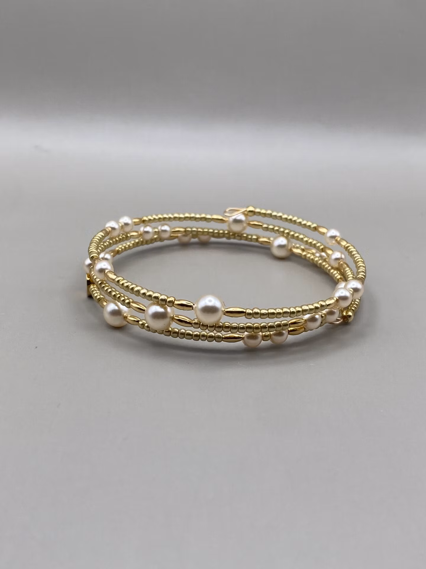 Vackert, lyxigt och stilrent spiralarmband i tvĺradigt (tre ĺt ena hĺllet) mönster av benvita glaspärlor och smĺ guldfärgade glaspärlor.