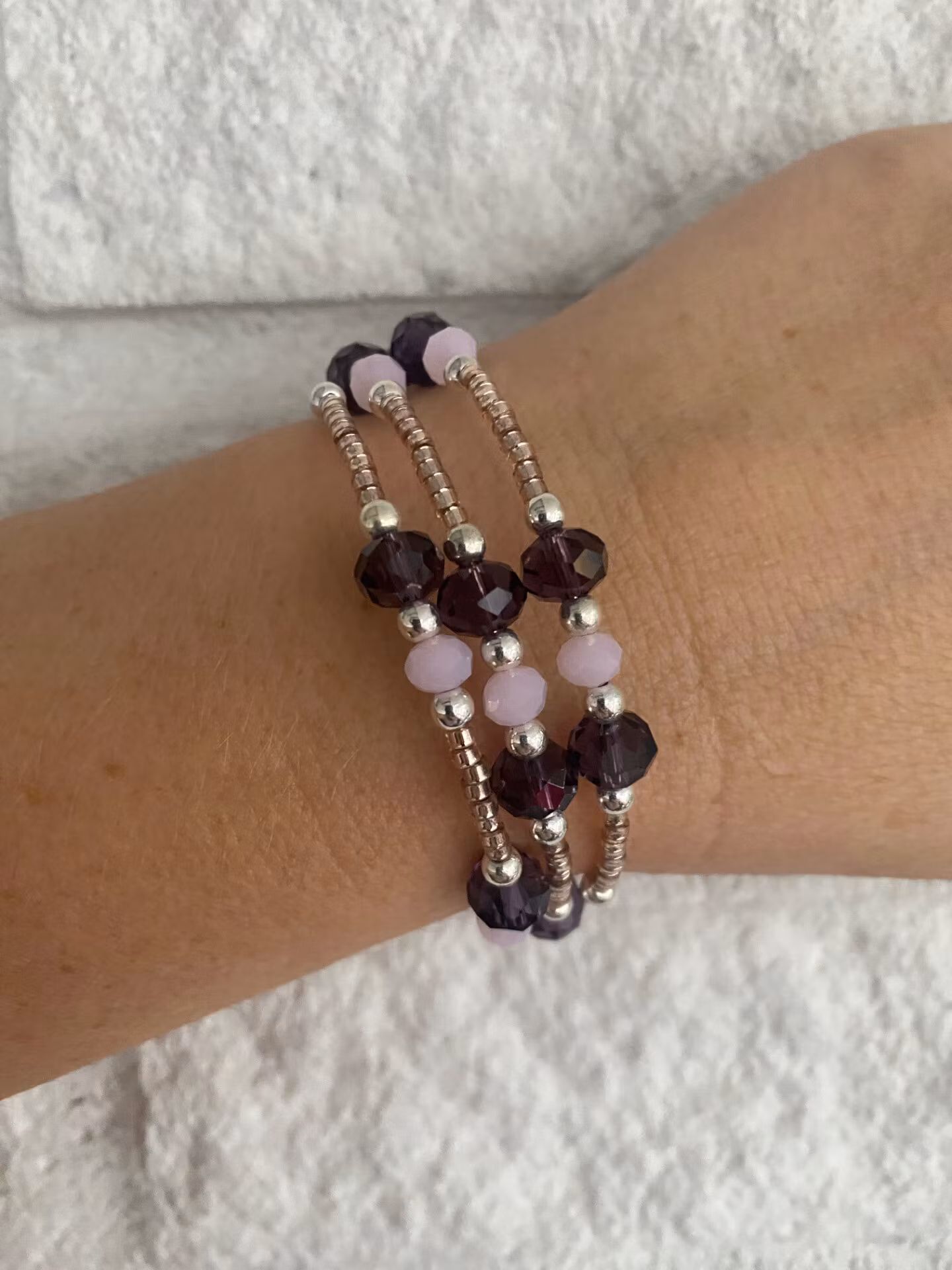 Fint lila och ljusrosa flexibelt spiralarmband tvĺradigt (tre ĺt ena hĺllet) mönster av varvat lila och ljusrosa facetterade glaskristallpärlor och smĺ roséfärgade smĺ glaspärlor.