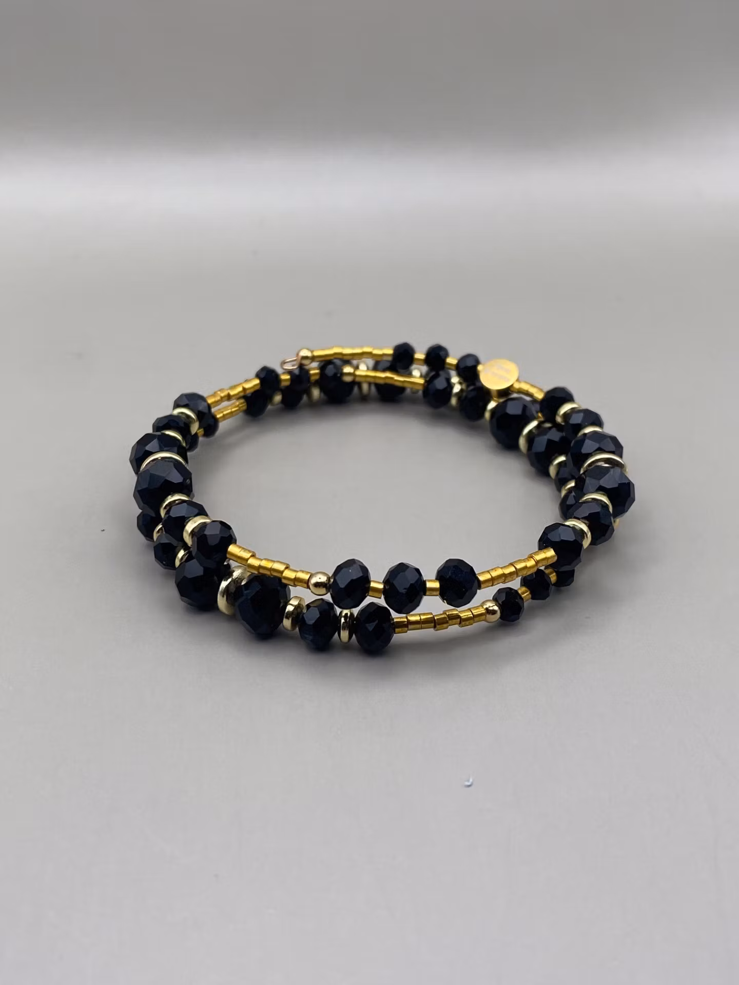 Vackert armband i svart och guld. Flexibelt tvĺradigt spiralarmband (tre ĺt ena hĺllet, gĺr att välja vilken sida man vill ha framĺt) med mönster av varvat högblanka svarta facetterade glaskristallpärlor i olika storlekar och guldfärgade distanser och smĺ guldfärgade glaspärlor.