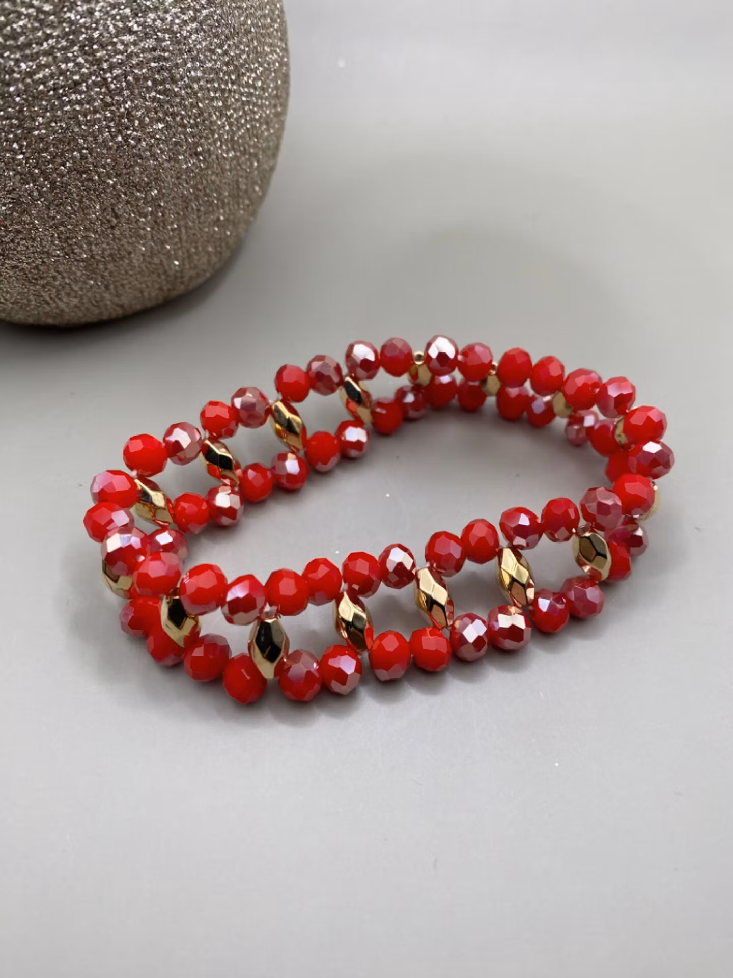 Vackert lyxigt rött armband i brett mönster rödmellerade fasetterade glaspärlor och guldfärgade avlånga skimrande guldfärgade pärlor. Pärlor 6mmVisas produ