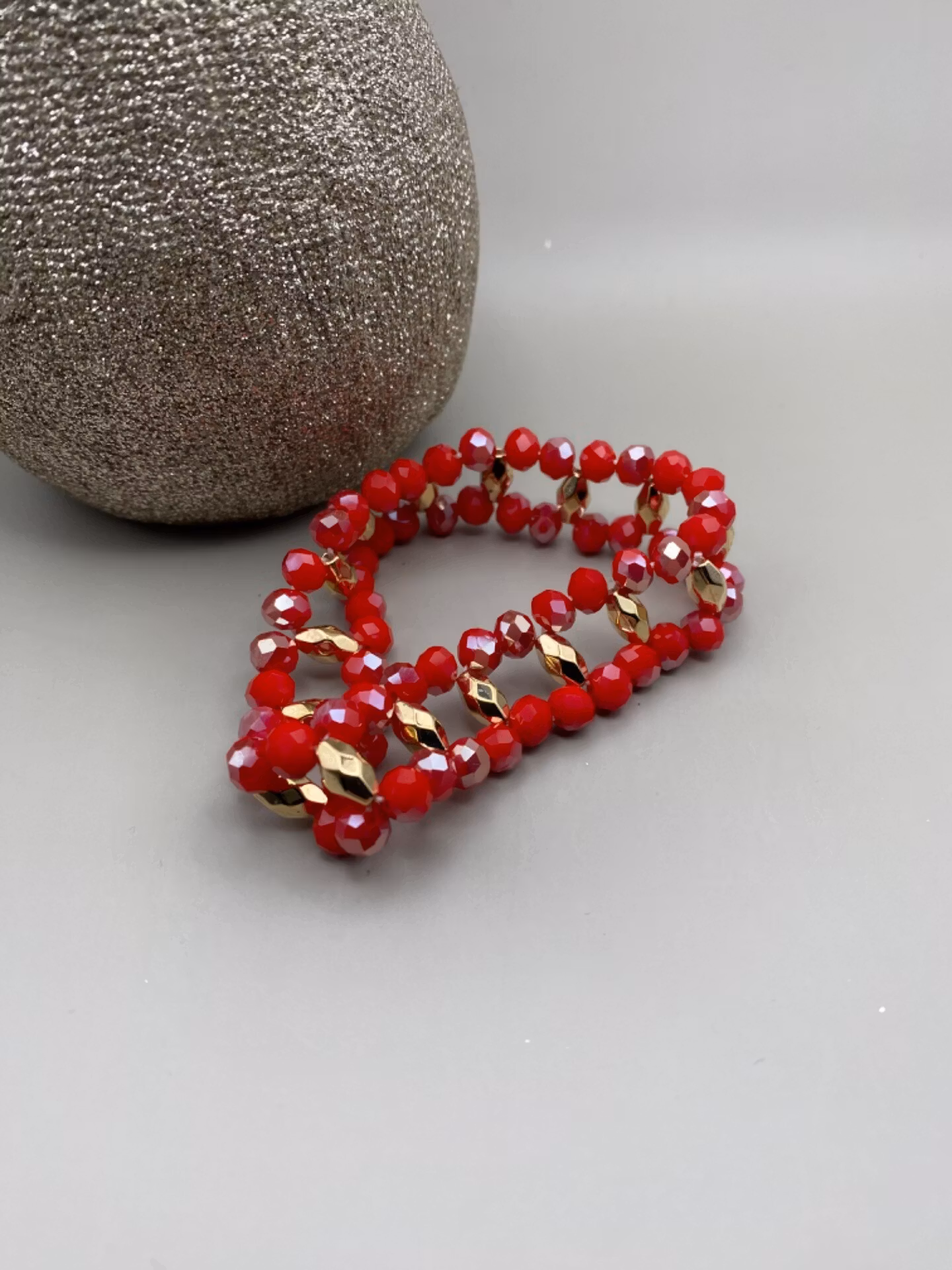 Vackert lyxigt rött armband i brett mönster rödmellerade fasetterade glaspärlor och guldfärgade avlånga skimrande guldfärgade pärlor.