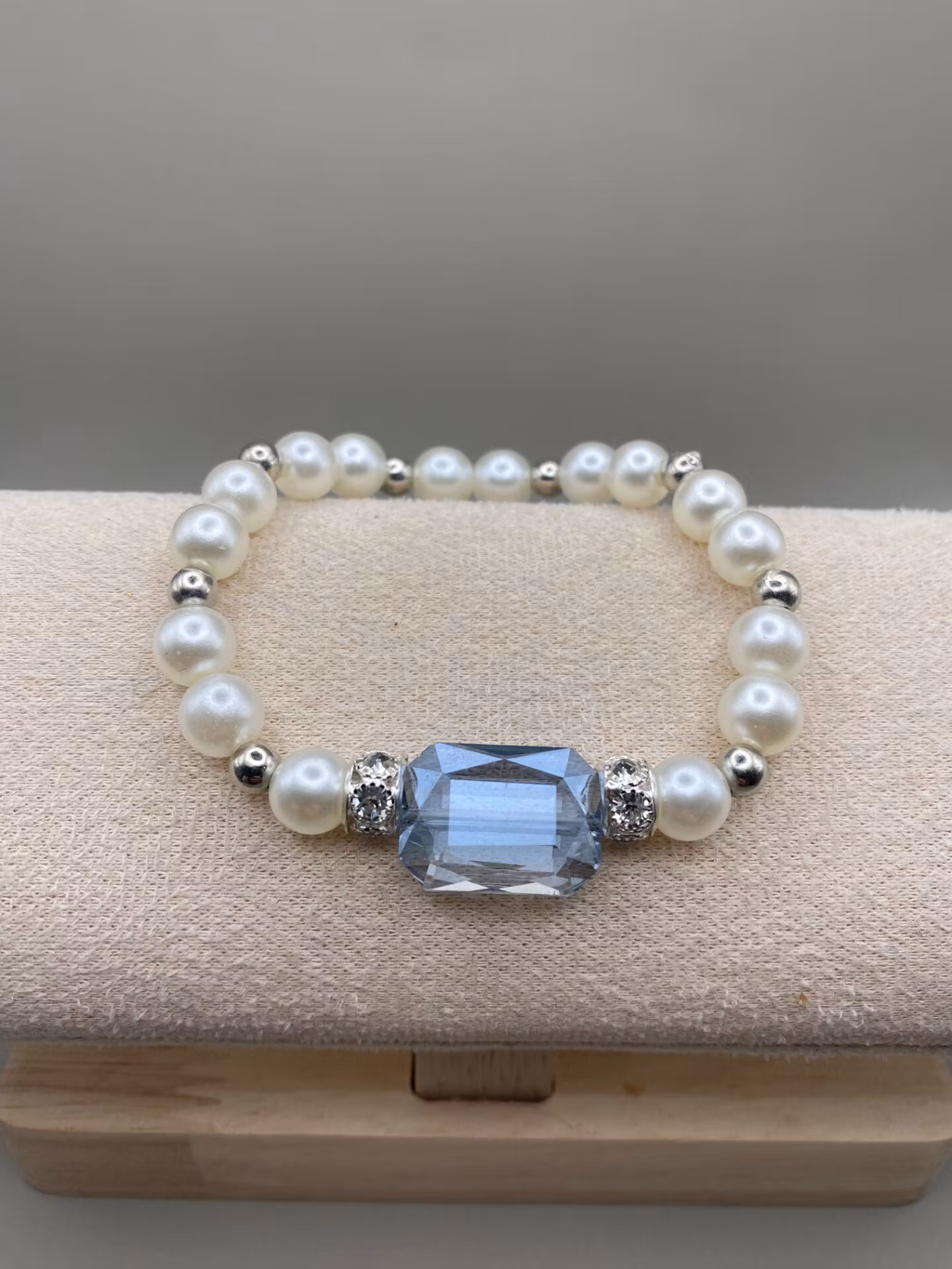 Vackert arbmand i elfenbensvita blanka stora pärlor i varvat fint mönster med silverfärgade mindre pärlor där en stor platt rektangulär svagt ljusblå glaskristallpärla och strass står i blickfånget.