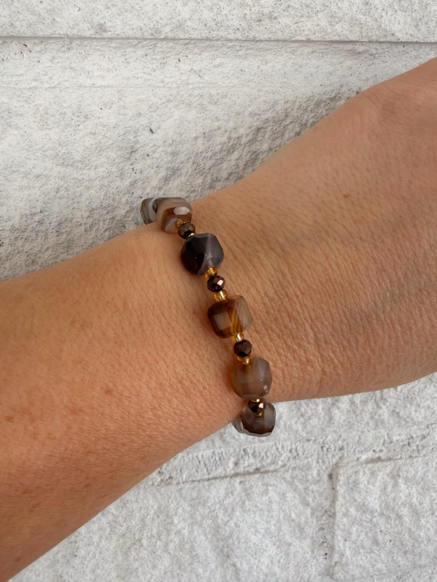 Vackert harmonsikt armband i lekfullt mönster av naturbruna Agatsten pärlor och ljusbruna glaspärlor och bruna facetterade glaskristallpärlor.