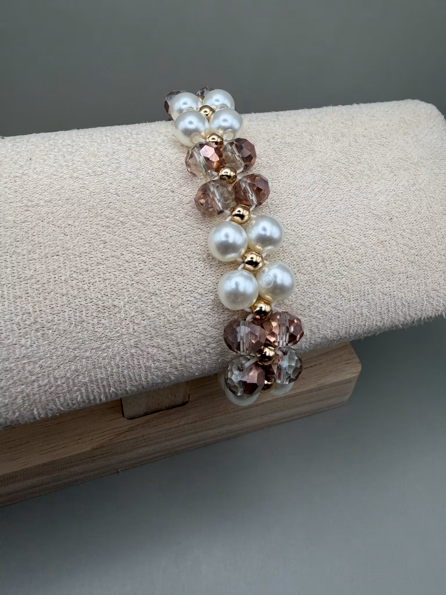 Ett vackert och brett tvåradigt armband med ett skimrande mönster av aprikosmelerade facetterade glaskristallpärlor och högblanka beiga pärlor, varvat med små guldfärgade detaljer som ger en elegant och lyxig känsla.