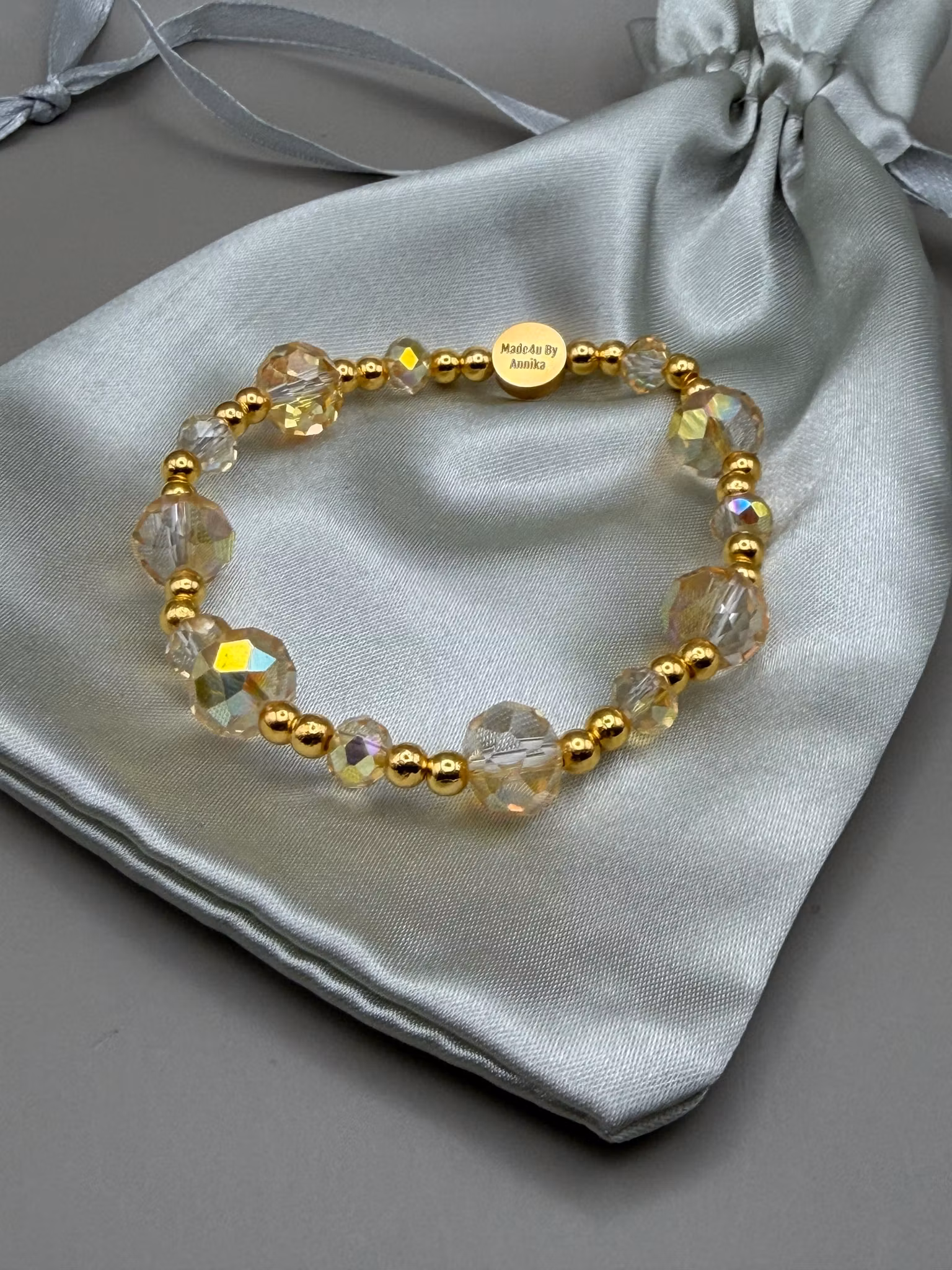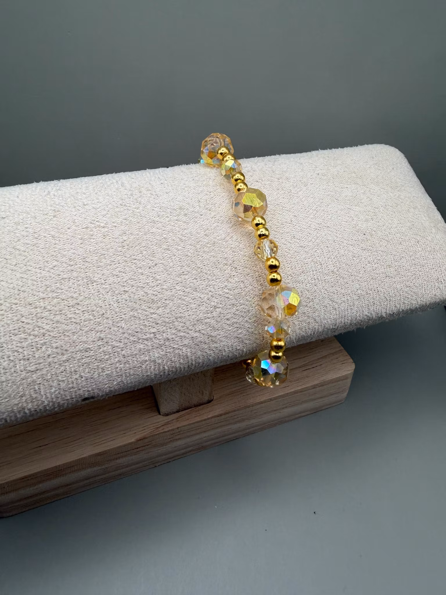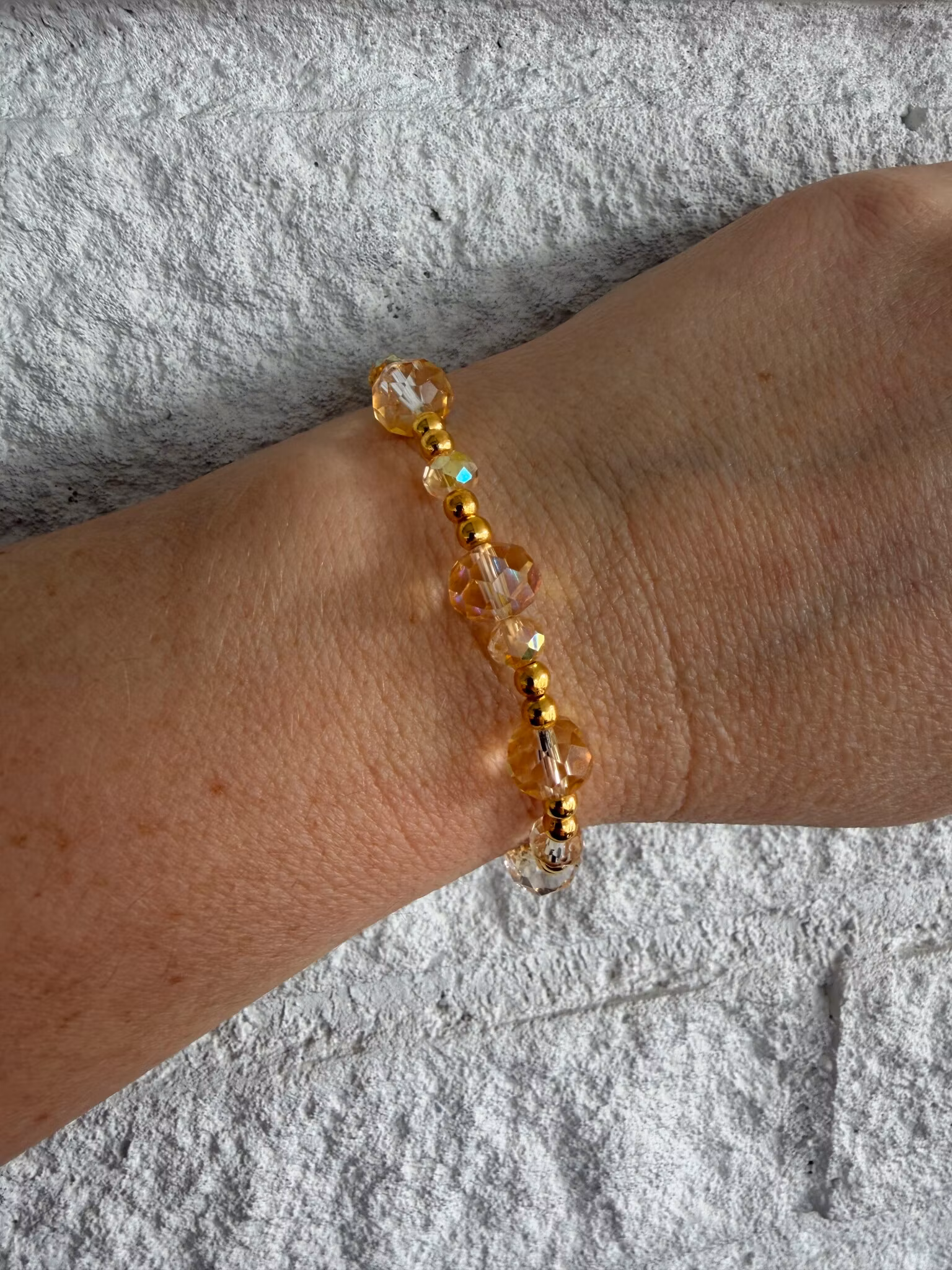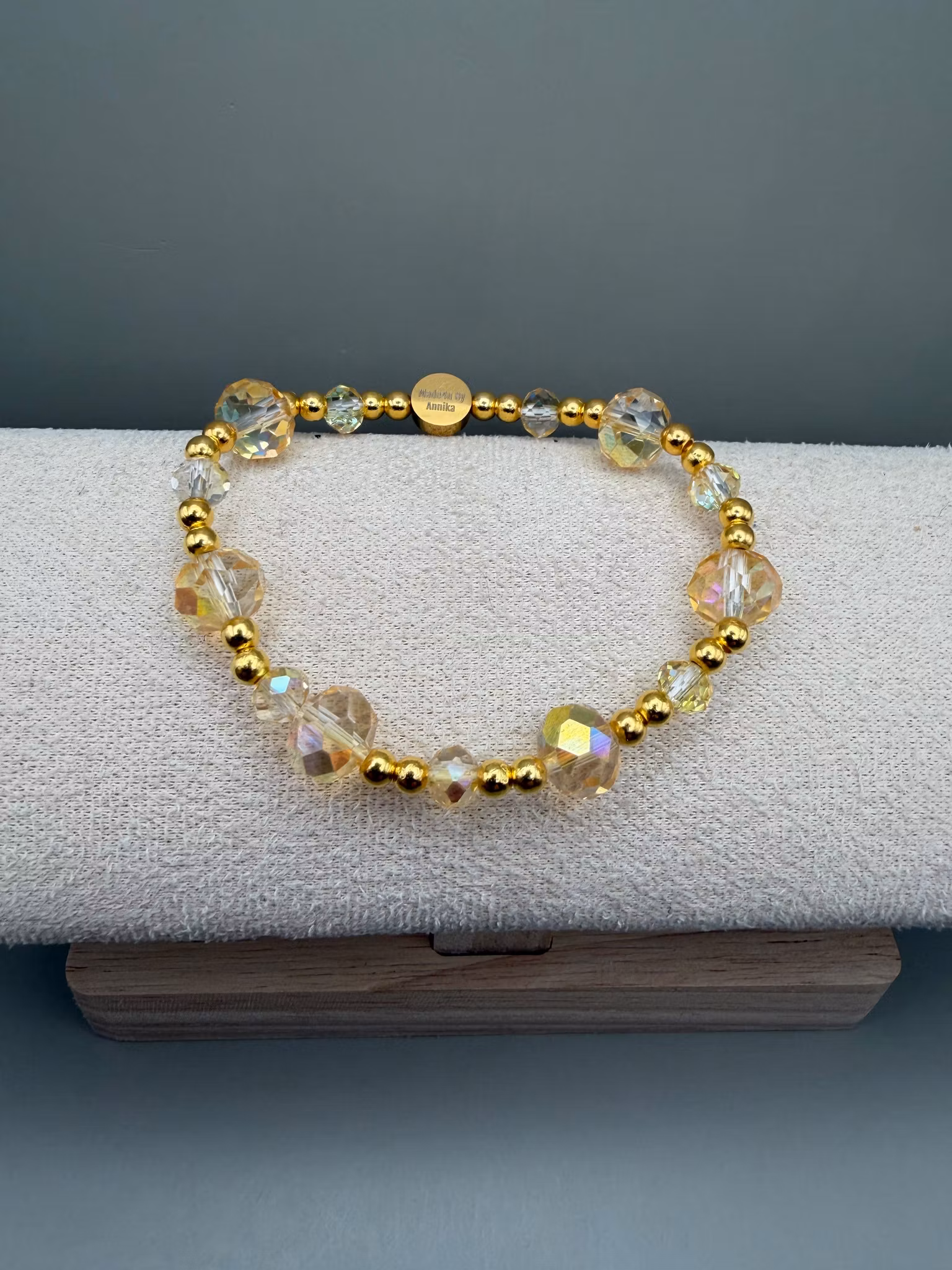 Ett vackert skimrande pärlarmband med ett vackert mönster av gul- och guldskimrande facetterade glaskristallpärlor och små guldfärgade pärlor som ger en elegant och lyxig känsla.