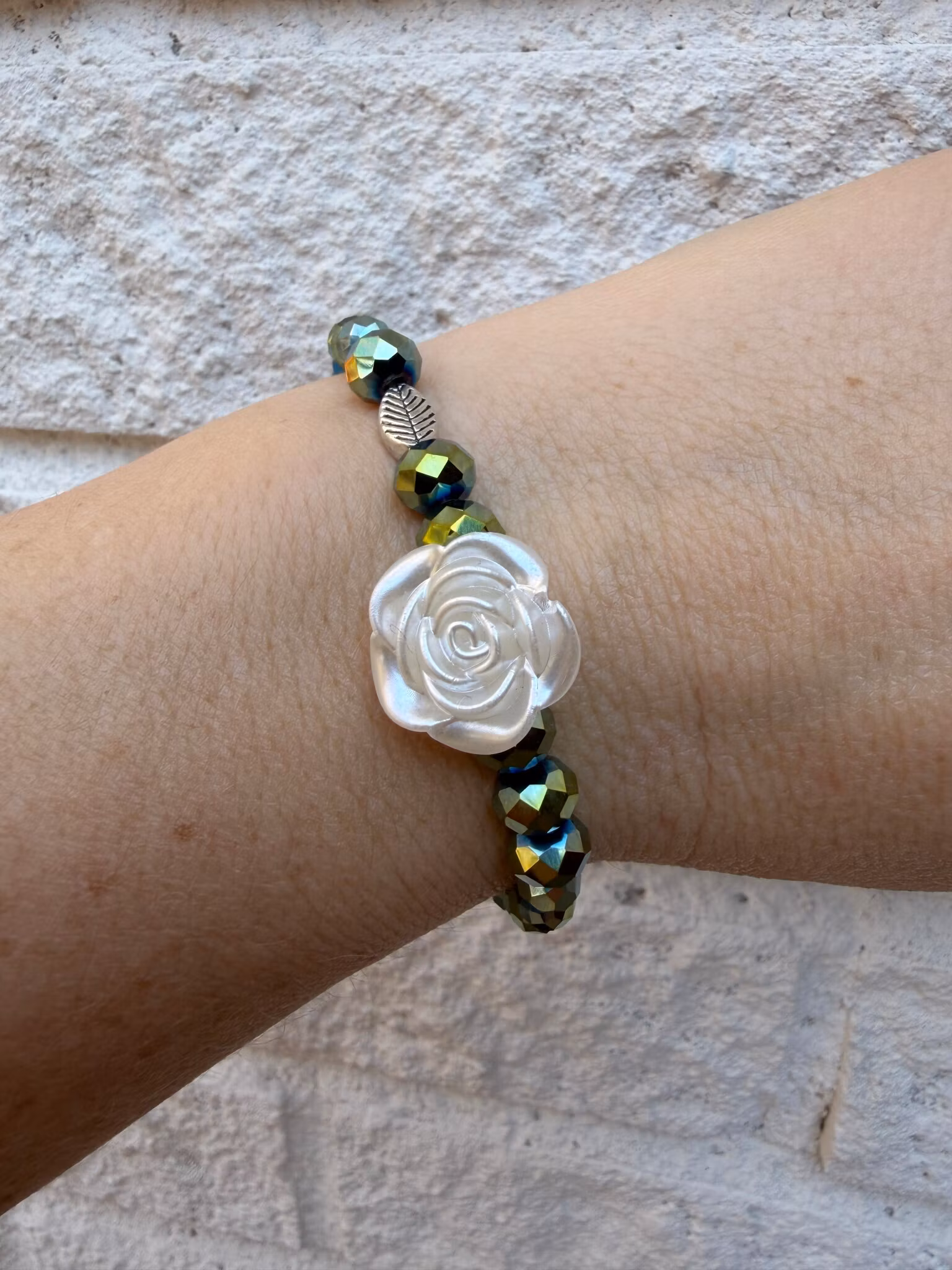 Ett elegant pärlarmband med grönmelerade facetterade glaskristallpärlor, smyckat med ett silvrigt löv och en vit ros som fångar blicken.