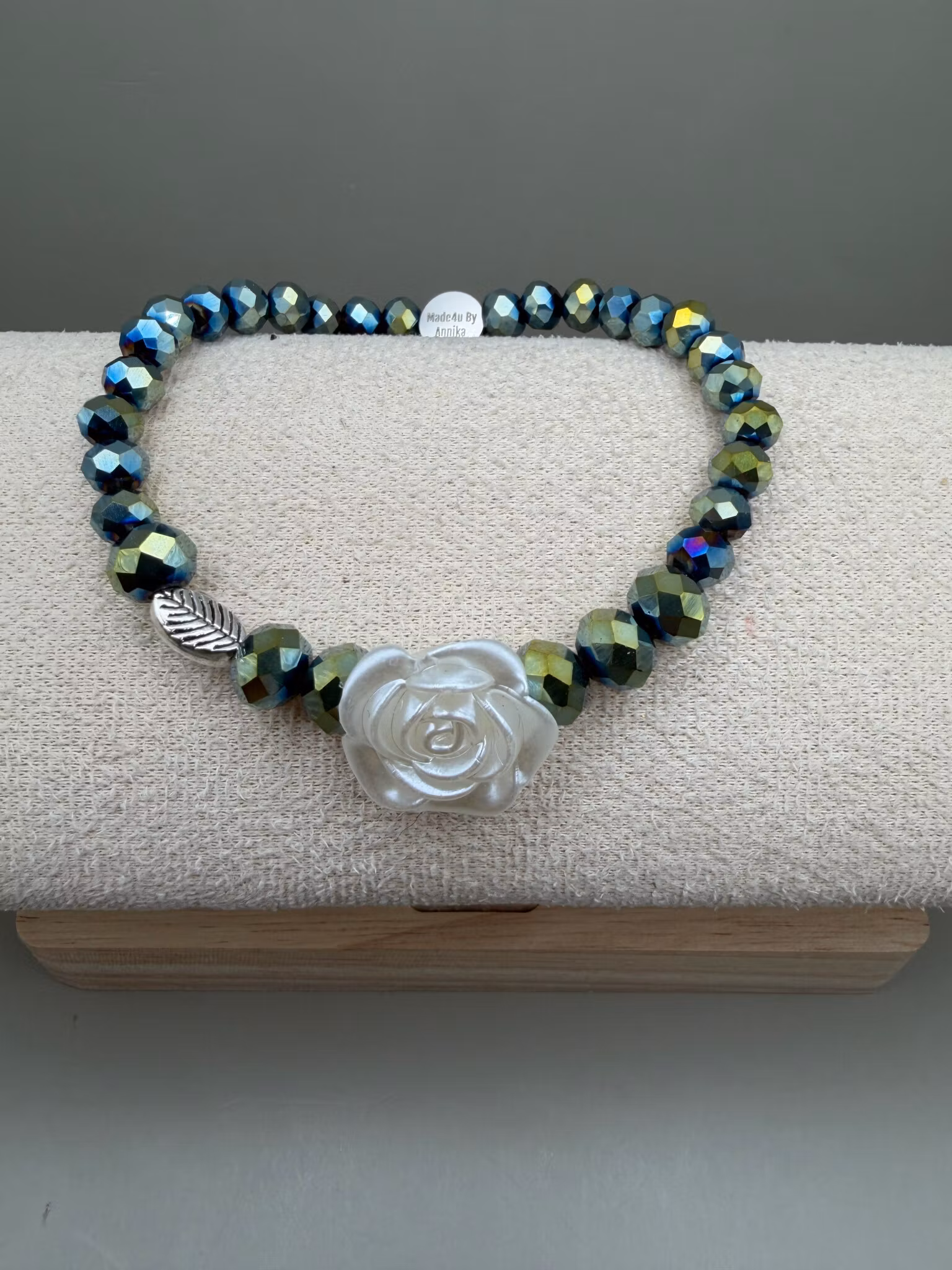 Ett elegant pärlarmband med grönmelerade facetterade glaskristallpärlor, smyckat med ett silvrigt löv och en vit ros som fångar blicken.Pärlor: 8mm, 6mm