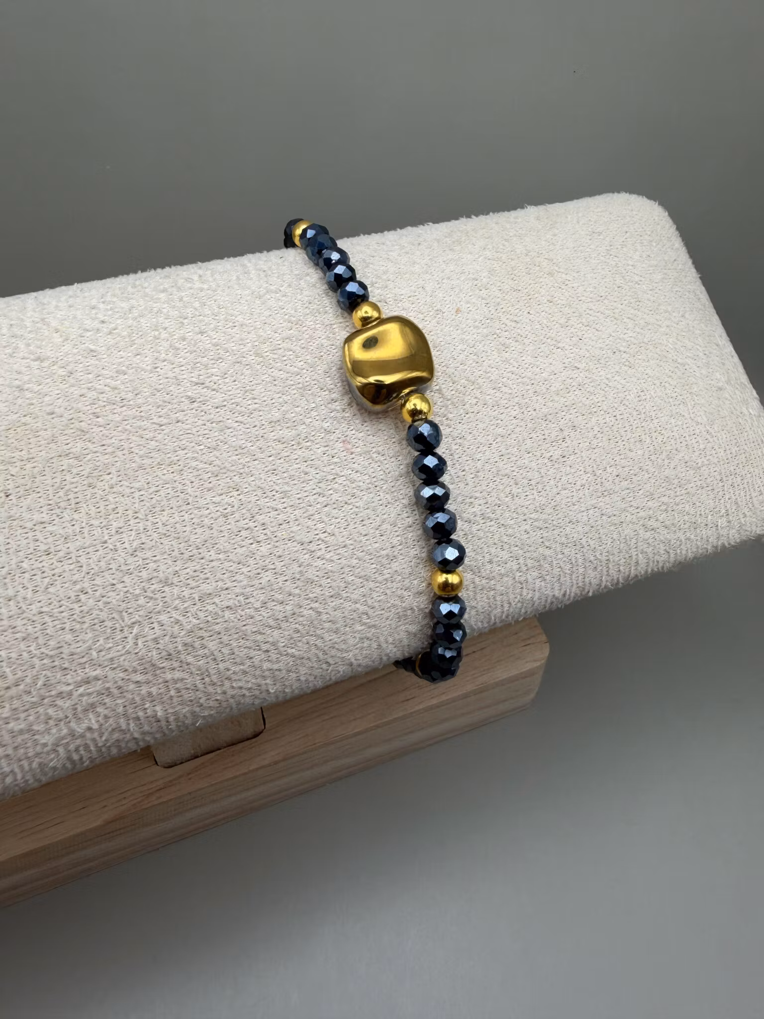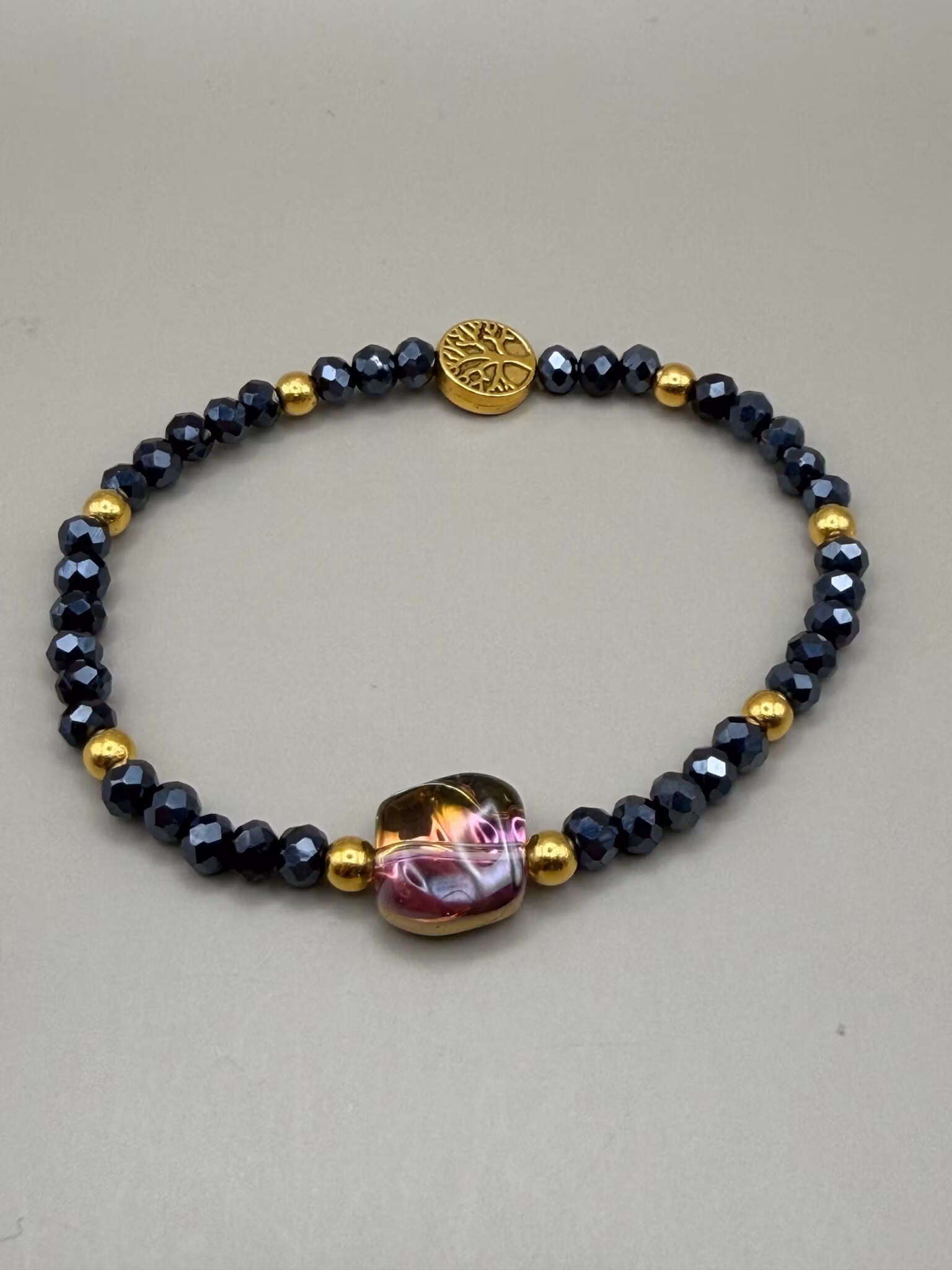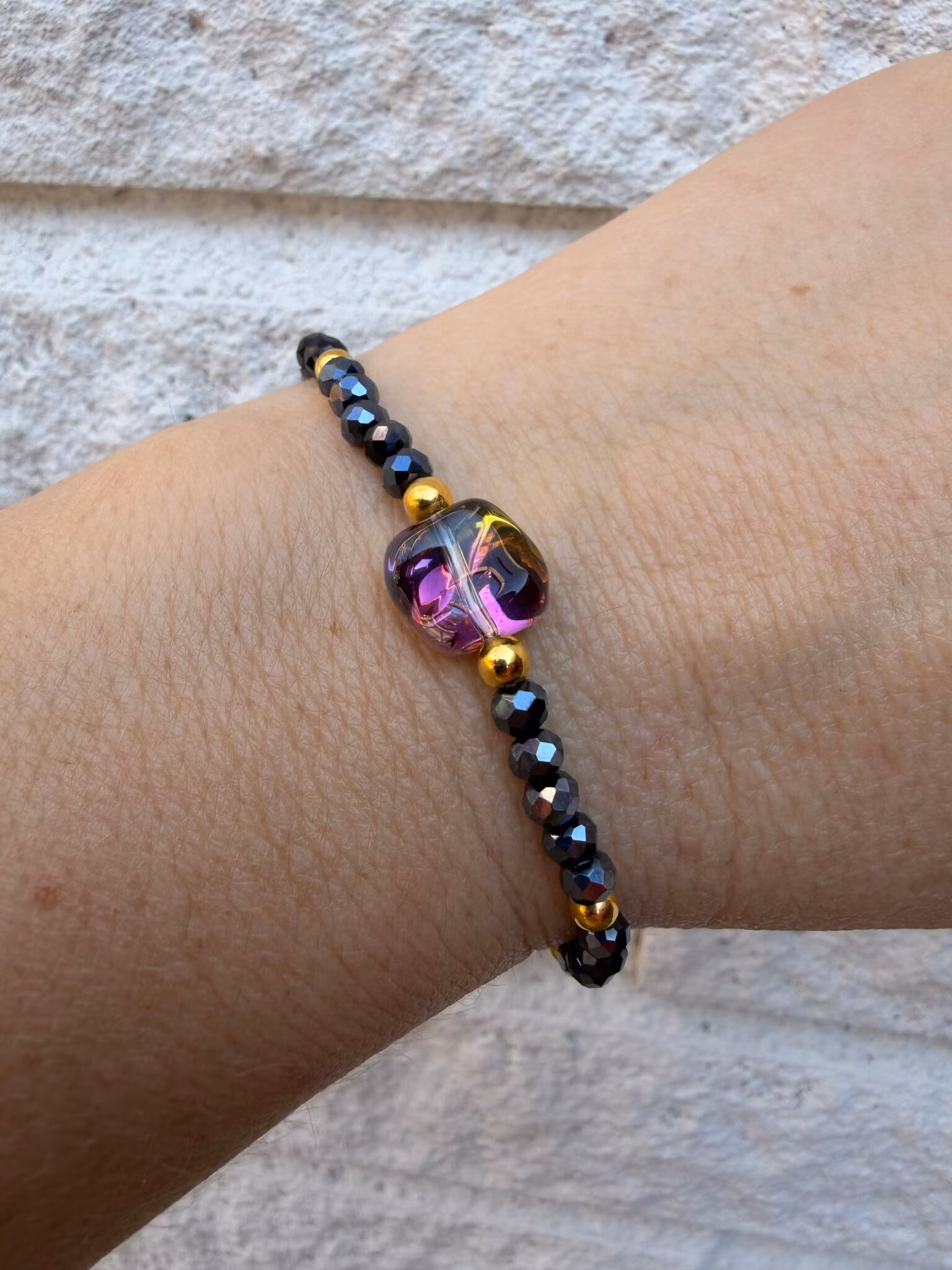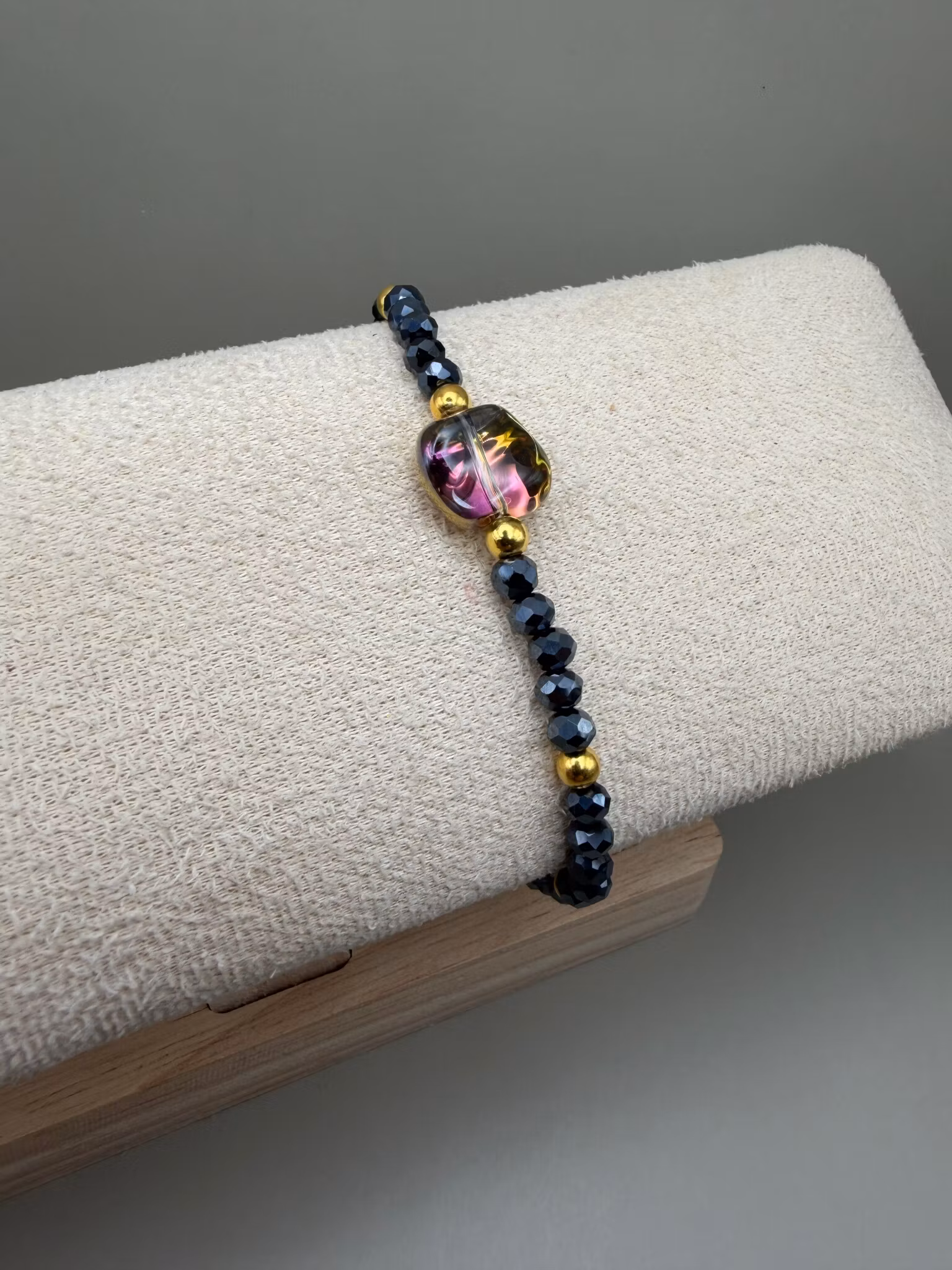 Ett elegant, smalt pärlarmband med små facetterade glaspärlor i djupa mörkblå nyanser. I mitten sitter en mjukt oregelbunden glaspärla som drar blicken till sig och blir smyckets naturliga fokuspunkt. Den fångar ljuset på ett levande sätt, där ena sidan skimrar i varmt guld och den andra i mjuka lila toner, vilket ger armbandet en subtil men unik kontrast och ett exklusivt uttryck.