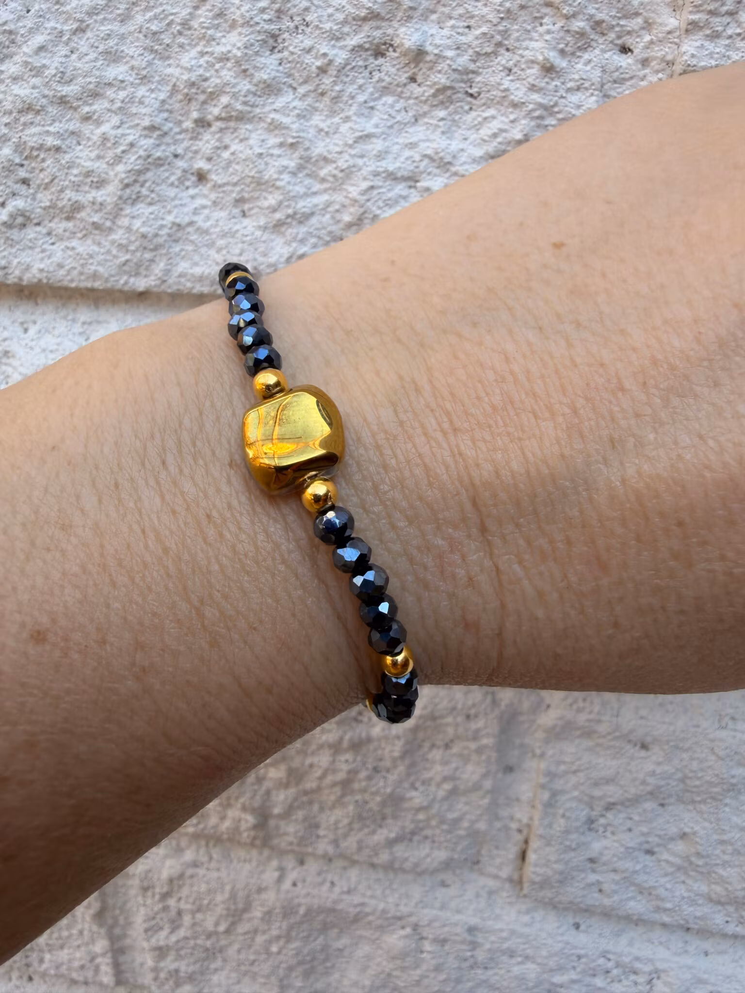 De elastiska armbanden jag skapar ska kännas bekväma, inte för tighta. Standardstorleken passar de flesta, men du kan välja en annan om du har smalare eller bredare handleder. Jag justerar då ditt armband genom att lägga till eller ta bort någon enstaka pärla. Viktigt för mig är att det känns rätt för dig.