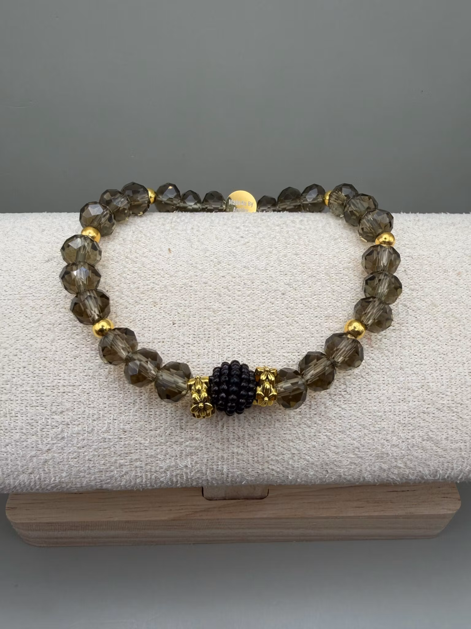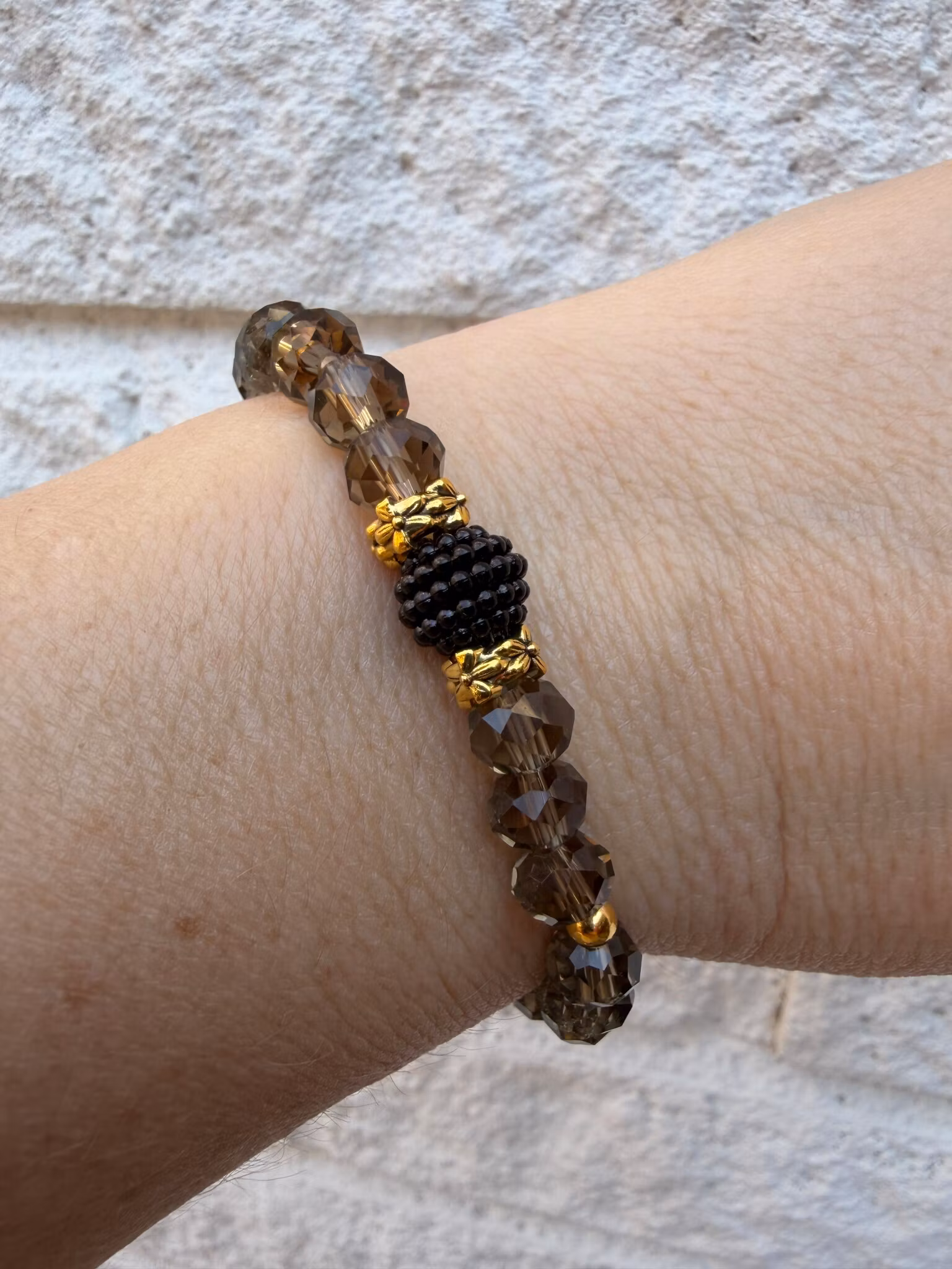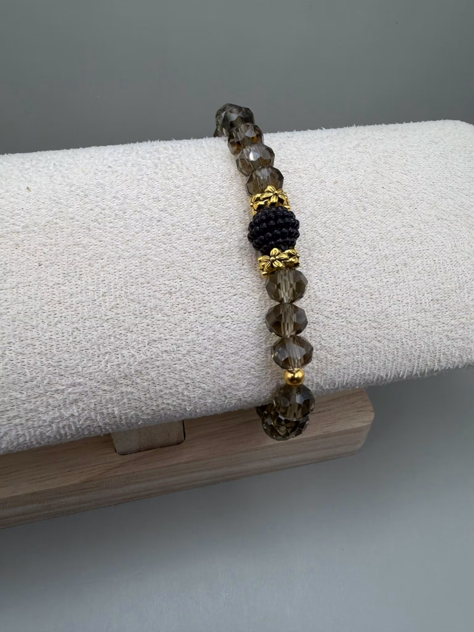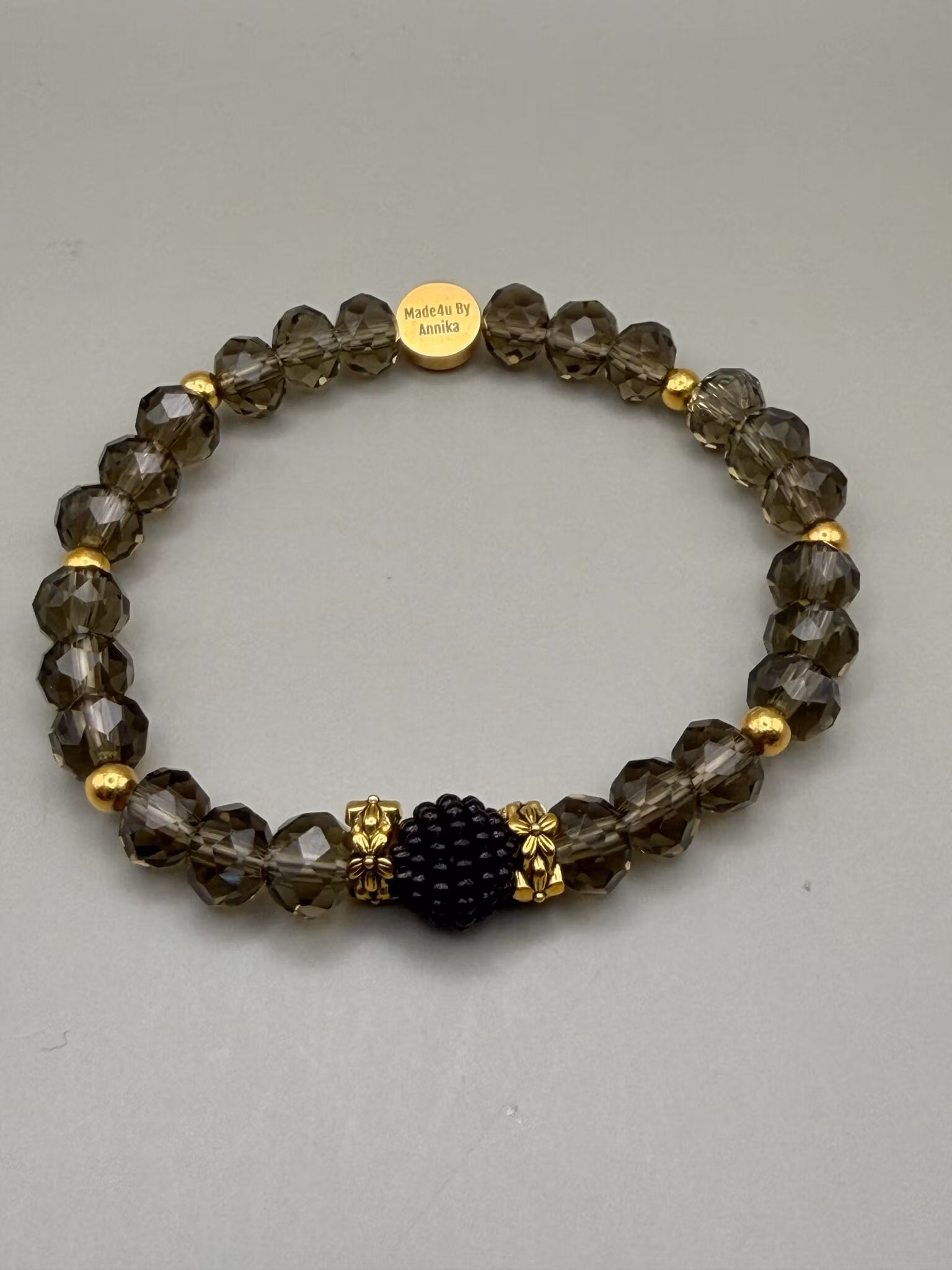 Ett elegant pärlarmband med stora facetterade glaspärlor i svart-grå nyans. I mitten ramas en knottrig svart pärla in av två guldfärgade distanser, avslutat med min signaturpärla för en unik och exklusiv känsla.