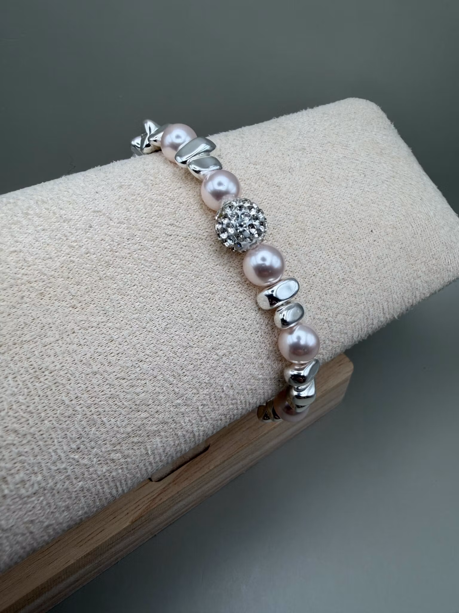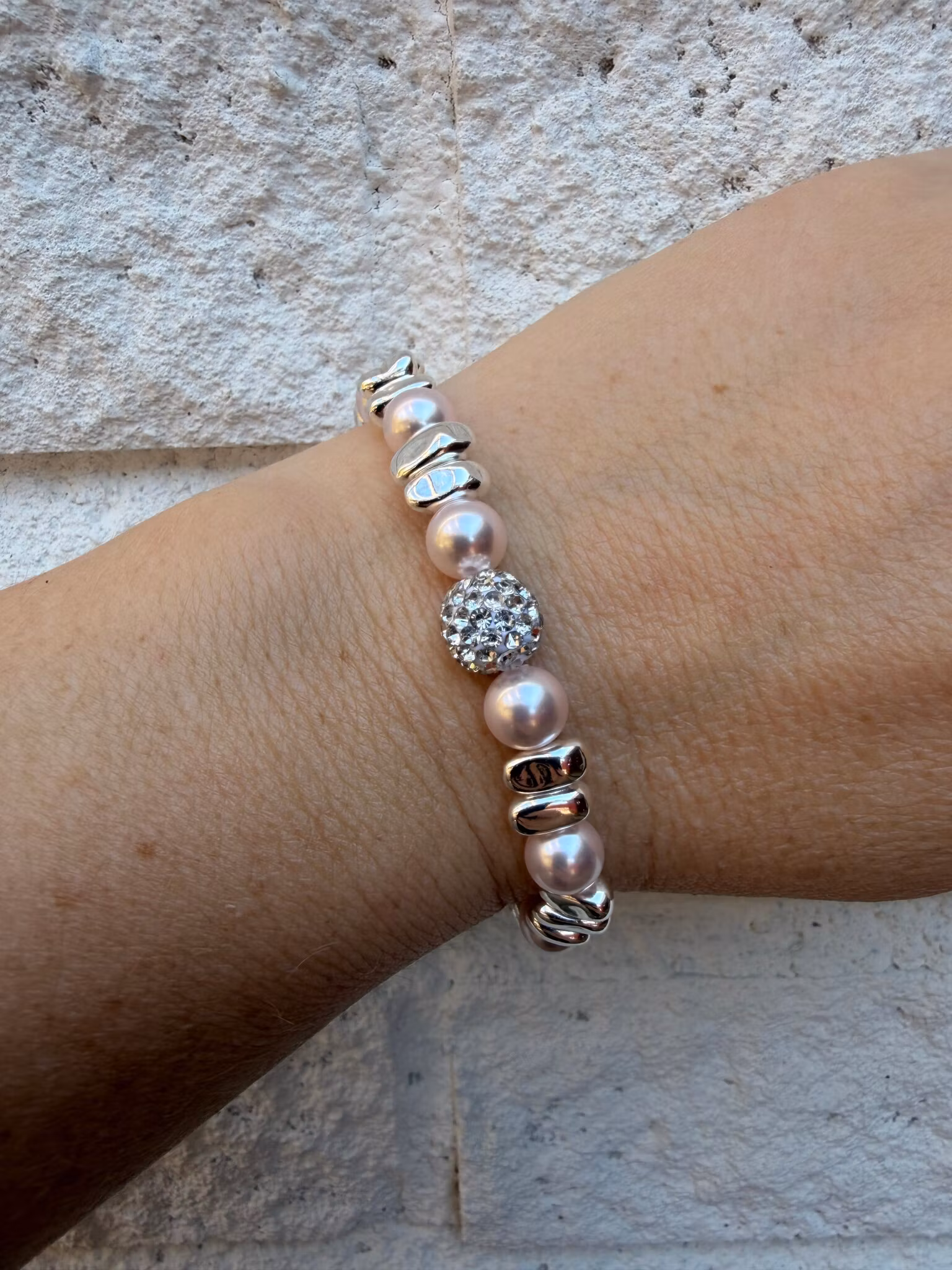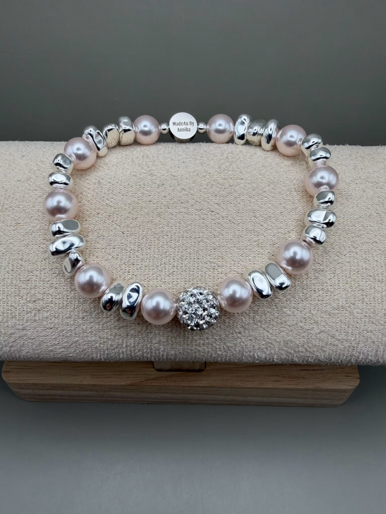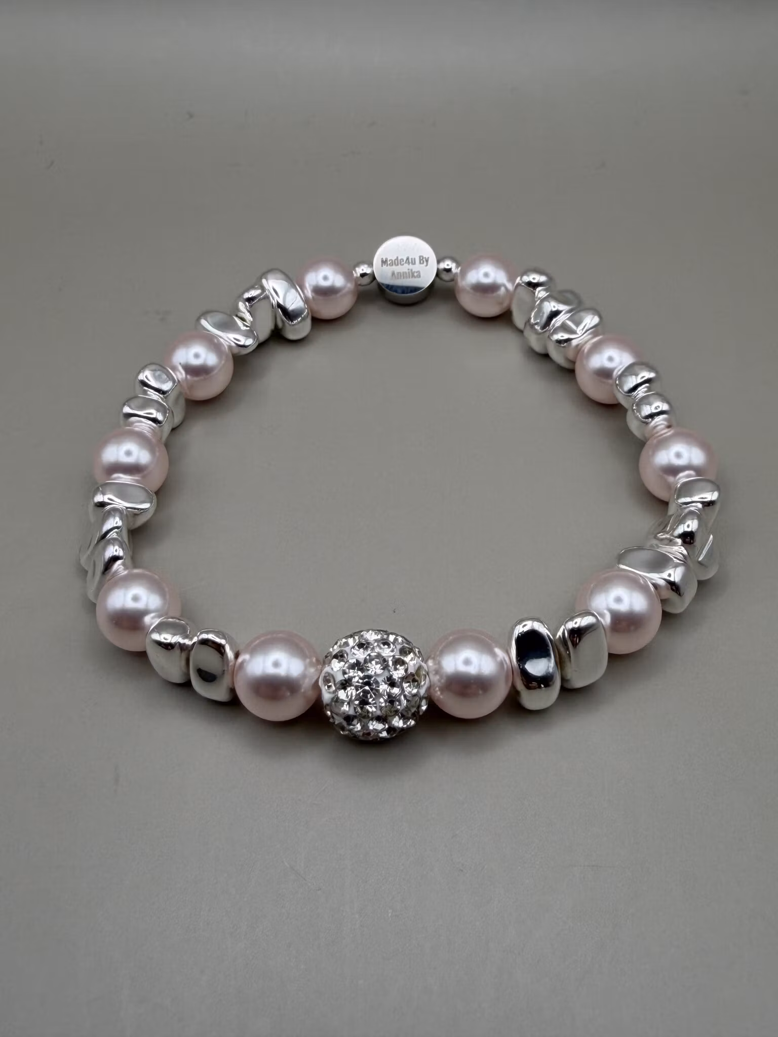 Ett elegant pärlarmband med stora ljusrosa vaxade glaspärlor, varvade i ett vackert mönster med oregelbundna silverfärgade hematitpärlor. I centrum sitter en gnistrande strassdetalj som fångar ljuset, och armbandet avslutas med min signaturpärla för en unik och exklusiv känsla.