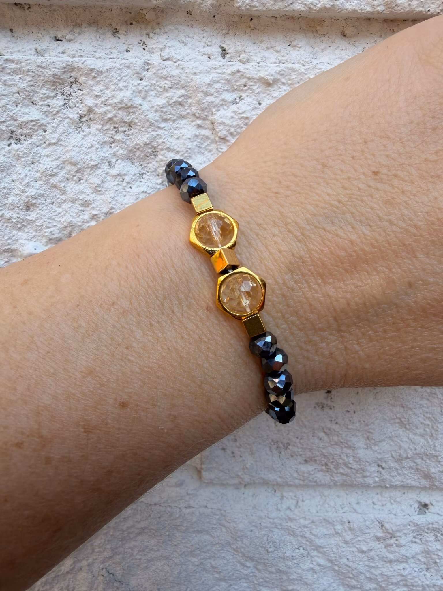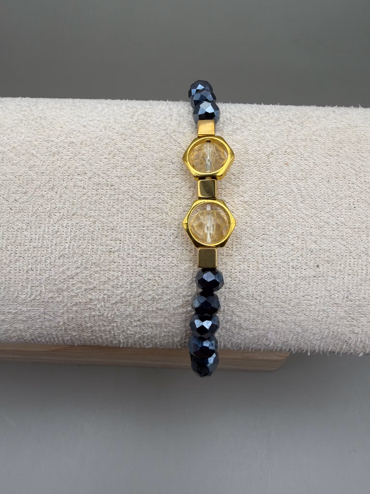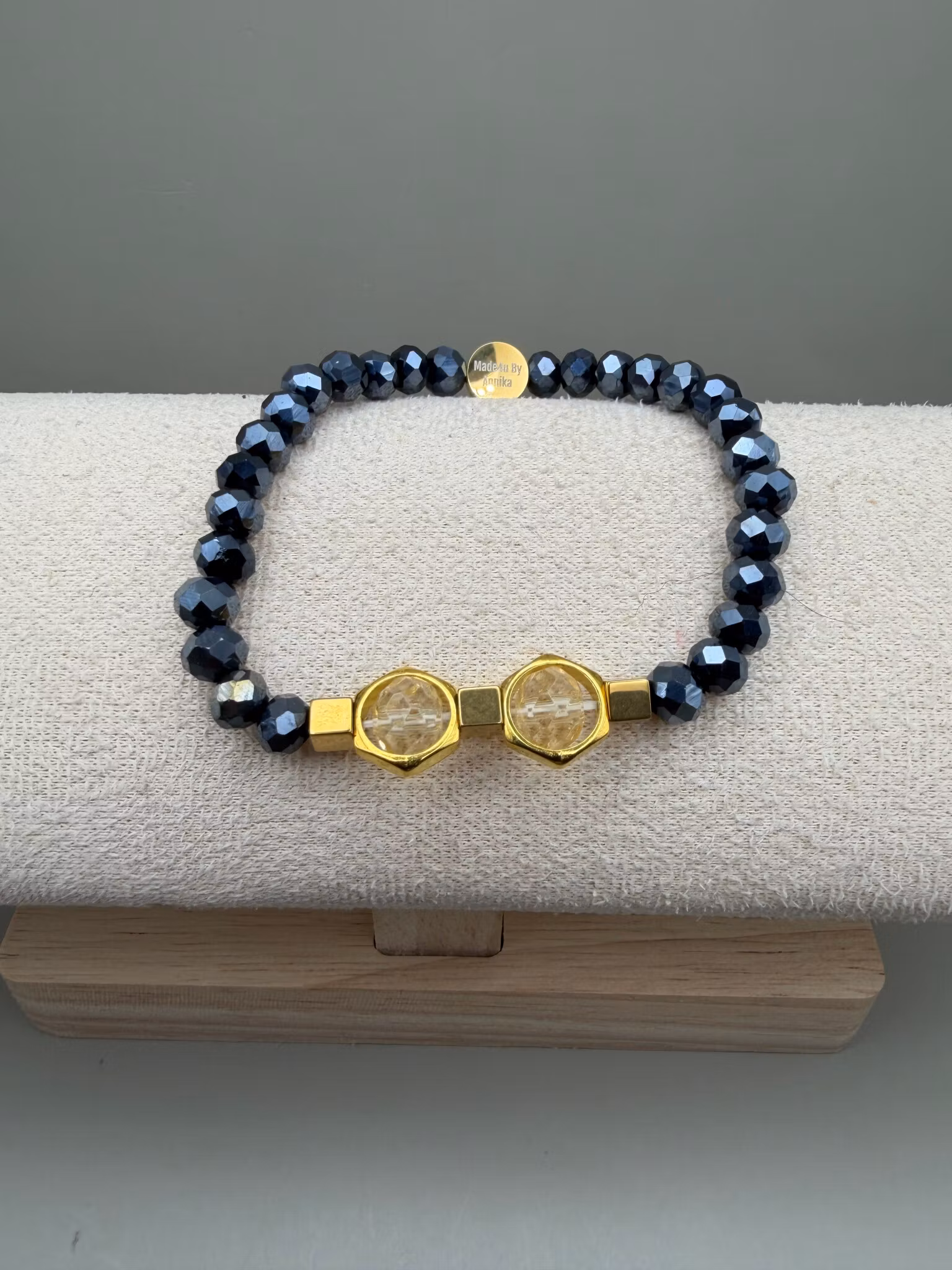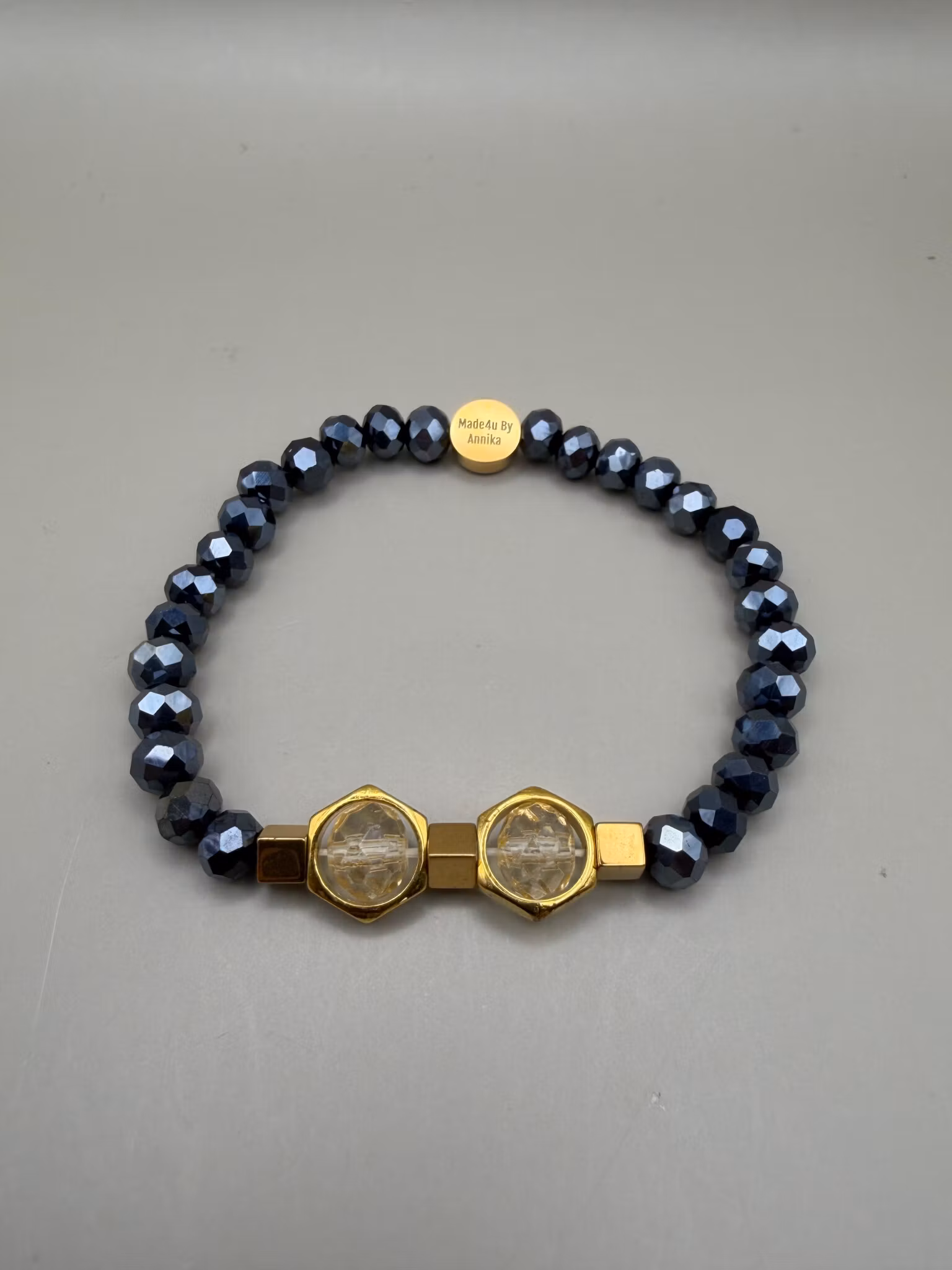 Ett elegant pärlarmband med mellanstora mörkblå facetterade glaskristallpärlor. I blickfånget finns fyrkantiga pärlor i rostfritt stål tillsammans med vackra sexkantiga ramar som omsluter beiga glaspärlor och skapar ett sofistikerat uttryck. Armbandet avslutas med min signaturpärla för en unik och exklusiv känsla.