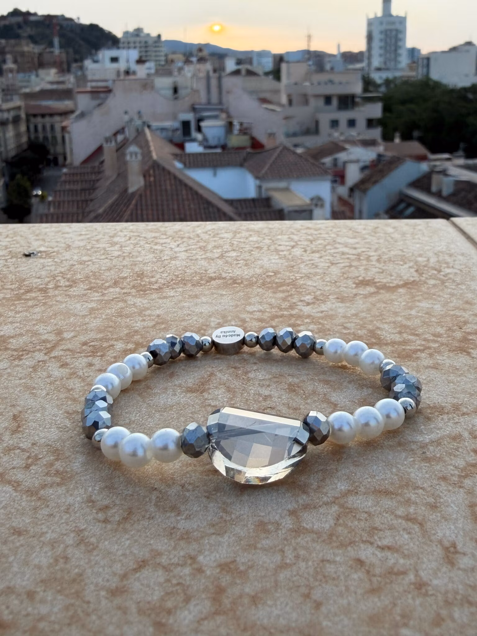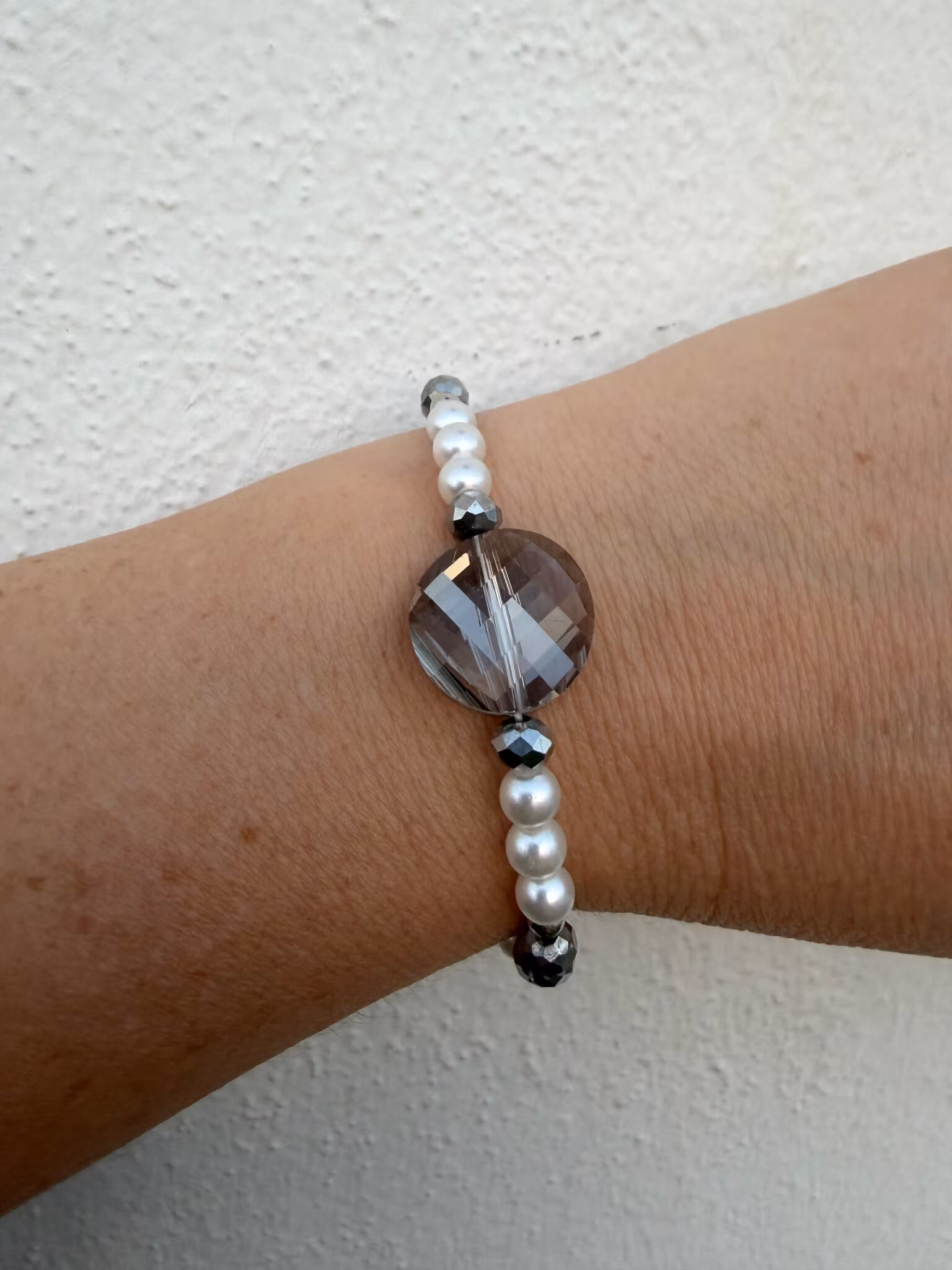 Ett vackert pärlarmband med ett fint och levande mönster av benvita pärlor och silverfärgade, facetterade glaskristallpärlor. Framtill pryds det av en stilren, större gnistrande grå facetterad glaspärla som ger en känsla av en elegant liten klocka på handleden. Designen avslutas med min signaturpärla – en unik och personlig touch.