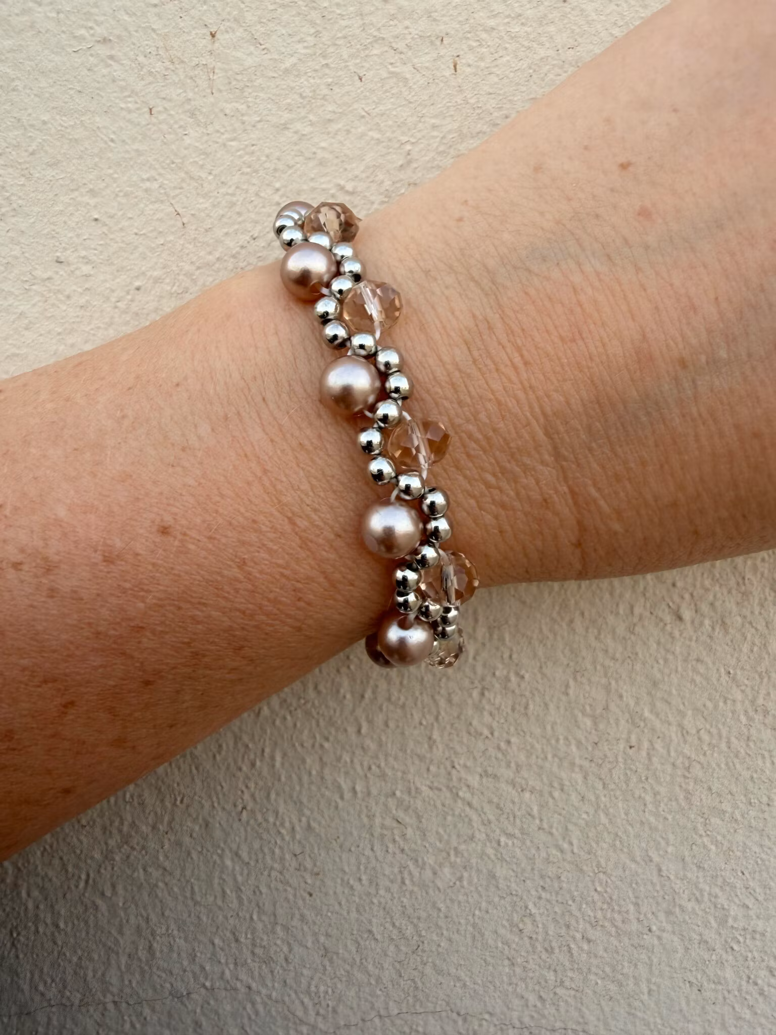 Ett elegant, brett pärlarmband med ett harmoniskt mönster av mjukt beiga pärlor, champagnefärgade facetterade glaskristallpärlor och små silverfärgade detaljer. I designen döljer sig även min signaturpärla – en unik och personlig detalj som gör smycket extra speciellt.