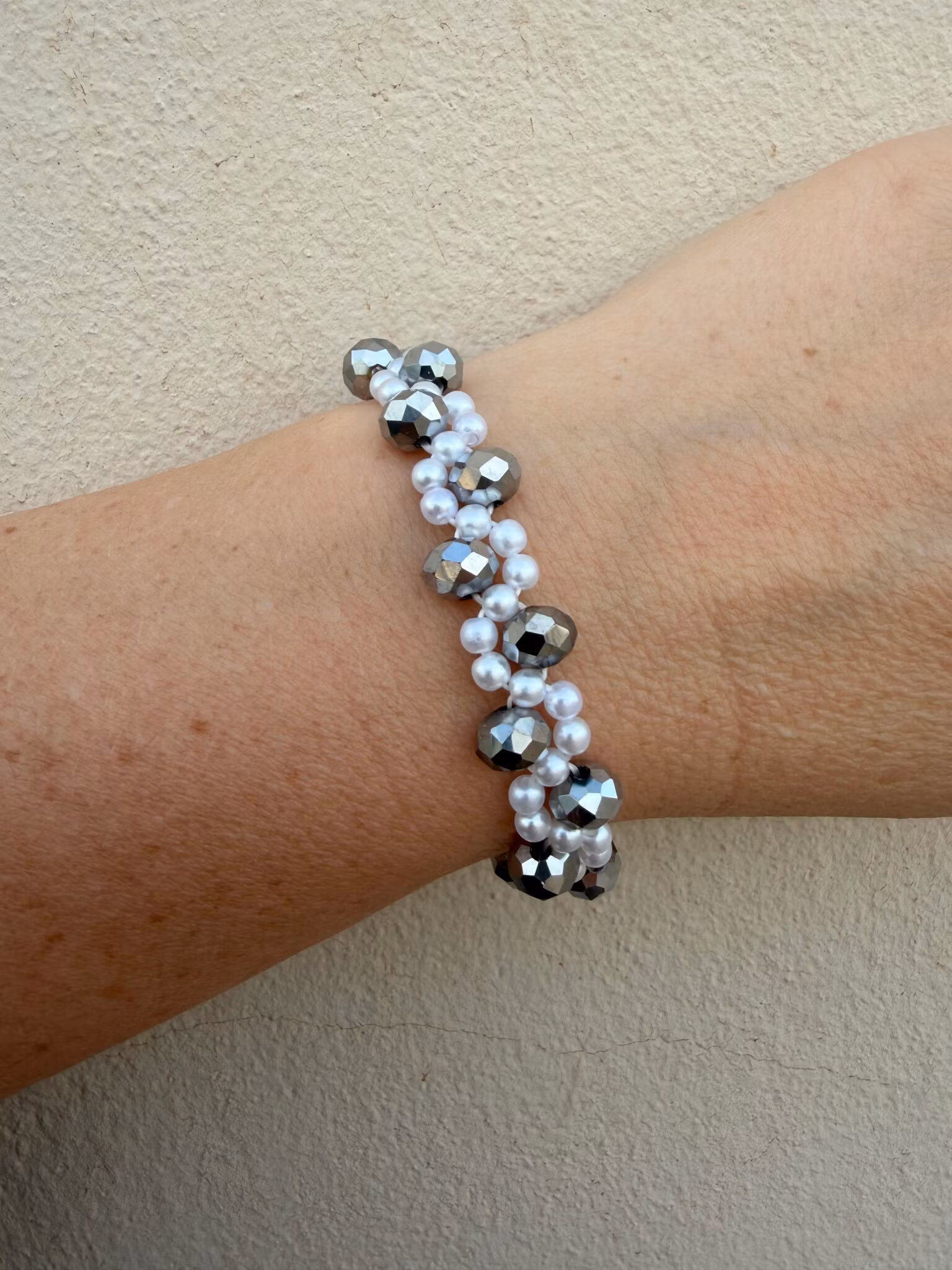 Ett elegant, brett pärlarmband med ett harmoniskt mönster av mjukt små vita pärlor och silverfärgade facetterade glaskristallpärlor. I designen döljer sig även
