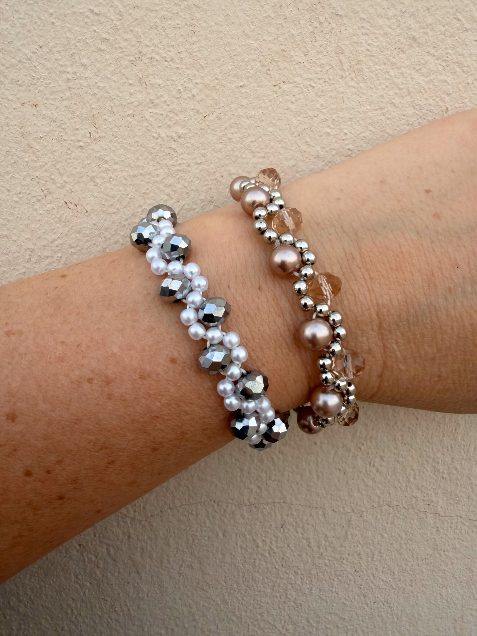 Ett elegant, brett pärlarmband med ett harmoniskt mönster av mjukt små vita pärlor och silverfärgade facetterade glaskristallpärlor. I designen döljer sig även min signaturpärla – en unik och personlig detalj som gör smycket extra speciellt.