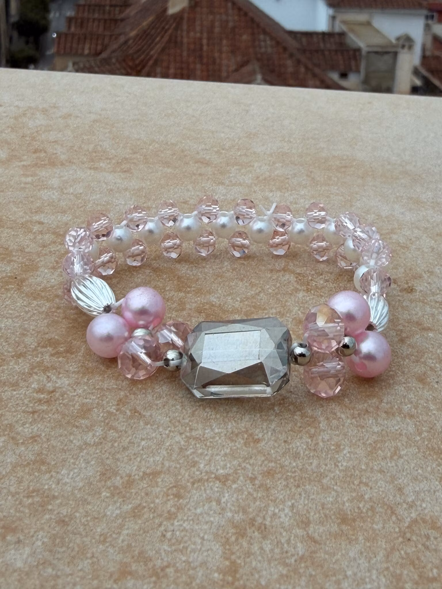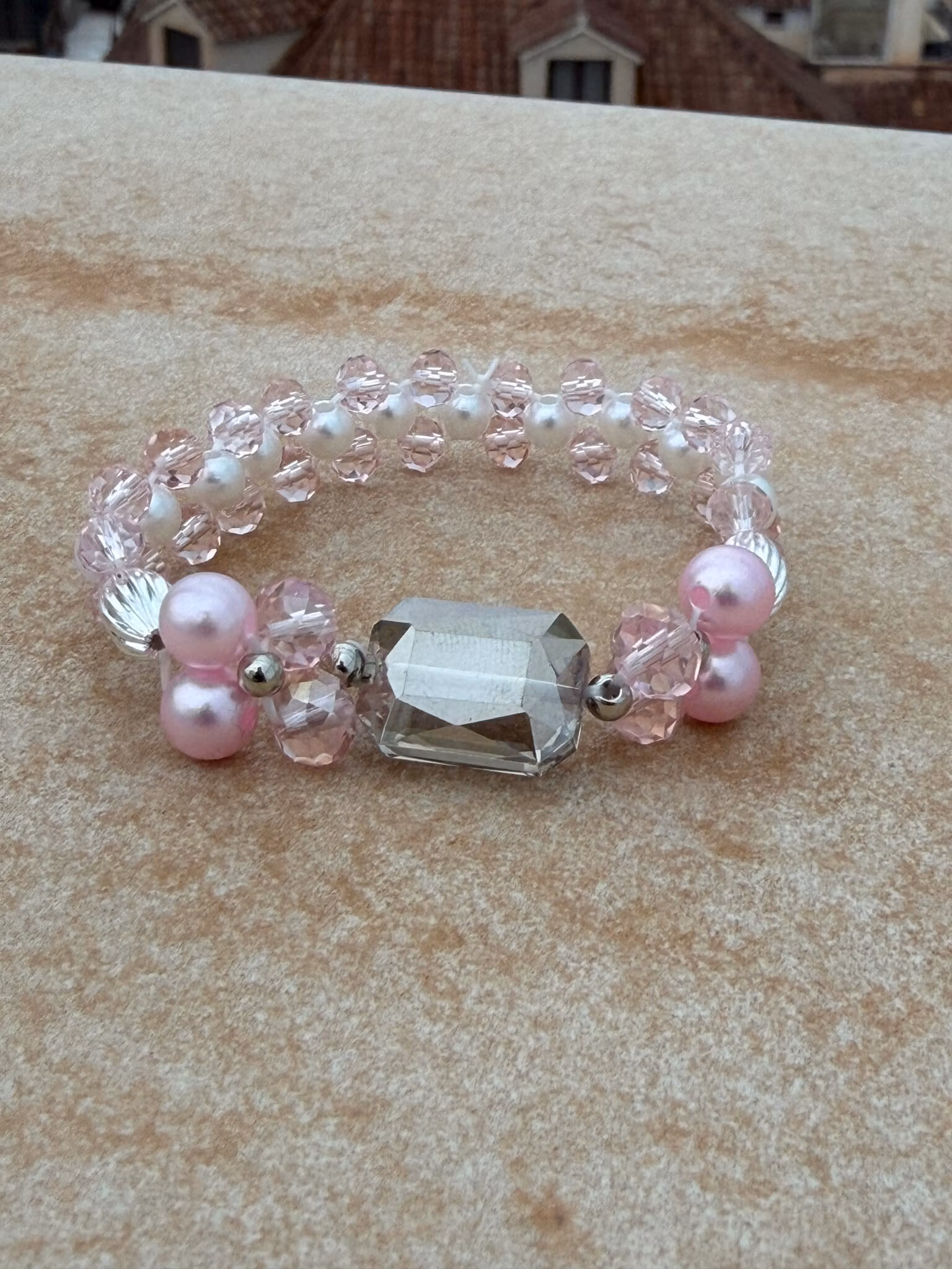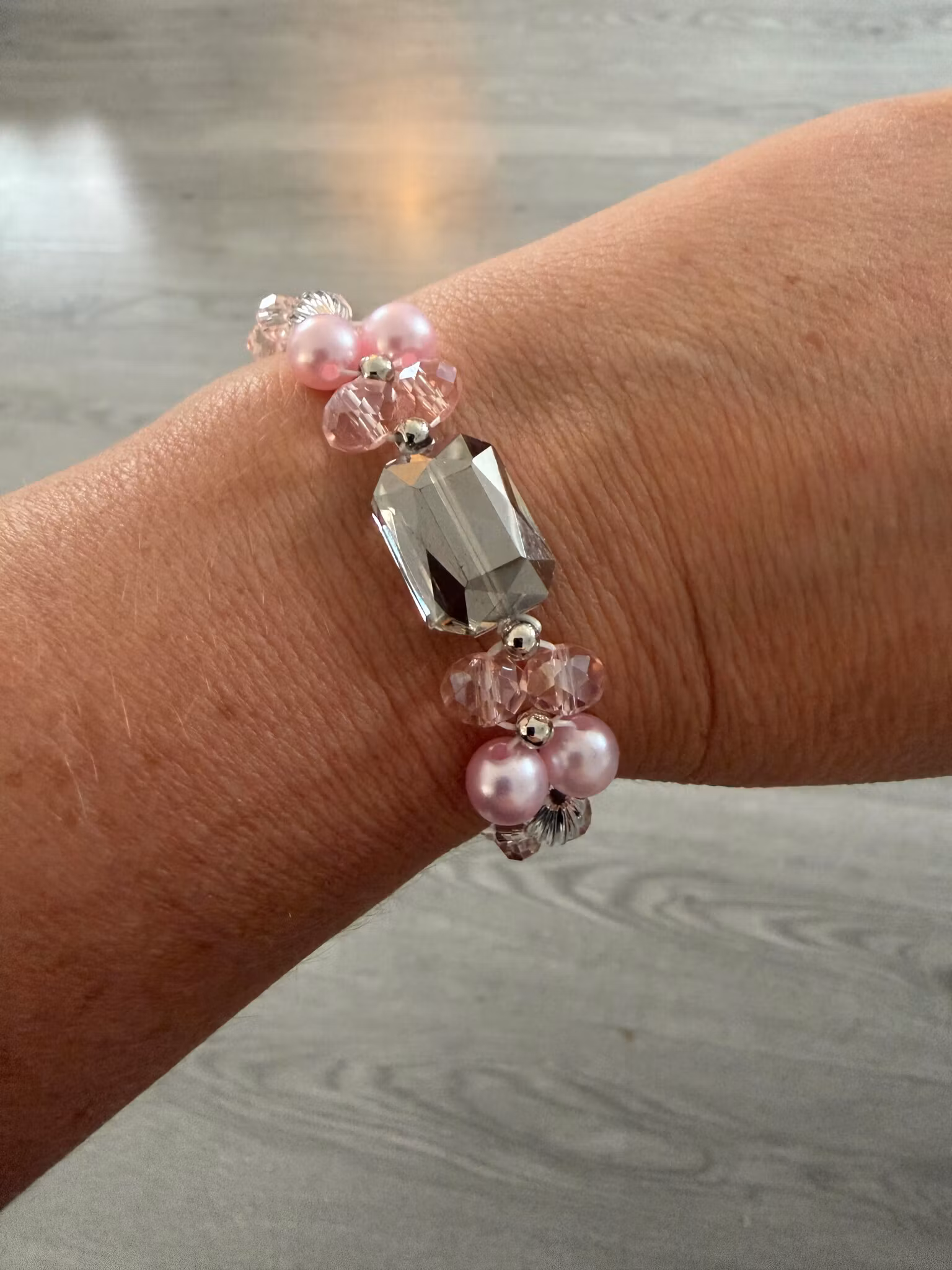 Ett lekfullt och elegant brett armband som fångar blicken direkt. De stora ljusrosa, runda pärlorna kombineras med skimrande glaspärlor i samma mjuka ton. I centrum står en större fyrkantig glaspärla som ger smycket dess unika och uttrycksfulla karaktär. Runtom varvas ljusrosa glaskristallpärlor med små vita runda pärlor, vilket skapar en harmonisk balans och ett mjukt, feminint helhetsintryck.